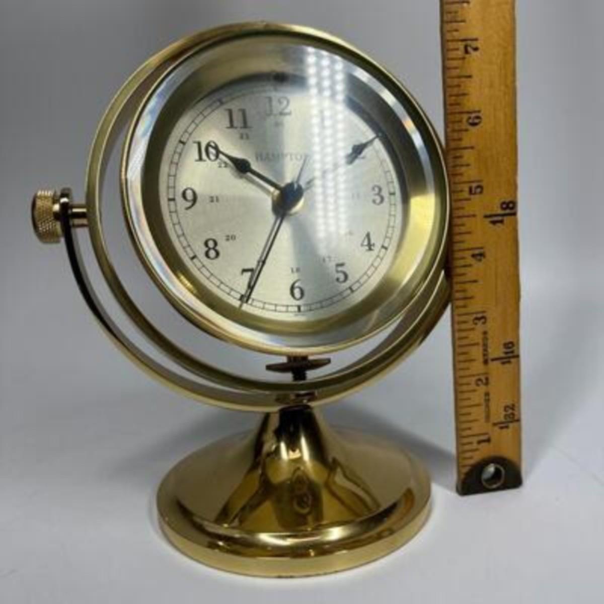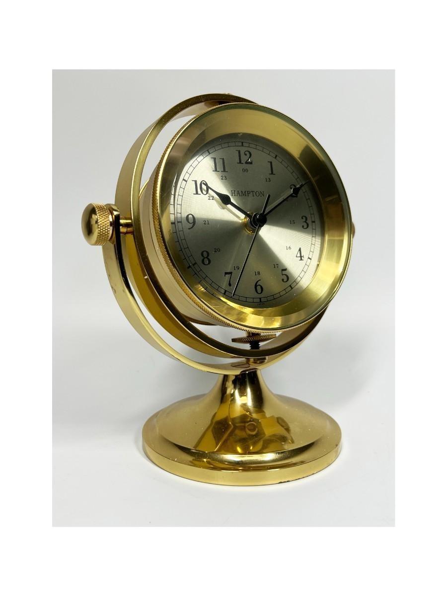 Schooner Hampton Rotating Brass Nautical Desk Ship Clock, there is no signifncant damage to the brass or protective glass and is in good displayable condition. The clock is not running, check pictures for more details and for sizing.