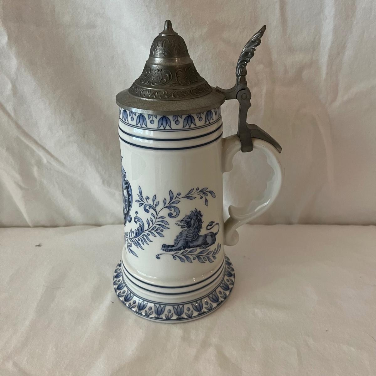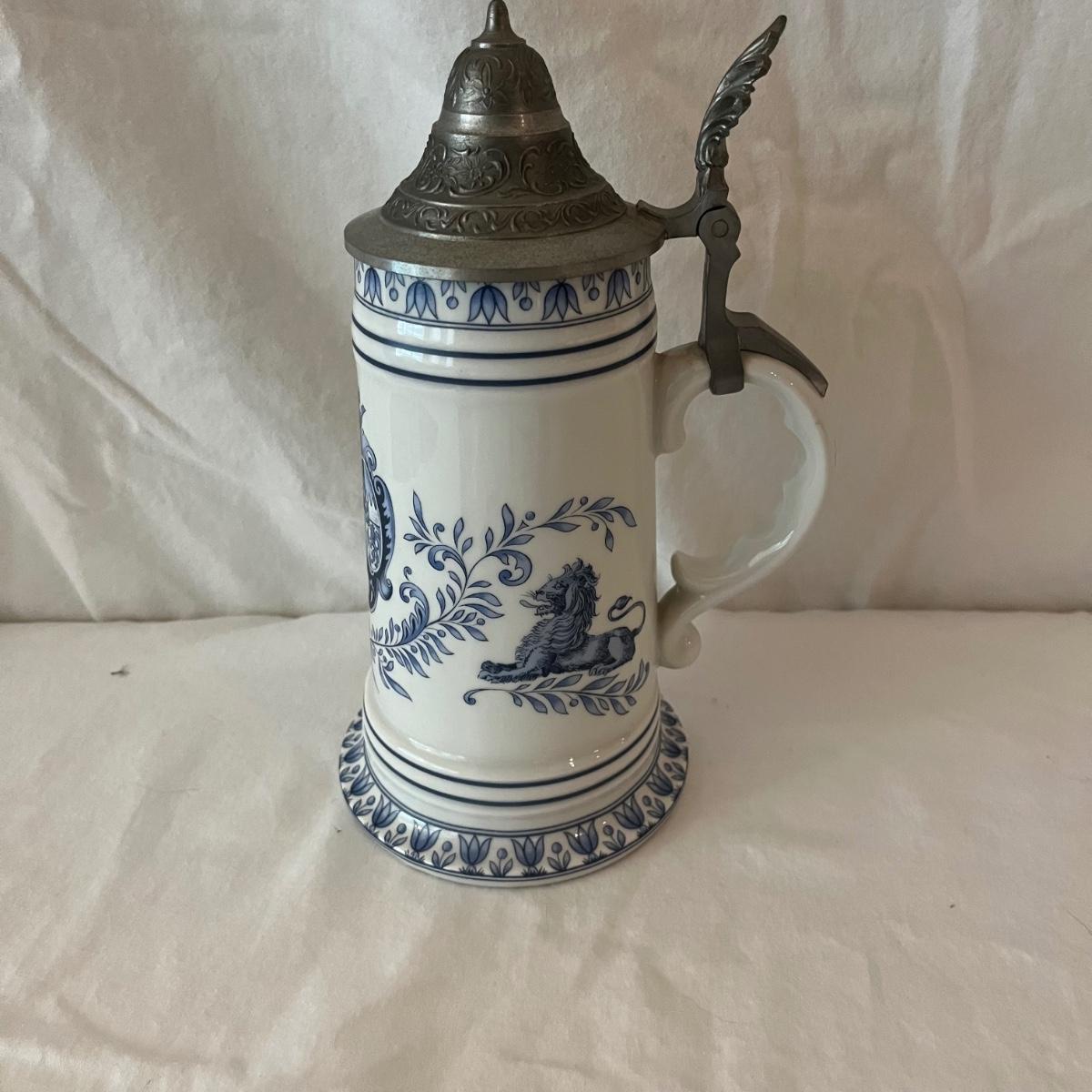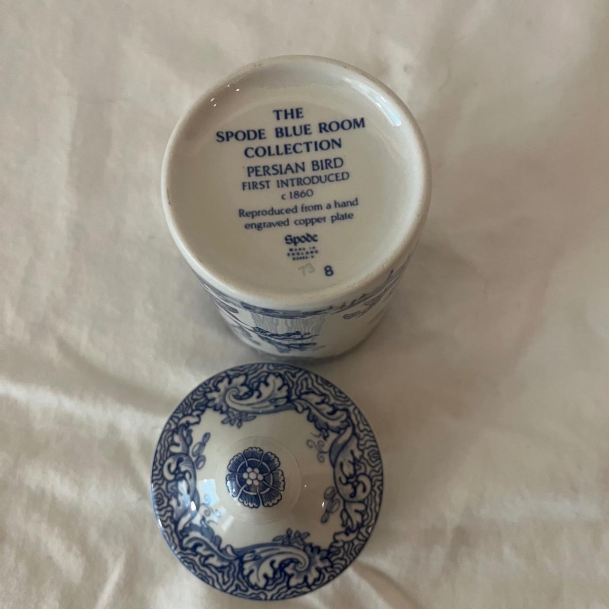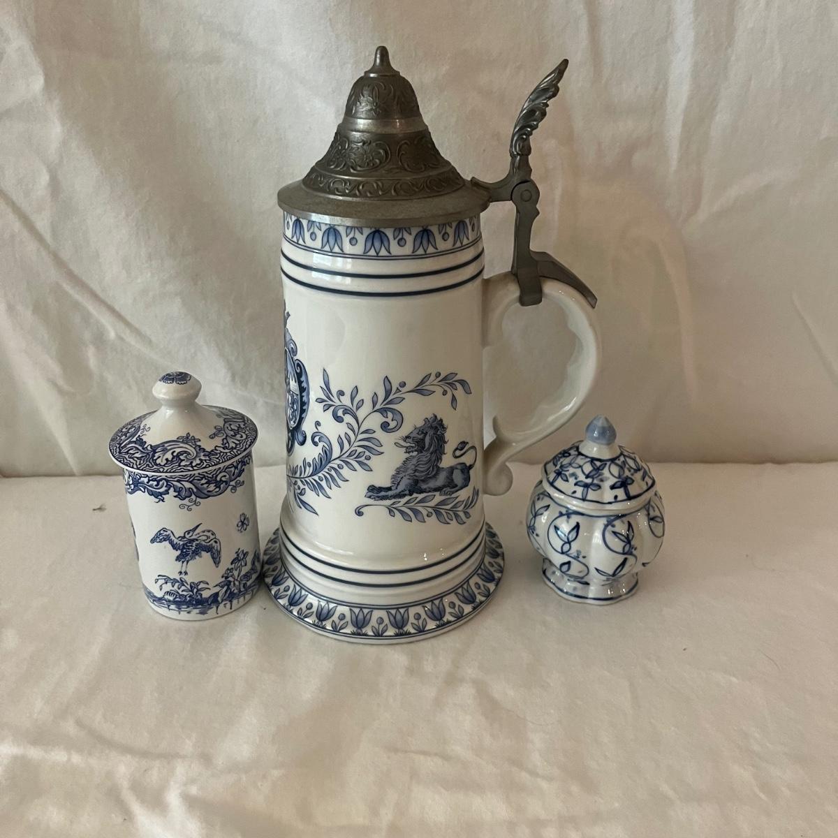 Lot includes a Schrobenhausen tankard, The Spode Blue Room Collection Persian bird lidded Jar and a lidded jar that is marked made in Thailand. Tankard measures 4.5”D (base) x 9”H.