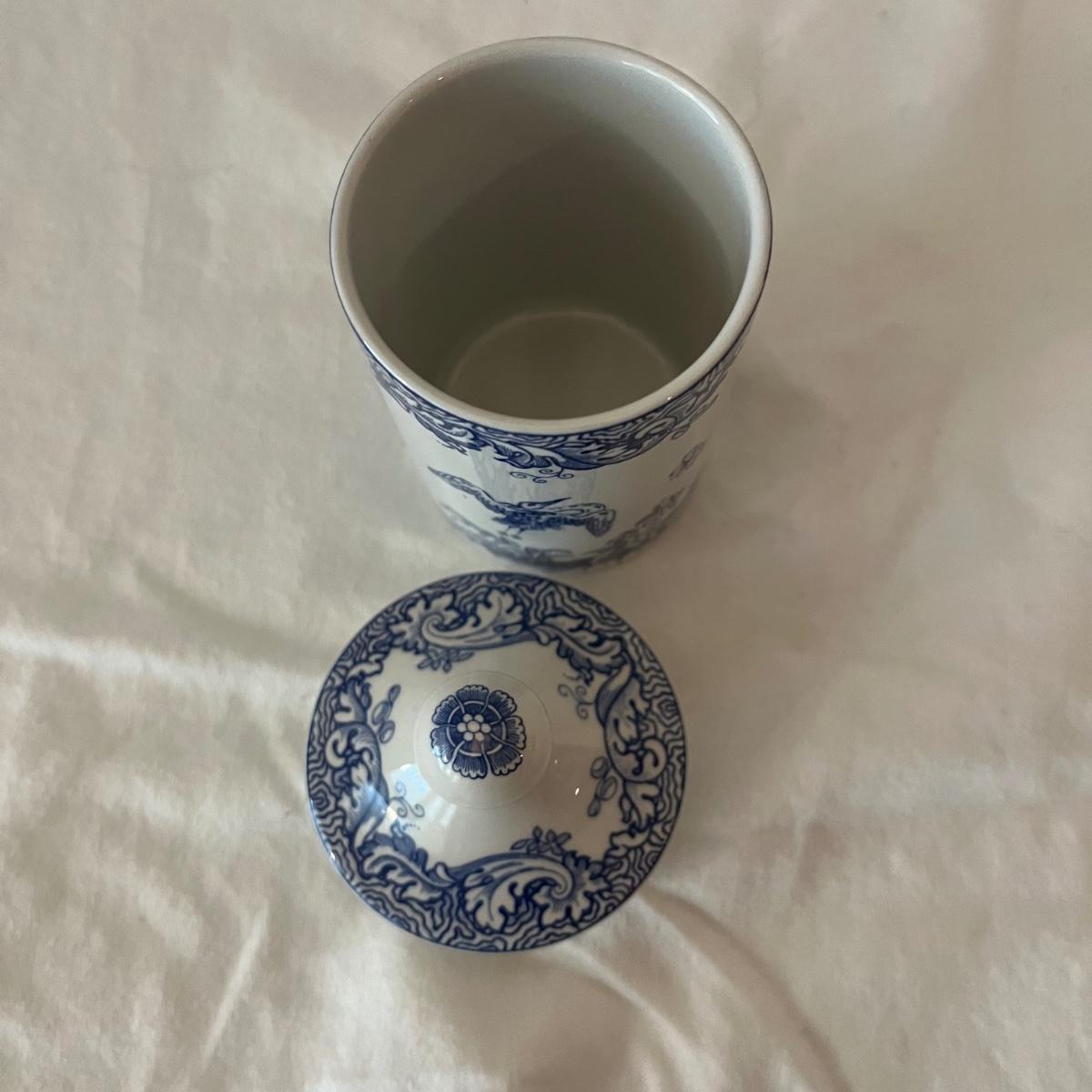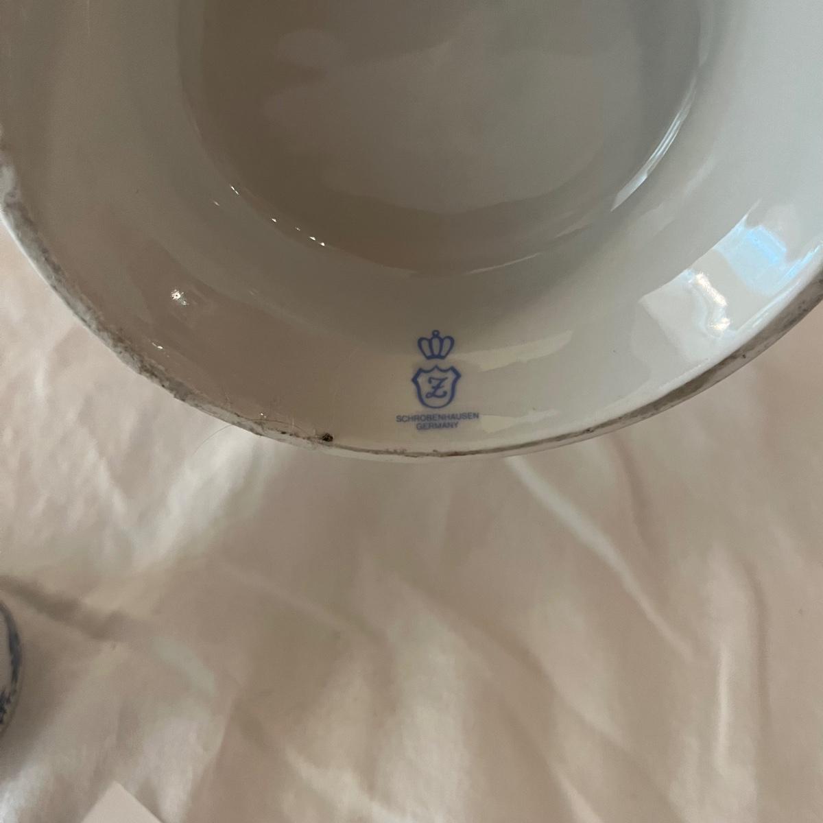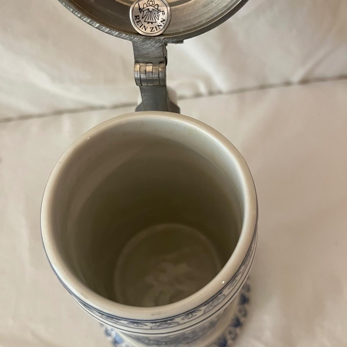 Lot includes a Schrobenhausen tankard, The Spode Blue Room Collection Persian bird lidded Jar and a lidded jar that is marked made in Thailand. Tankard measures 4.5”D (base) x 9”H.