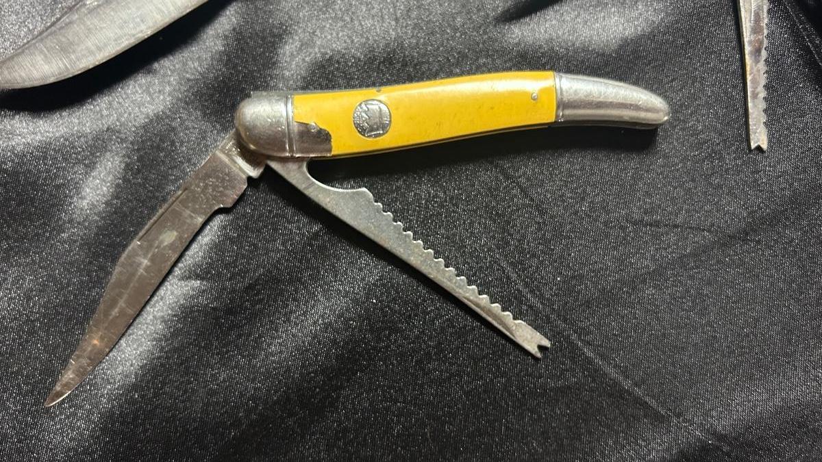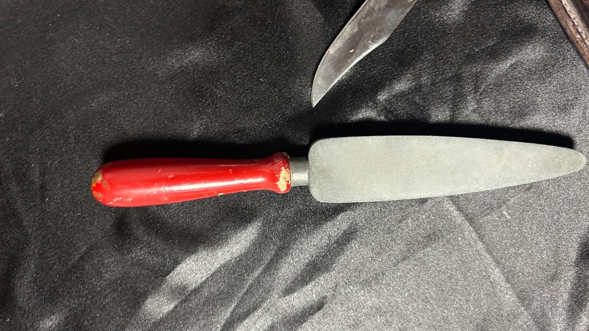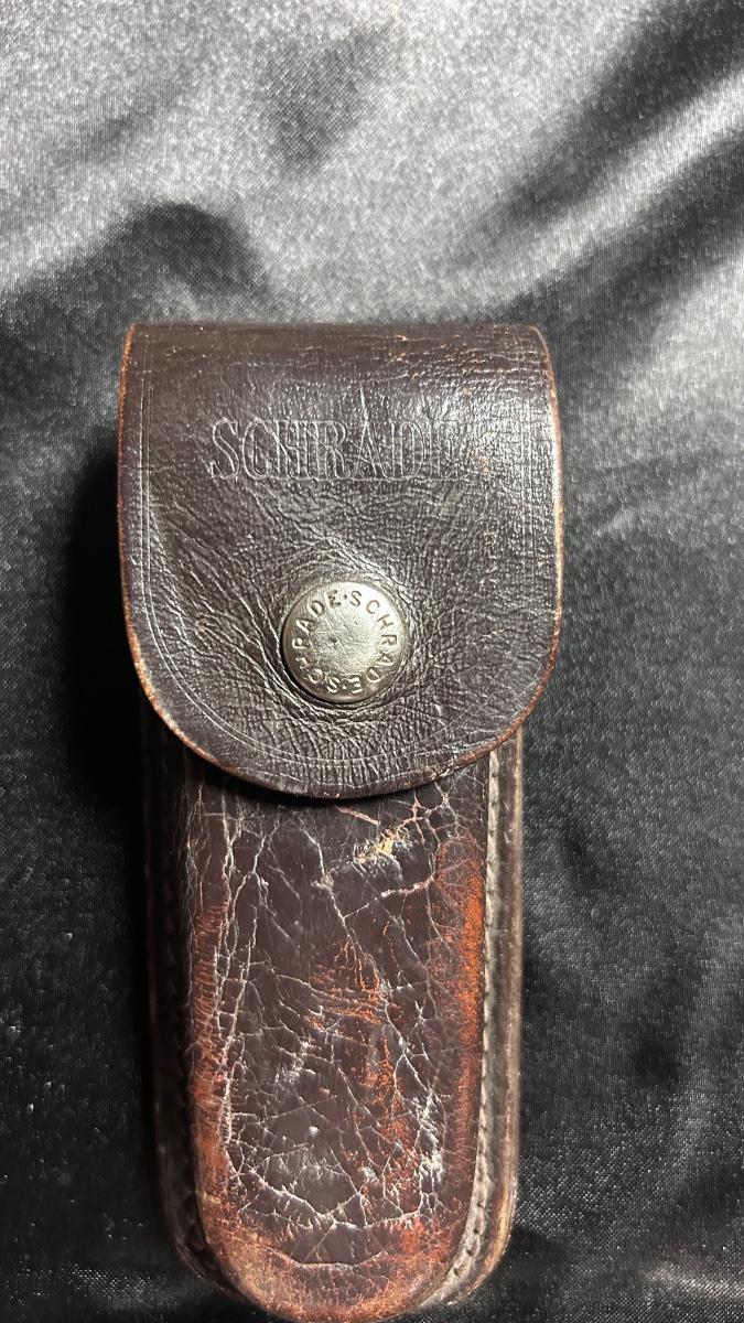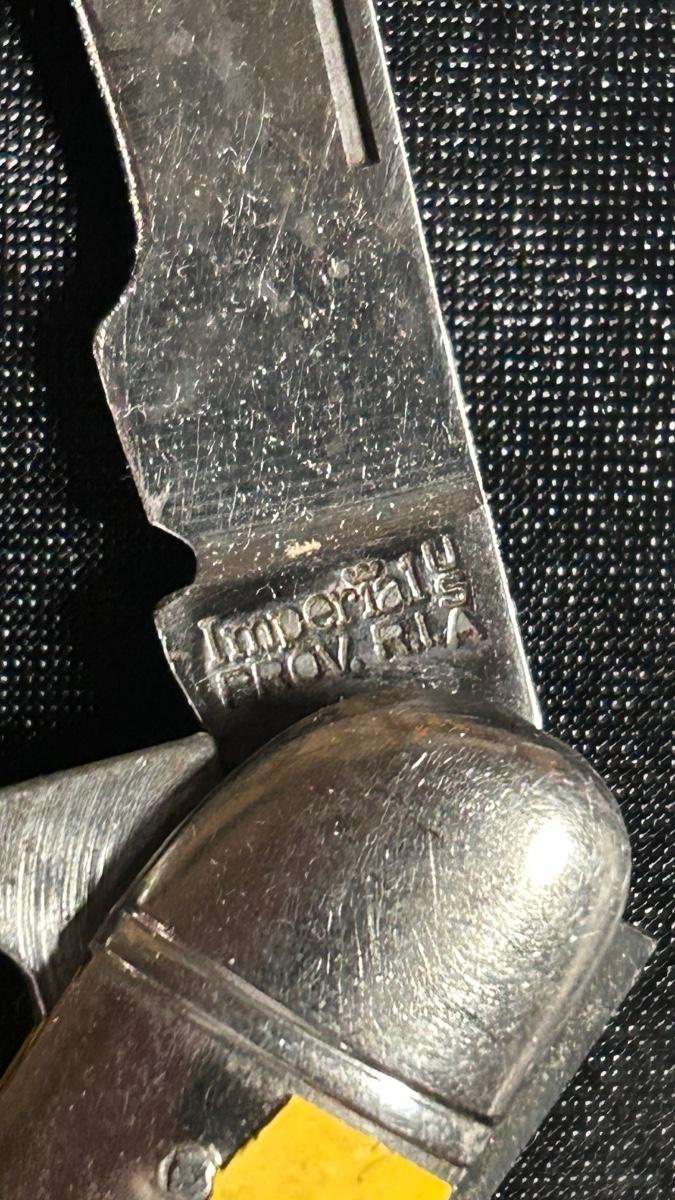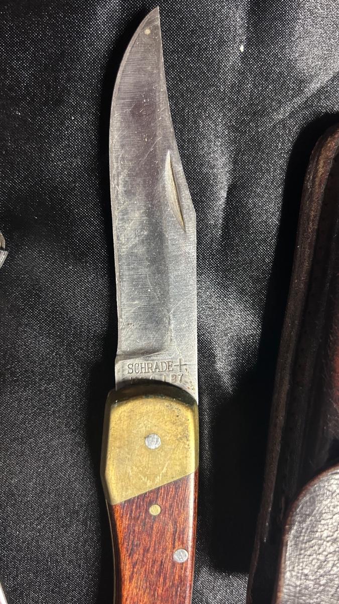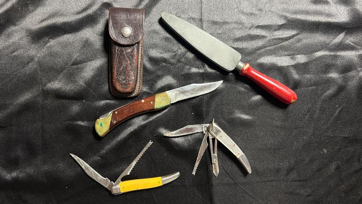 SCHRADER FOLDING KNIFE W/SHEATH, IMPERIAL POCKET KNIFE W/SAW & UNKNOWN BRAND KNIFE AND SHARPENING STONE