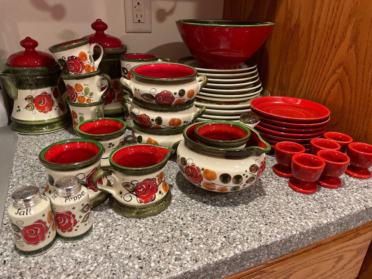 5 dinner plates, 7 smaller salad plates, 7 dessert plates, 6 egg cups, 4 different size bowls, 3 soup bowls, coffee pot, tea pot, soup pot, salt n pepper shakers, and other accessories.