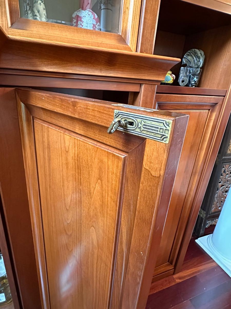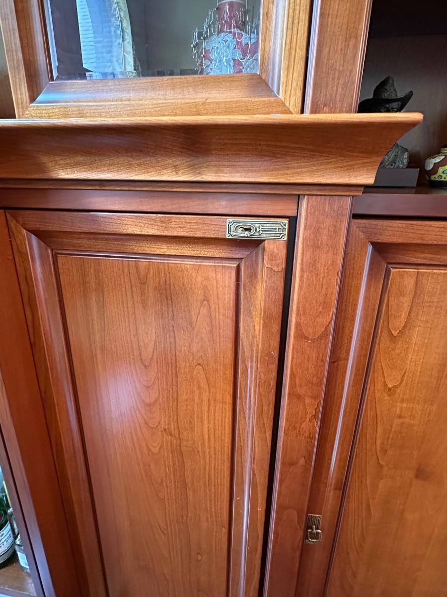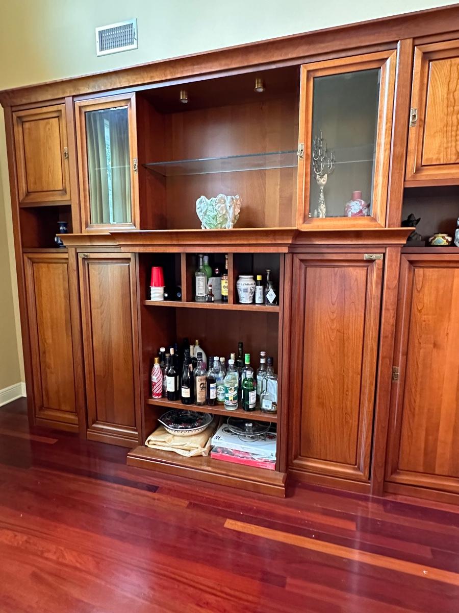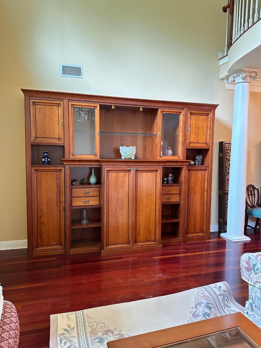 Purchased in Germany ~ 4 Pieces ~ Heavy ~ Beautiful ~ Has a mixture of red brown tones ~ Lighted ~ Center storage has doors that swing in both directions to create two different looks. Doors have 2 locks for locking in both directions. This client is using the center for storing liquor. ~ Glass and wood shelves are not adjustable ~