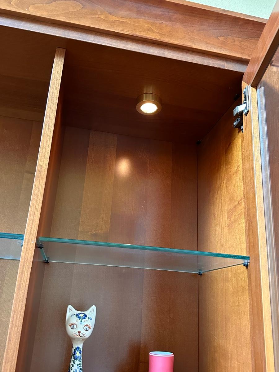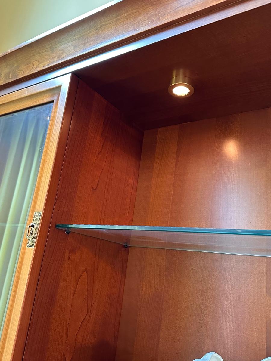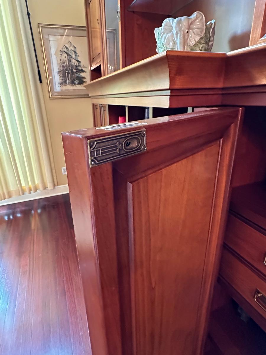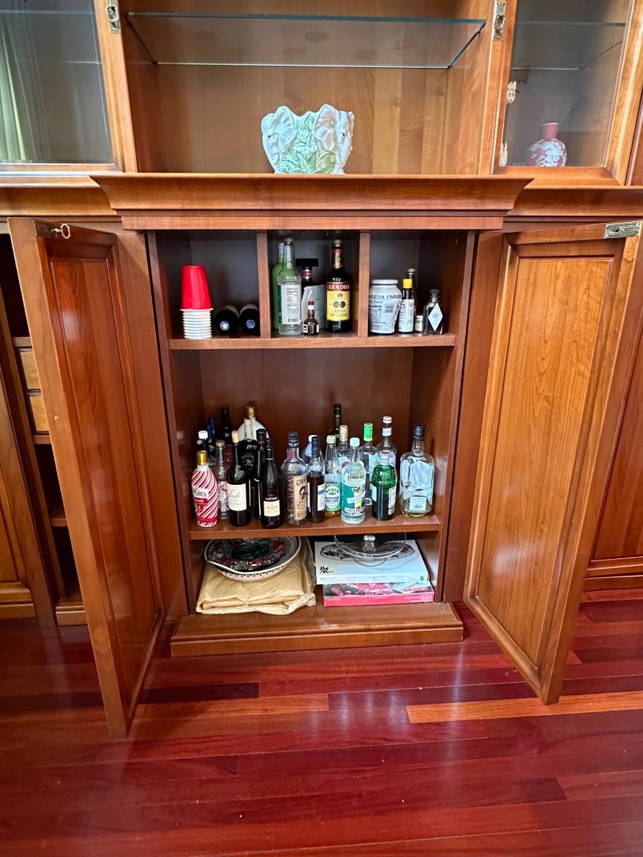 Purchased in Germany ~ 4 Pieces ~ Heavy ~ Beautiful ~ Has a mixture of red brown tones ~ Lighted ~ Center storage has doors that swing in both directions to create two different looks. Doors have 2 locks for locking in both directions. This client is using the center for storing liquor. ~ Glass and wood shelves are not adjustable ~