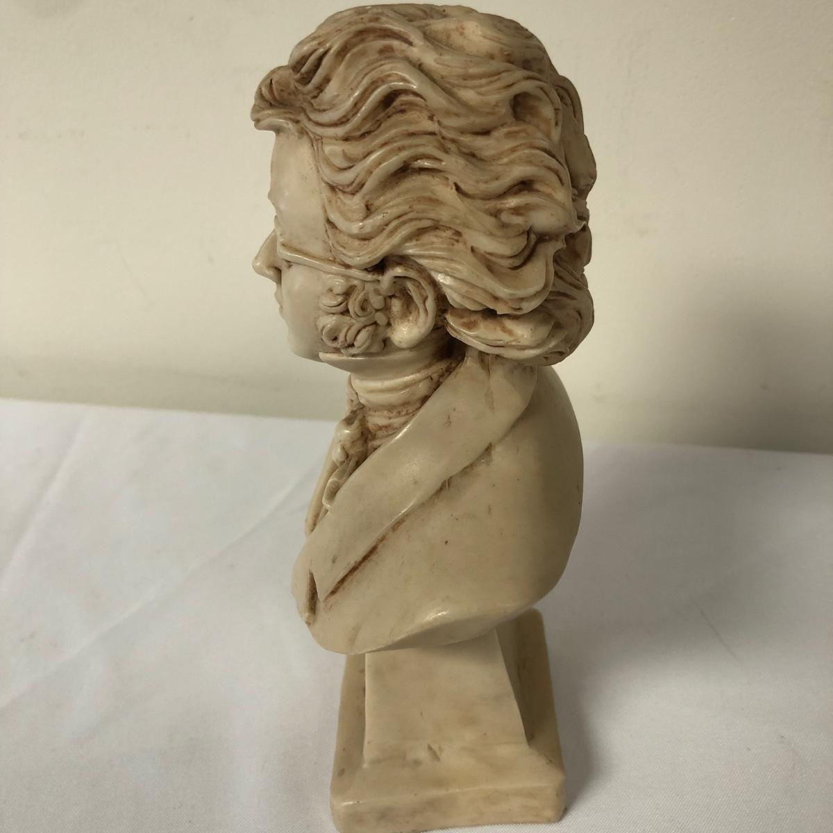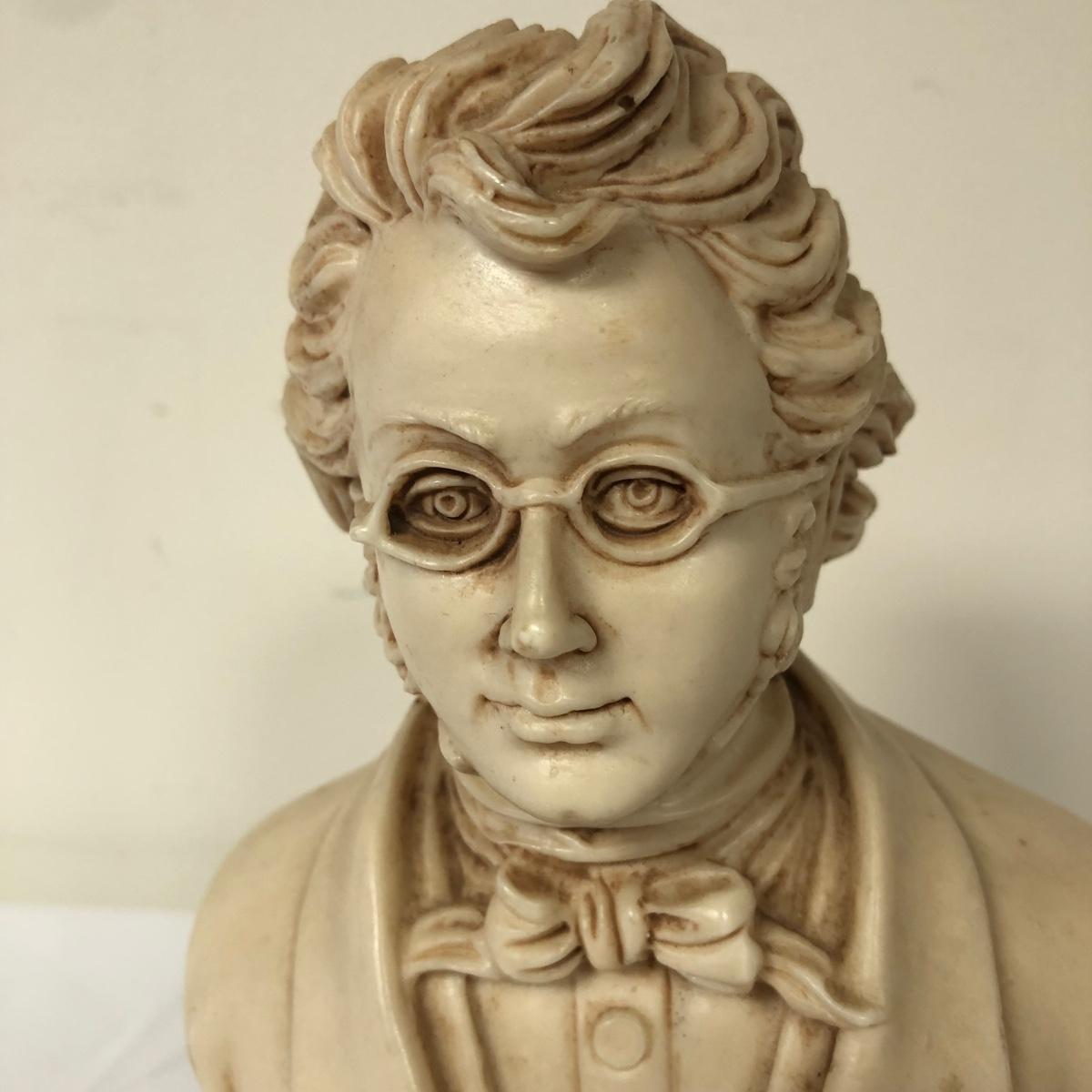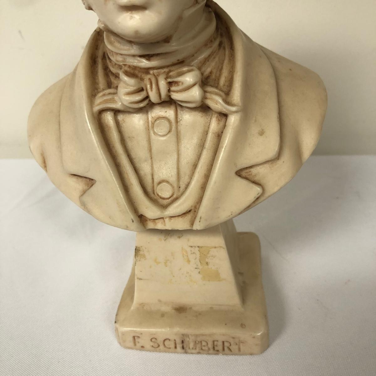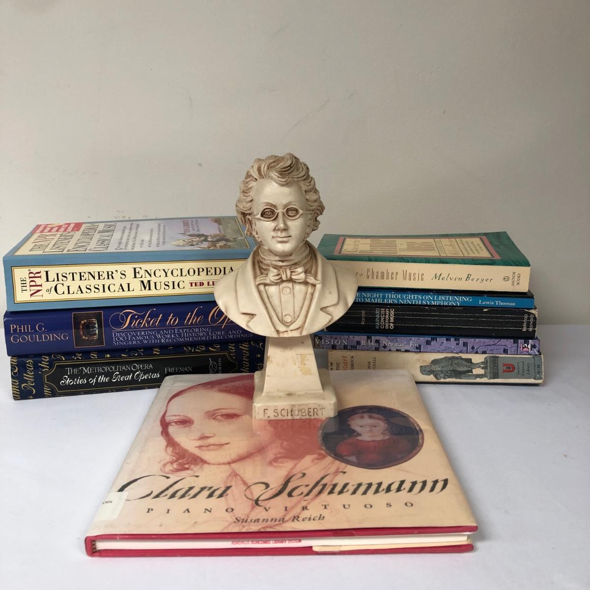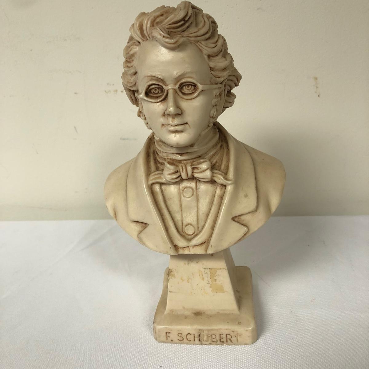 This lot includes nine books (four are hard back) and a bust of Schubert. The bust is signed and appears to be made of a heavy resin. It measures almost 5” wide (at shoulders) and stands 8.5” tall. Shipping Available.