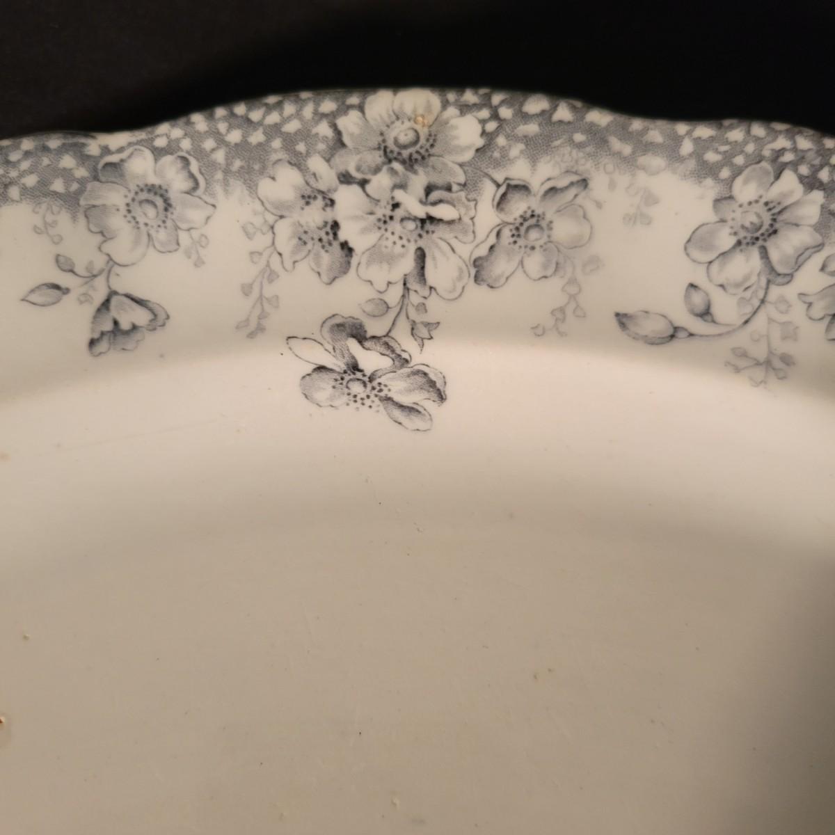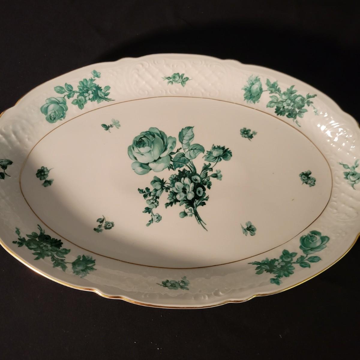 A pair of China platters in good condition with some minor blemishes. One platter, manufactured by Schumann, features a rose floral pattern in green and measures approximately 16" x 10.5" x 2". The other platter was manufactured by C.M. & Co and has a delicate floral pattern around its outer edge in a gray color. It measures approximately 14" x 11" x 1". Shipping available