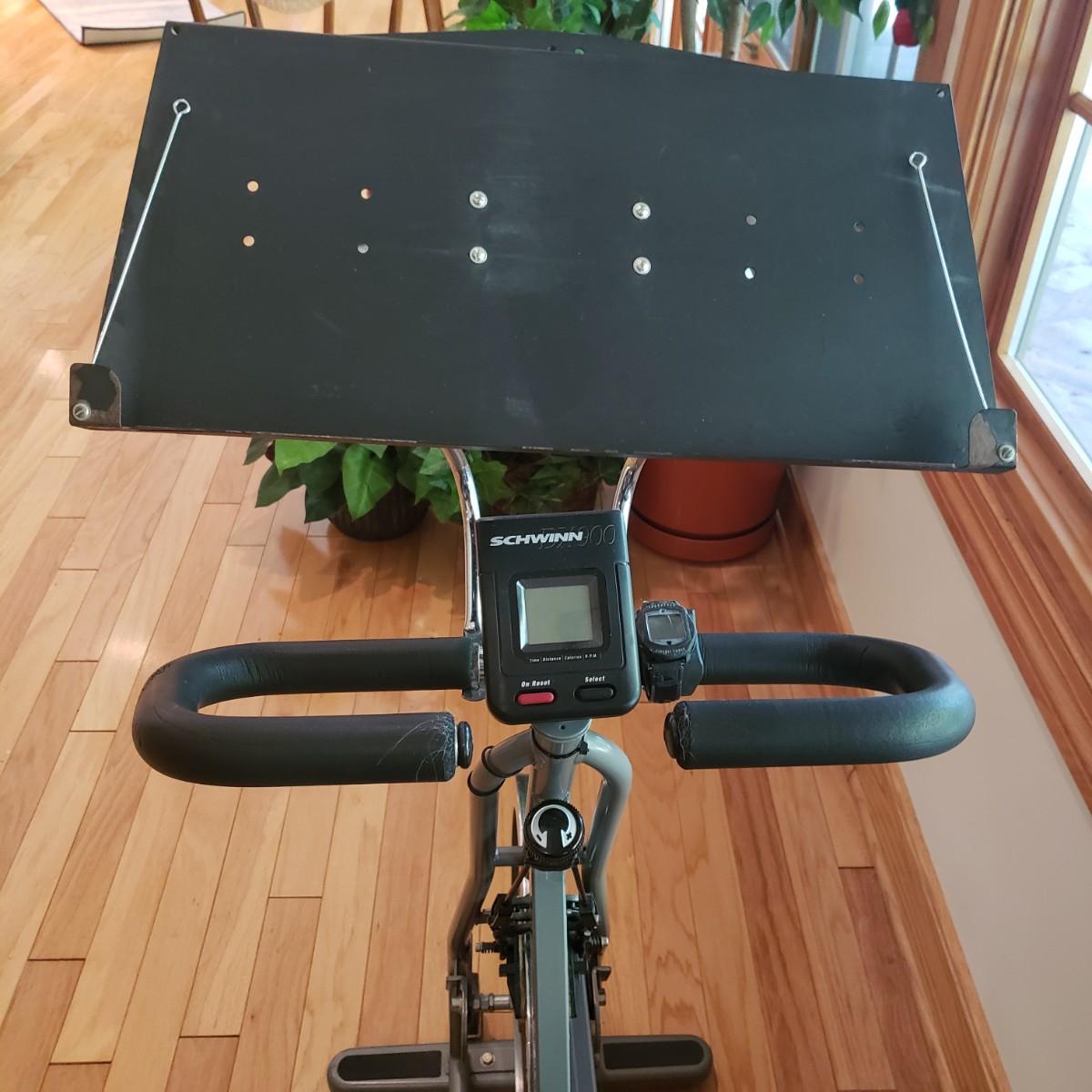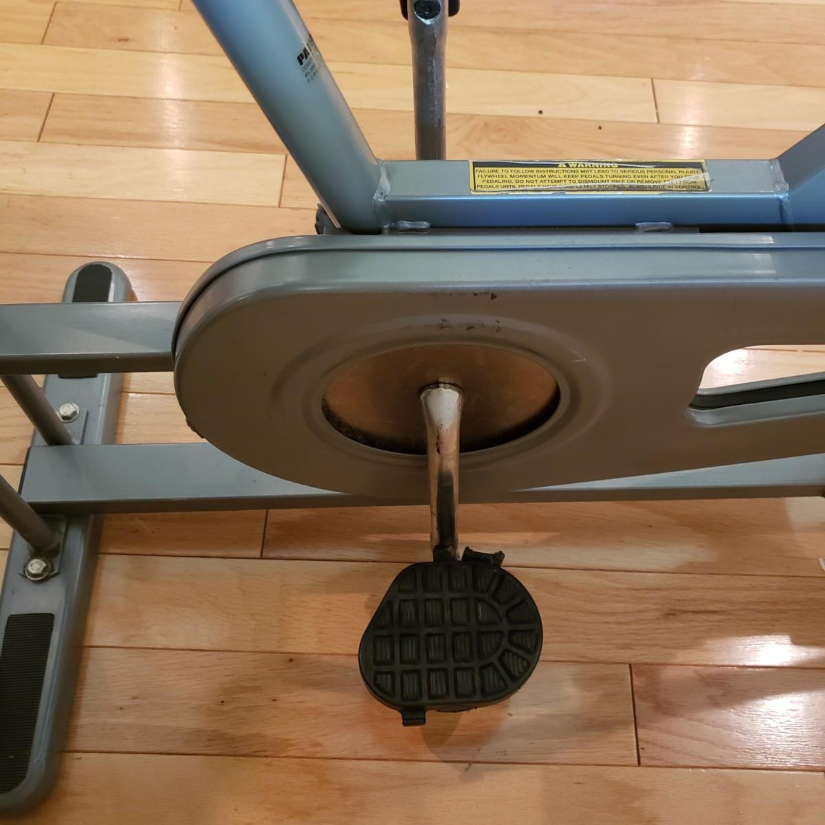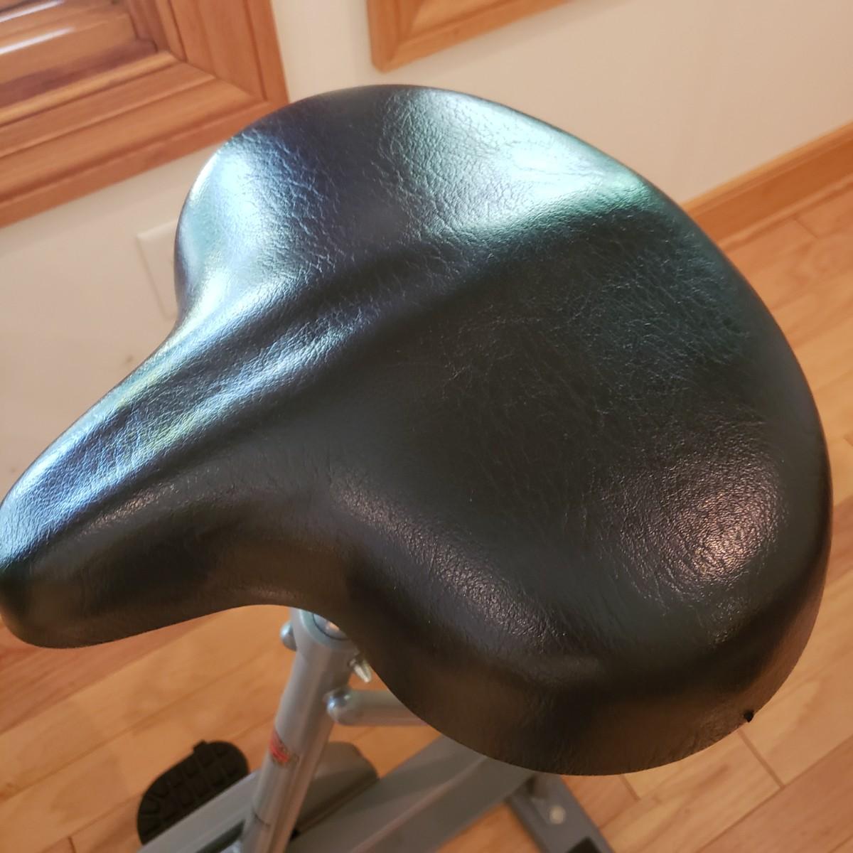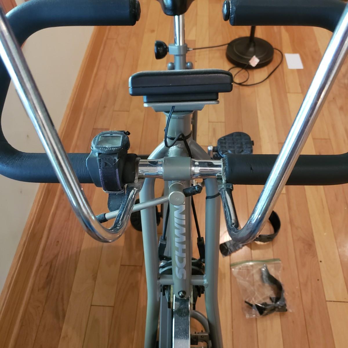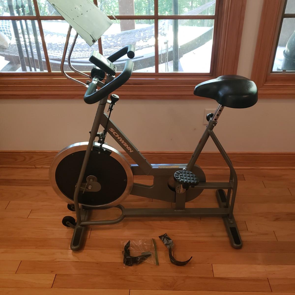 This Schwinn DX900 indoor cycle has an adjustable seat height, adjustable padded handle bars, a pedal resistance knob and an on-board computer. The computer for time, distance, calories and R.P.M. does not currently power on when the button is pushed. There are screw holes in the back of the computer, likely for battery replacement. There is a watch on the handle bar that also does not currently power on, but attaches to a removable clip for your own watch! There is also an added stand on the handle bars, for holding a book or your phone. The pedal straps have broken, which is in the baggie and next to the baggie in the picture. This equipment can move easily when tipped onto the two front wheels. The bike measures 43" x 20" x 50"H.