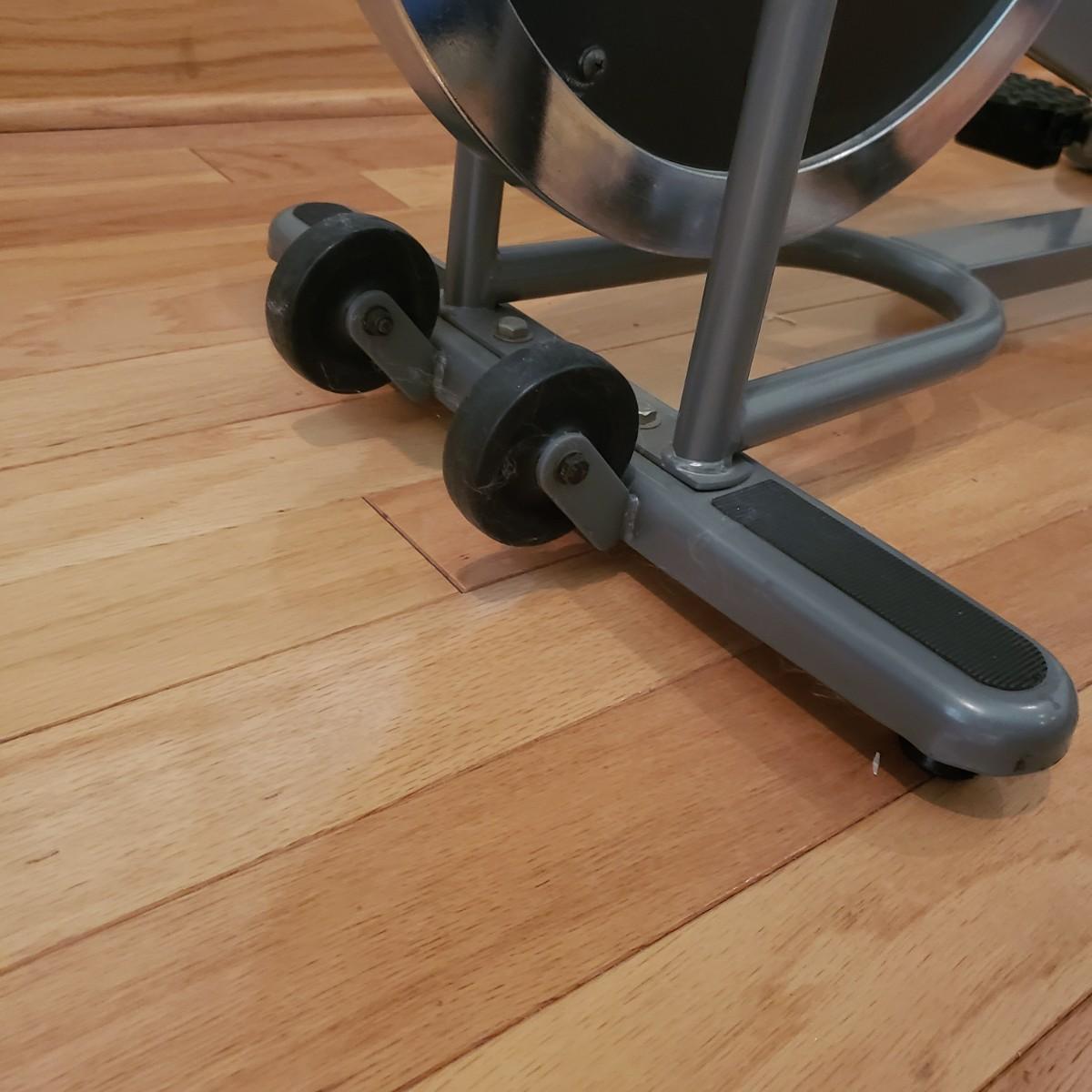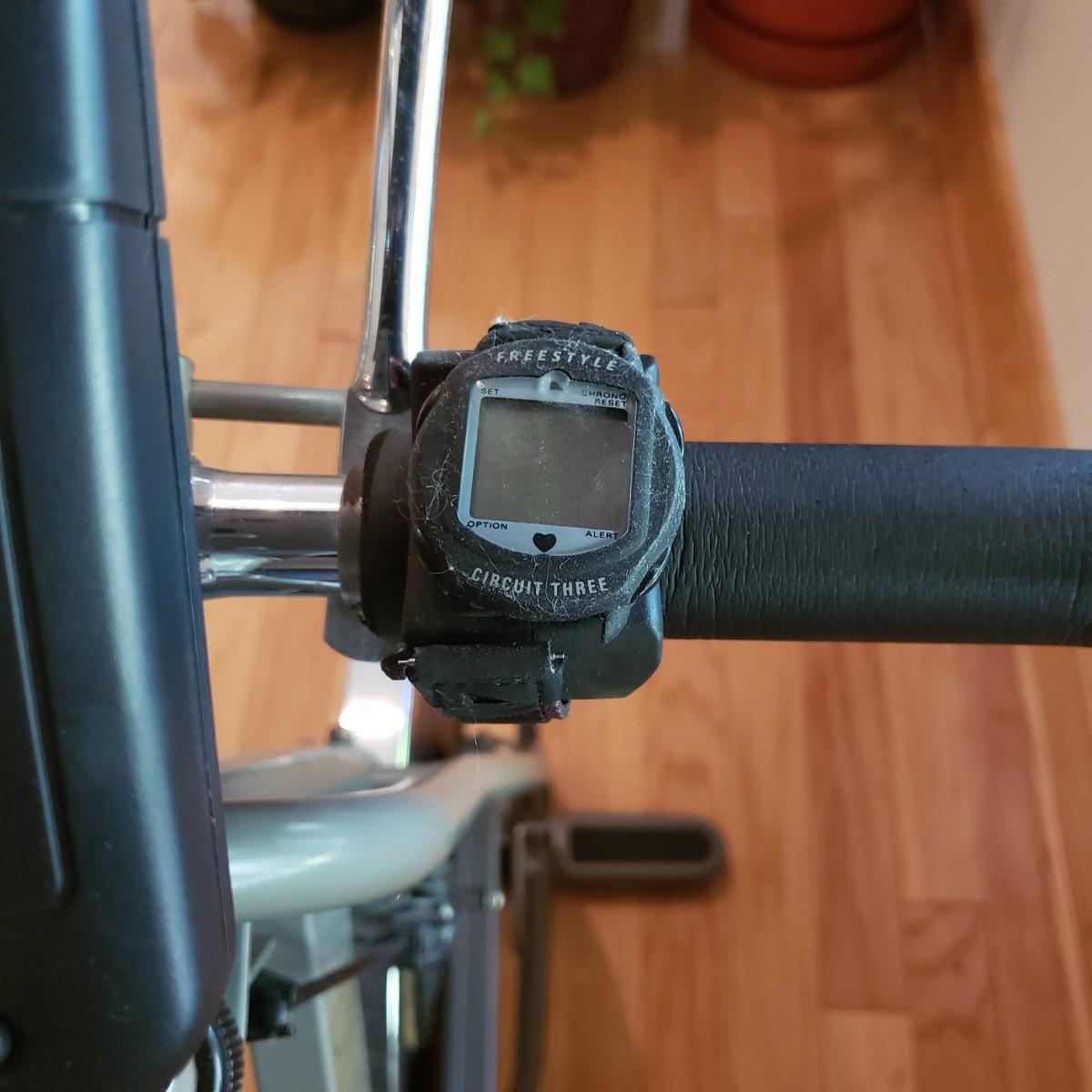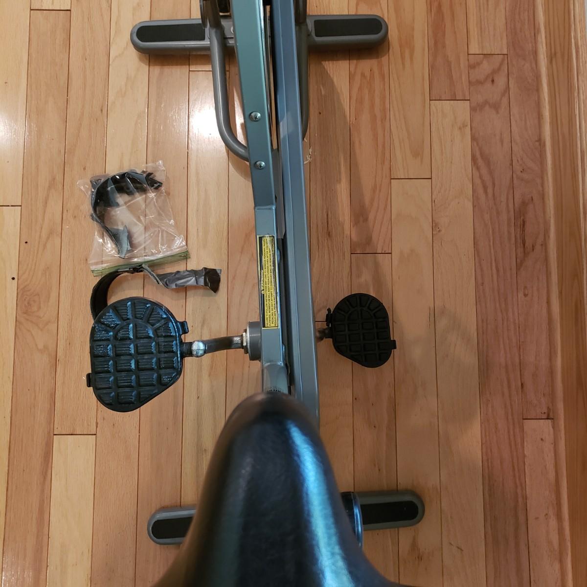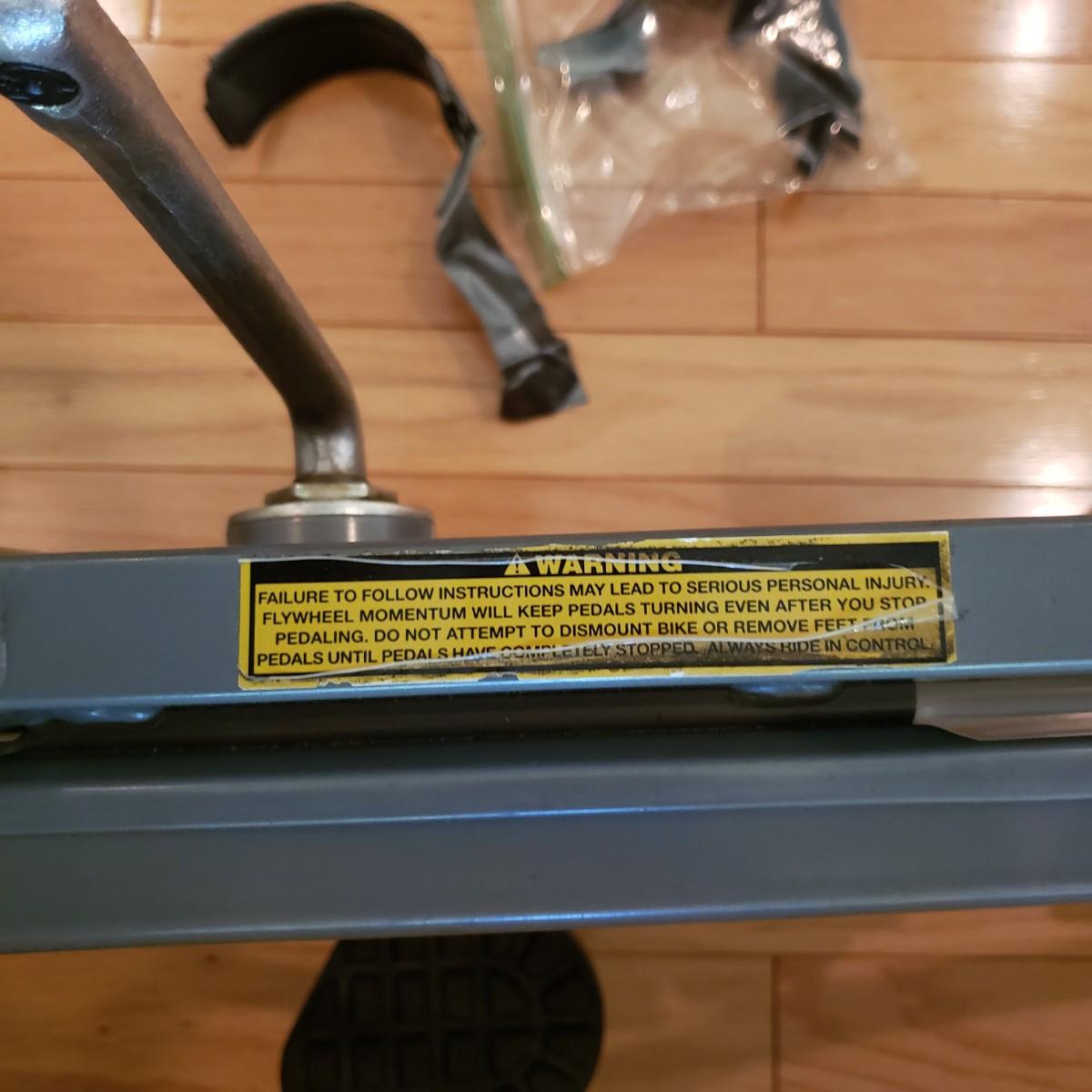 This Schwinn DX900 indoor cycle has an adjustable seat height, adjustable padded handle bars, a pedal resistance knob and an on-board computer. The computer for time, distance, calories and R.P.M. does not currently power on when the button is pushed. There are screw holes in the back of the computer, likely for battery replacement. There is a watch on the handle bar that also does not currently power on, but attaches to a removable clip for your own watch! There is also an added stand on the handle bars, for holding a book or your phone. The pedal straps have broken, which is in the baggie and next to the baggie in the picture. This equipment can move easily when tipped onto the two front wheels. The bike measures 43" x 20" x 50"H.