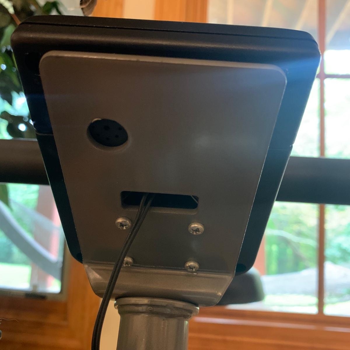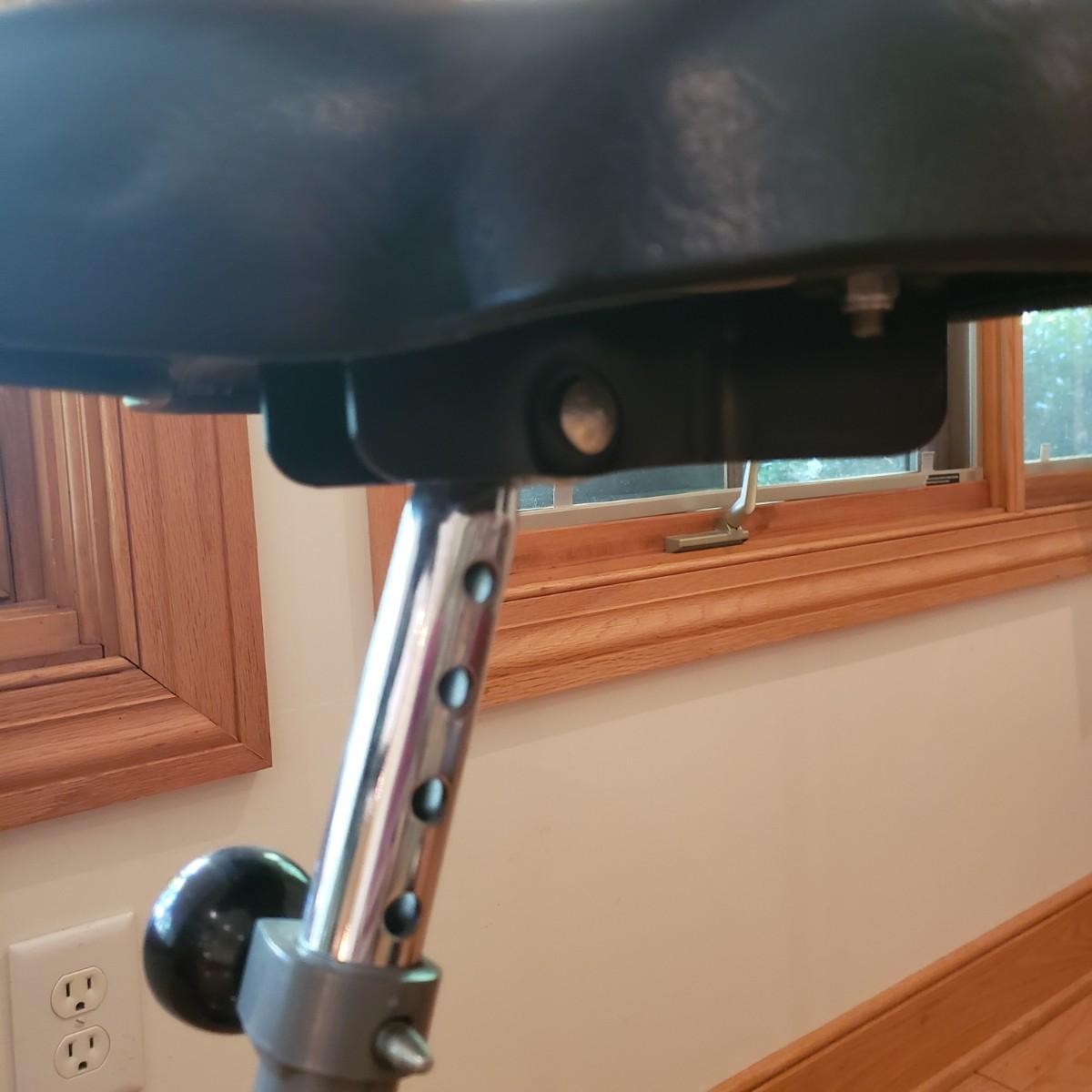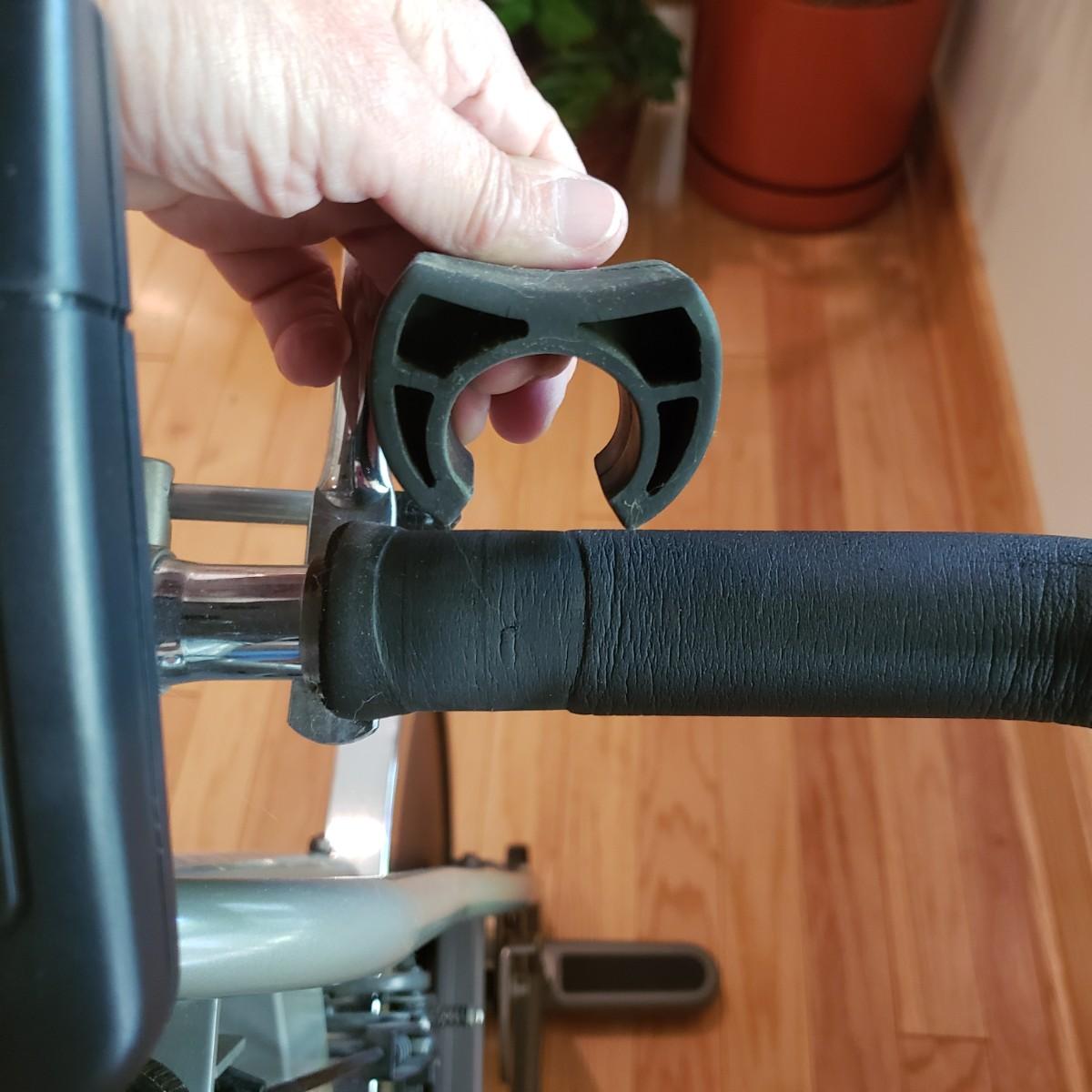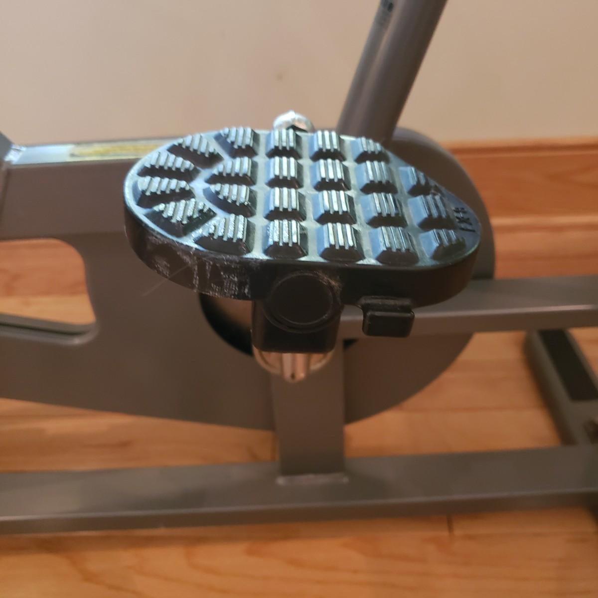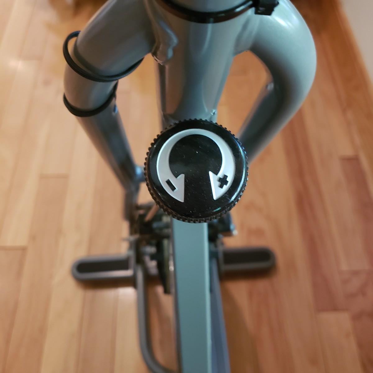 This Schwinn DX900 indoor cycle has an adjustable seat height, adjustable padded handle bars, a pedal resistance knob and an on-board computer. The computer for time, distance, calories and R.P.M. does not currently power on when the button is pushed. There are screw holes in the back of the computer, likely for battery replacement. There is a watch on the handle bar that also does not currently power on, but attaches to a removable clip for your own watch! There is also an added stand on the handle bars, for holding a book or your phone. The pedal straps have broken, which is in the baggie and next to the baggie in the picture. This equipment can move easily when tipped onto the two front wheels. The bike measures 43" x 20" x 50"H.