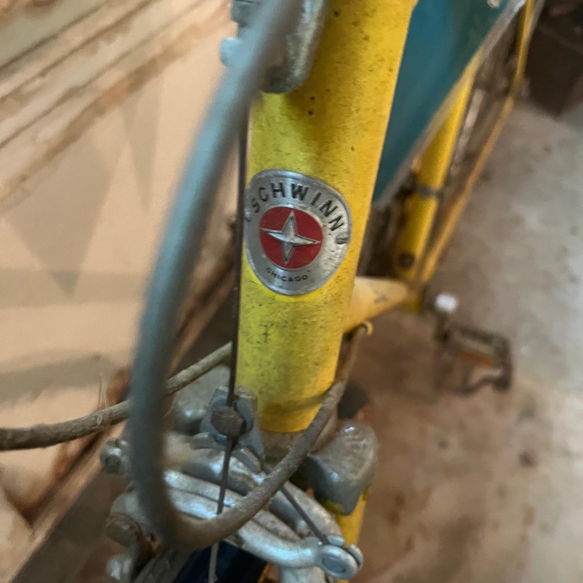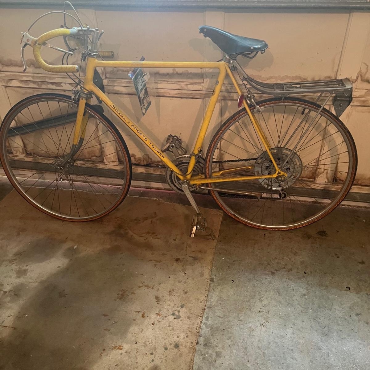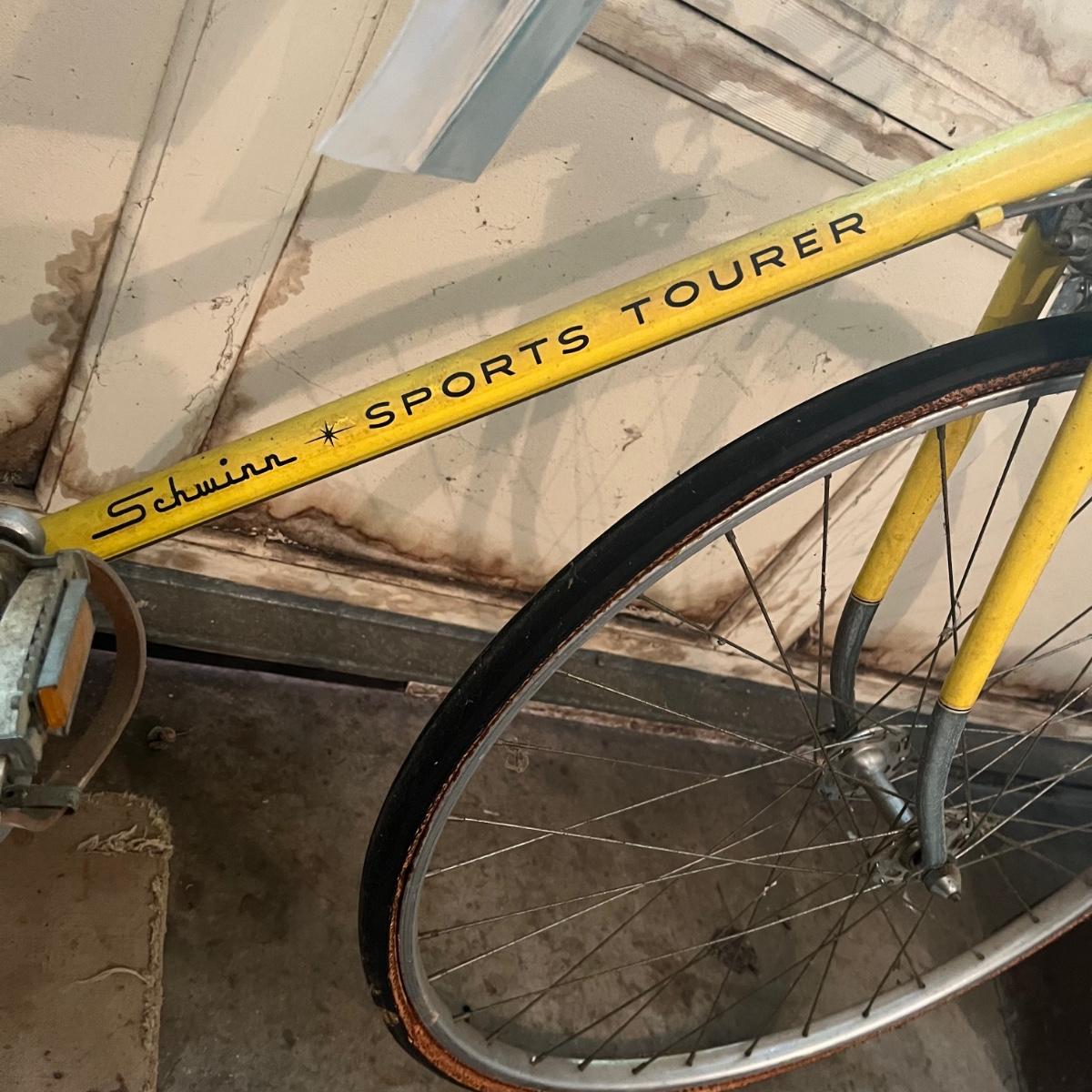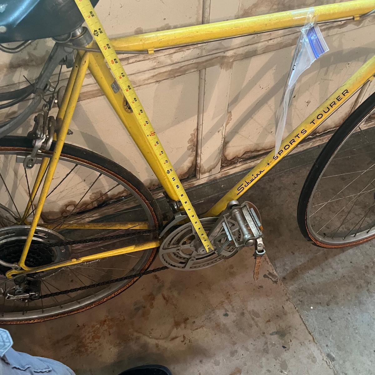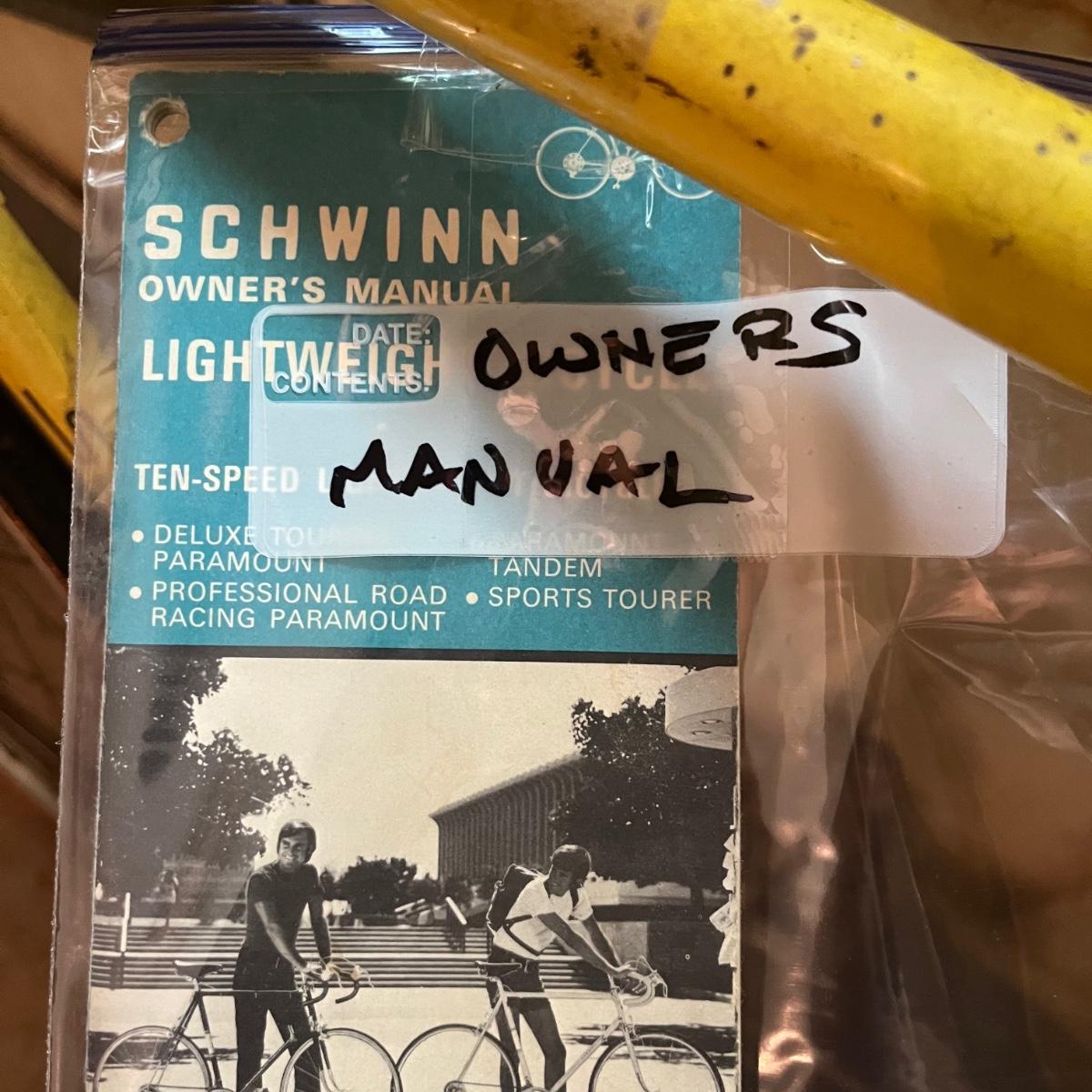 Lot includes a Schwinn Sport Tourer ten speed bicycle with Le Tour gear set, Brooks saddle, center pull brakes and back rack. Tires are old and flat. Bicycle measures 24” from middle of crank to top of seat mount. Also includes owners manual.