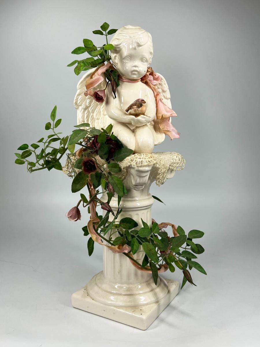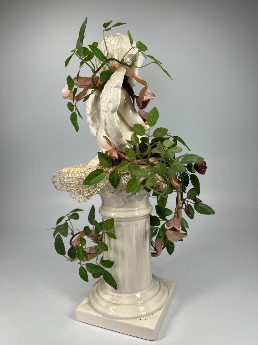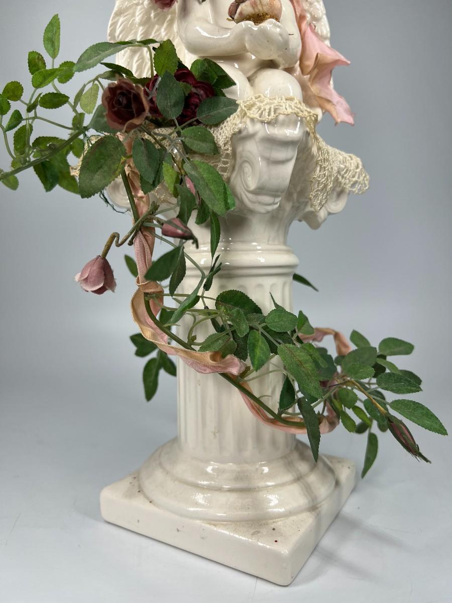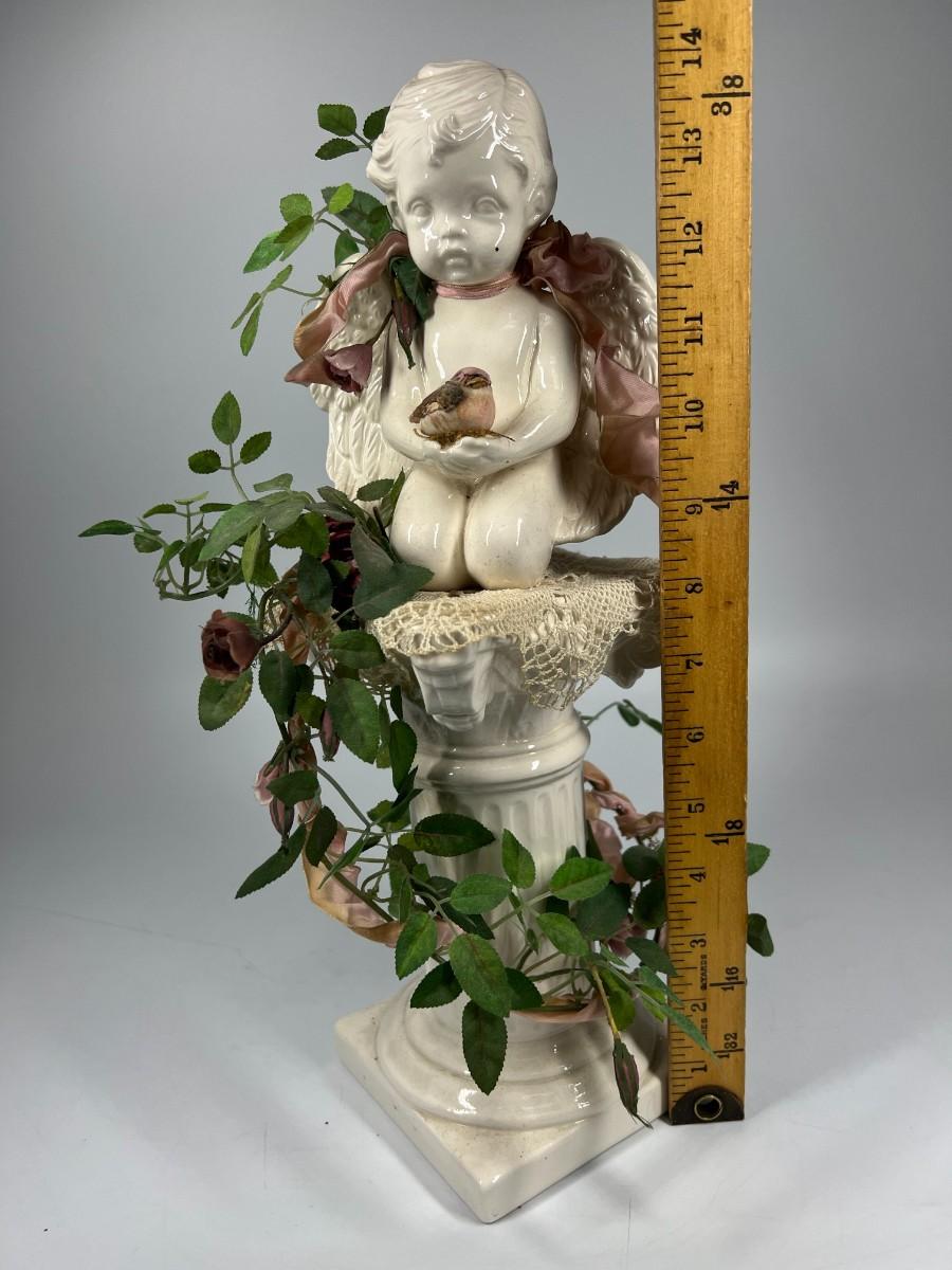 Scioto Decorative Ceramic Cherub Angel Holding Bird on Pedestal with Faux Vine, there are no significant cracks or chips in the ceramic and is in good displayable condition. Check pictures for more details and for sizing.