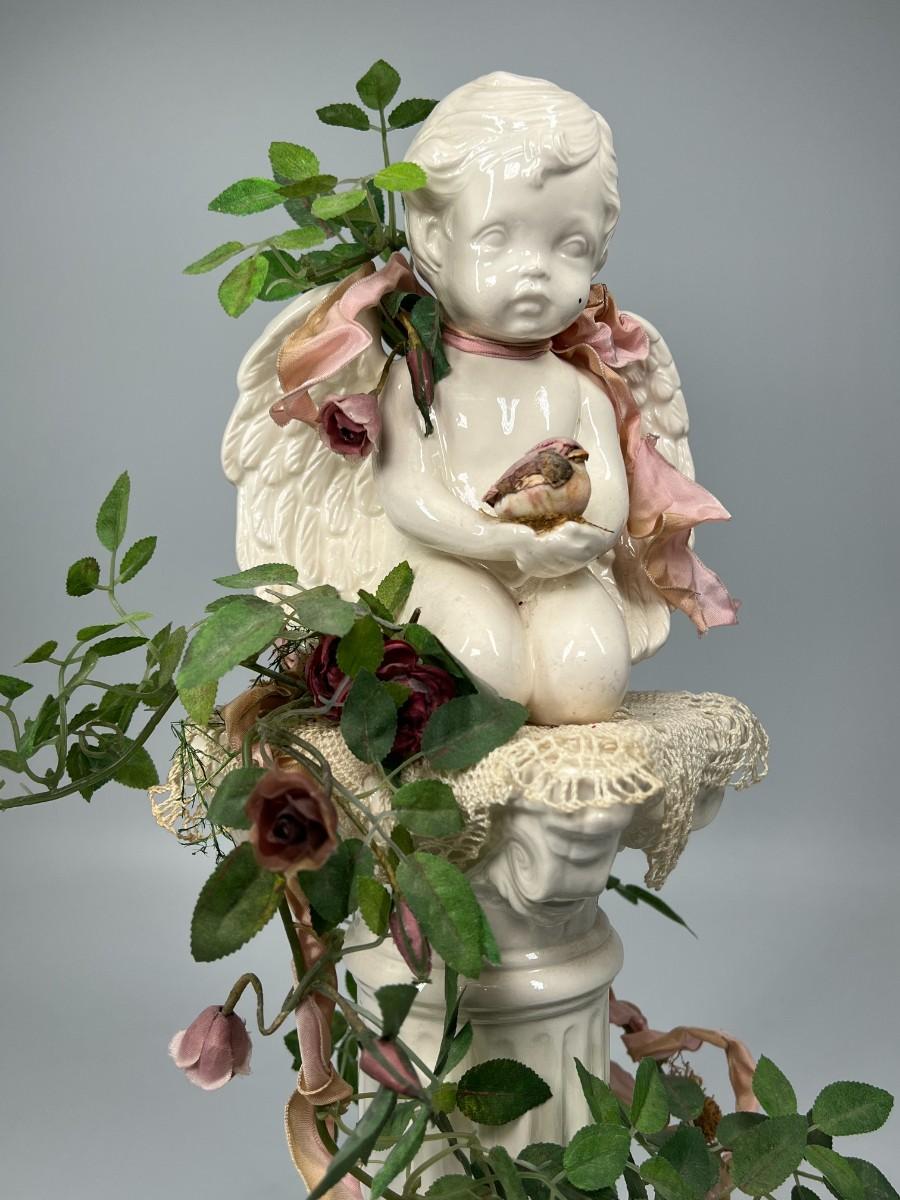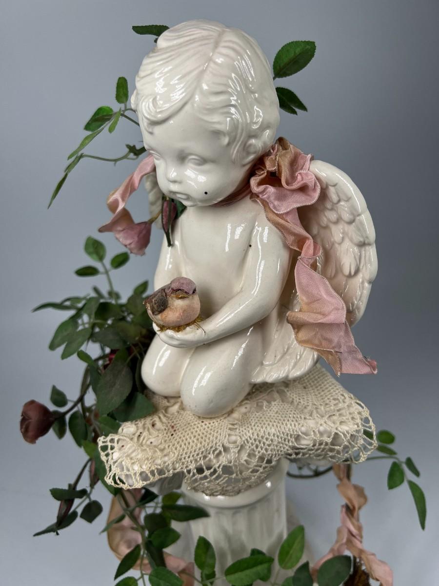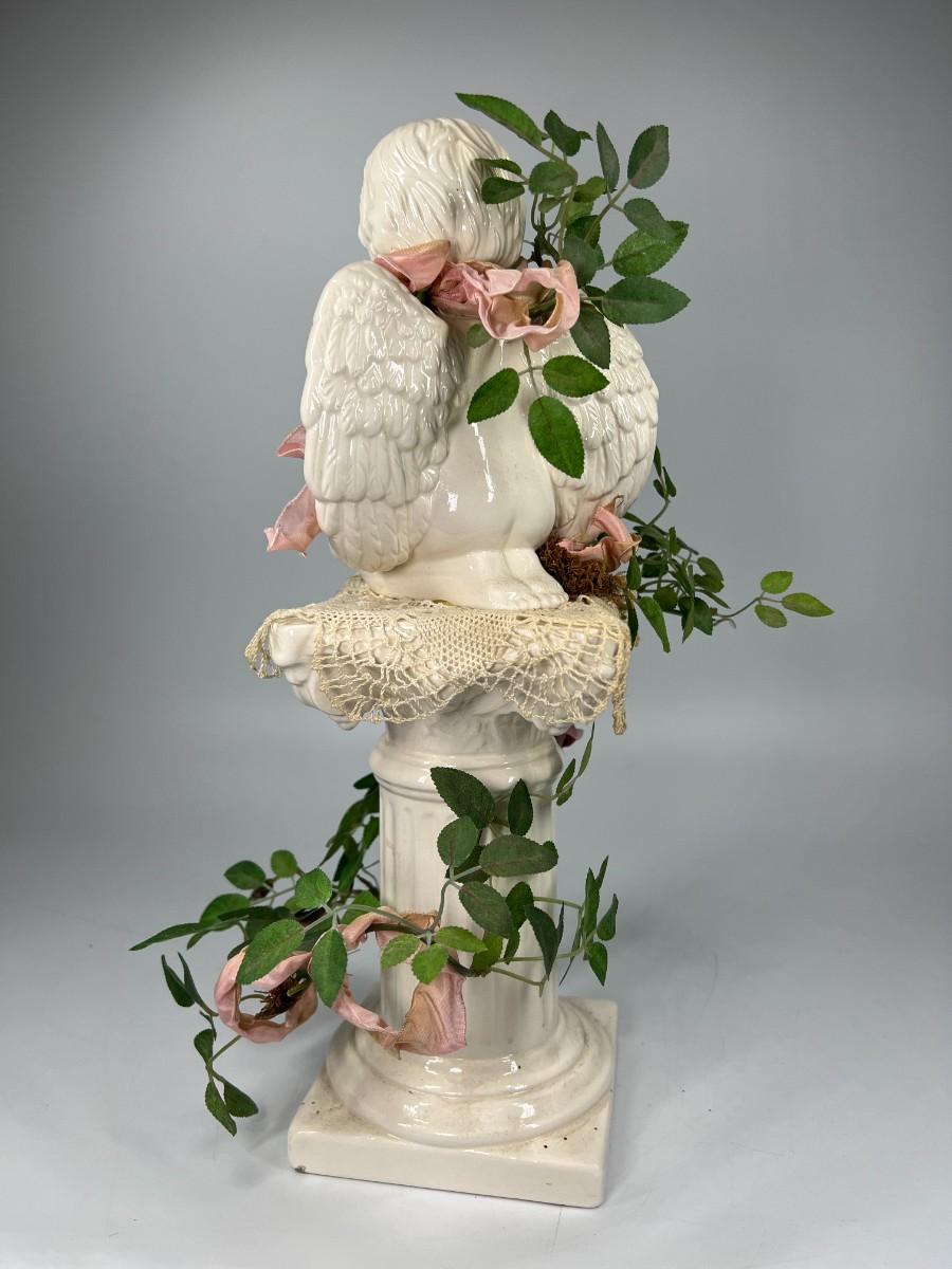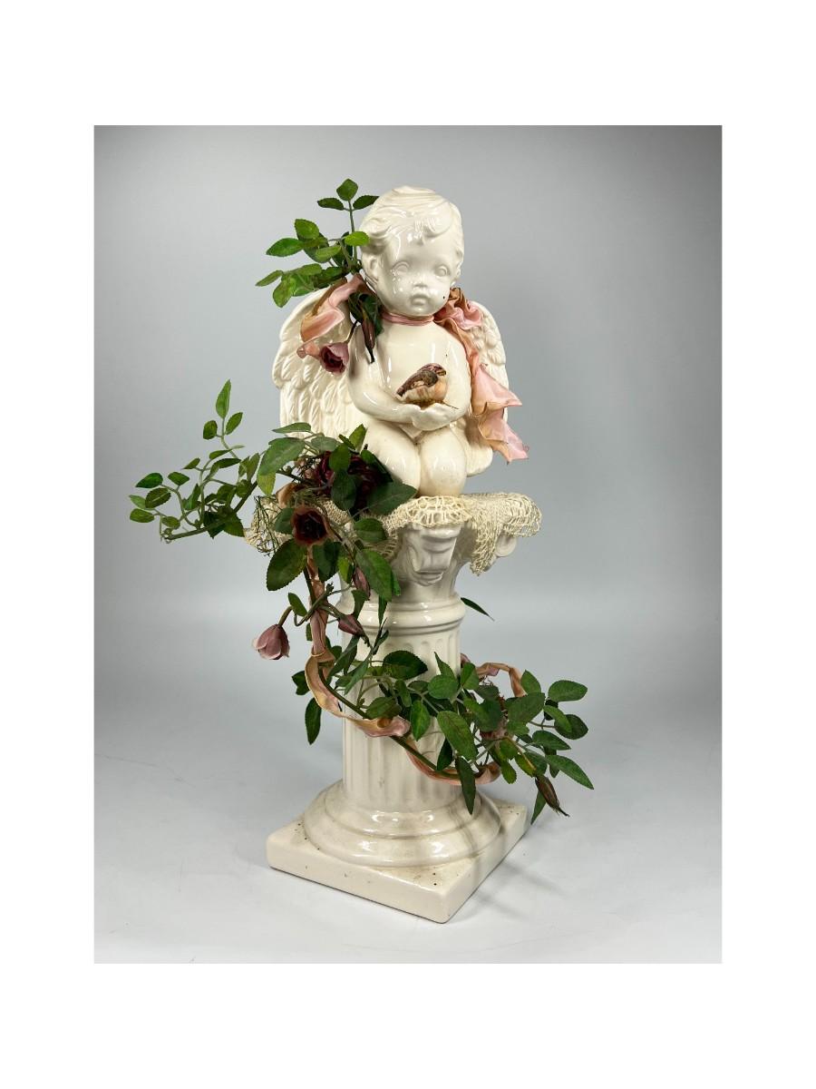 Scioto Decorative Ceramic Cherub Angel Holding Bird on Pedestal with Faux Vine, there are no significant cracks or chips in the ceramic and is in good displayable condition. Check pictures for more details and for sizing.