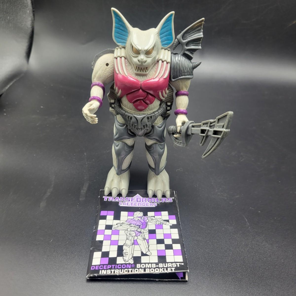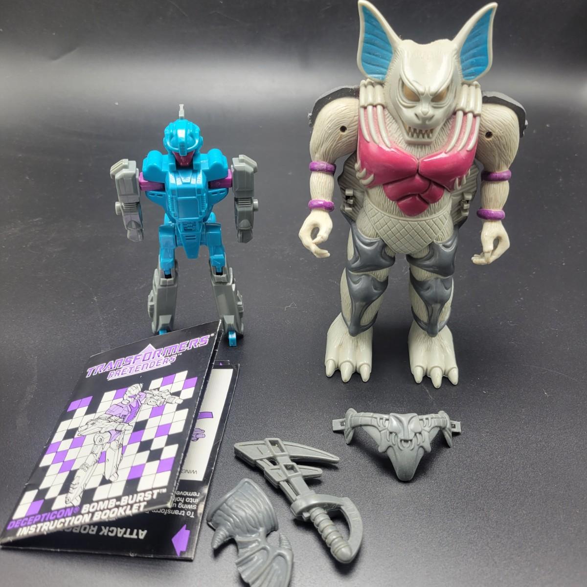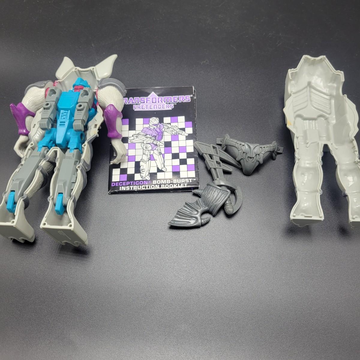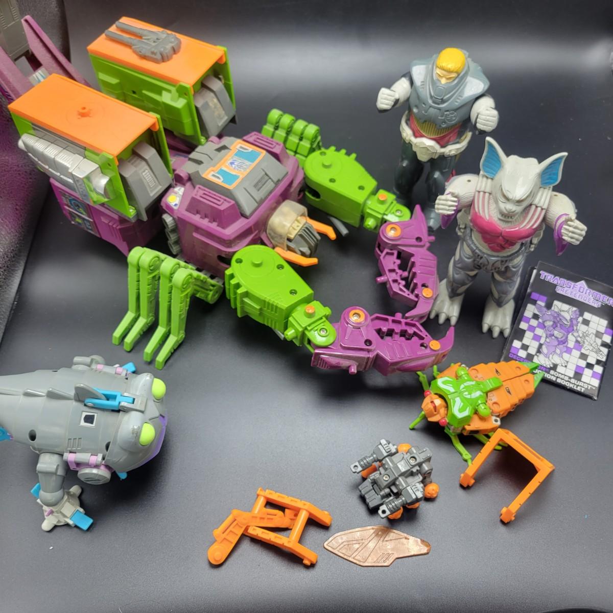 A collection of four Transformers and some additional pieces. Lot includes Scorponok with its original head that also transforms. Two pretenders. Bomb Burst and WaveRider. Both have their original interior robots and a handful accessories. Also included are some items that seemed like they went with this collection. Scorponok stands 15" transformed. Also includes original instructions for Bomb Burst. Shipping available