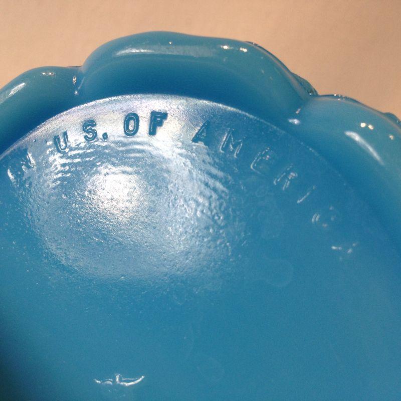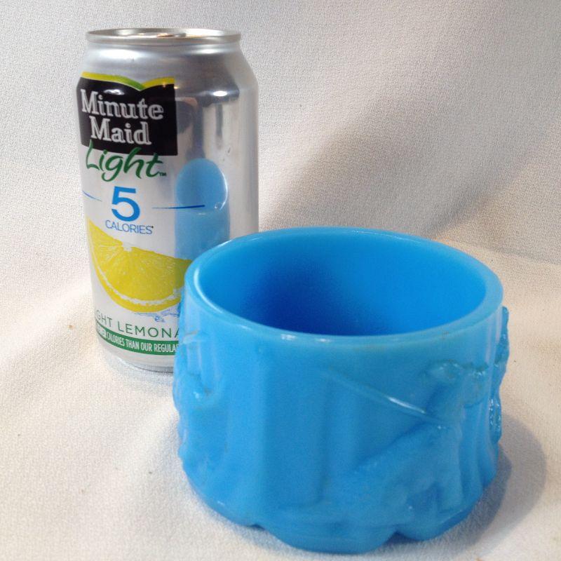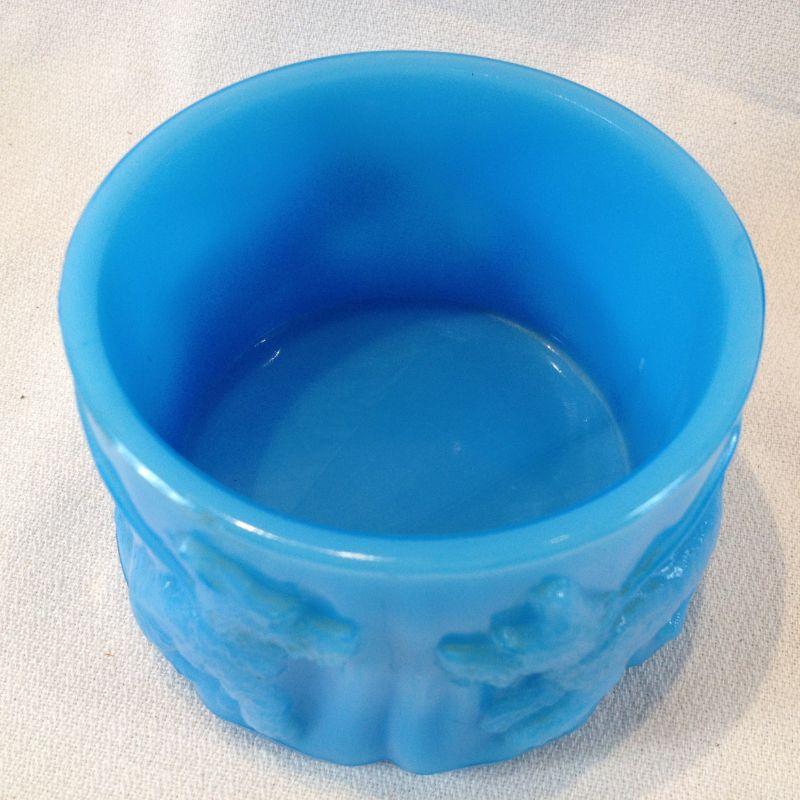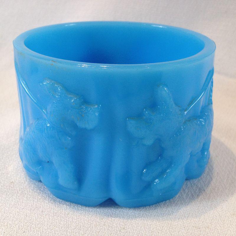 This lot is a smaller, blue-toned milk glass jar with Scotty Dogs motif. There is a trade mark on back that we cannot make out, but it states "Make is United States of America". (We have no lid if it ever had one) Very Sweet! In very good condition.
