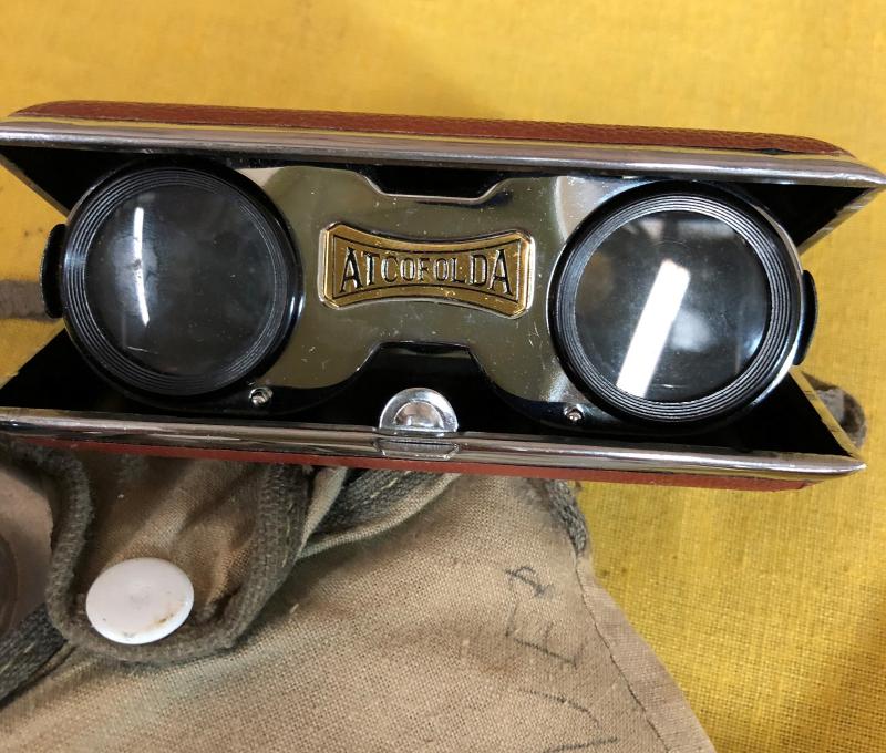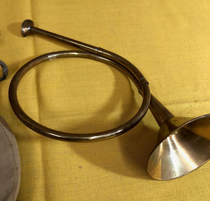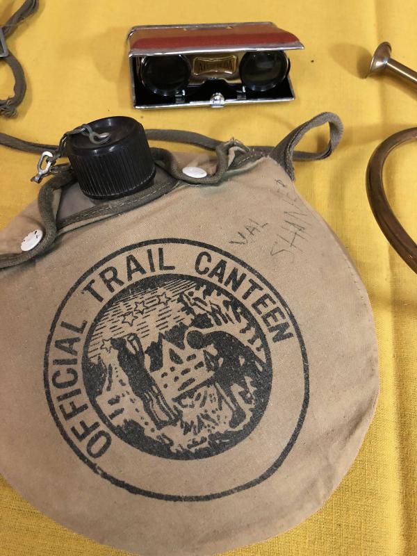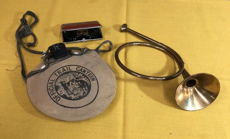 Here is a vintage lot...Official Trail Canteen..collapsible Opera Glasses...decorative brass trumpet...