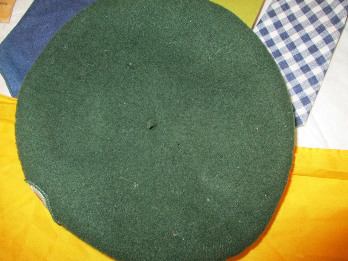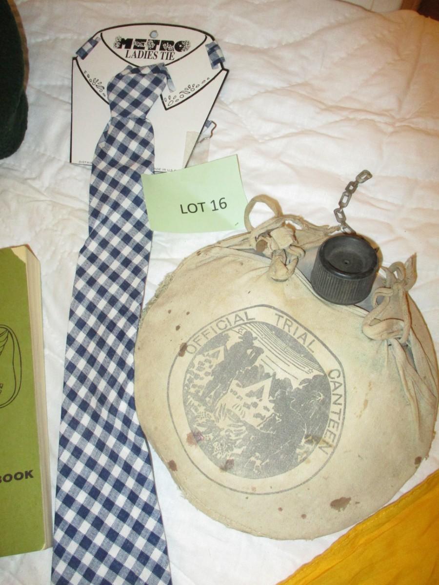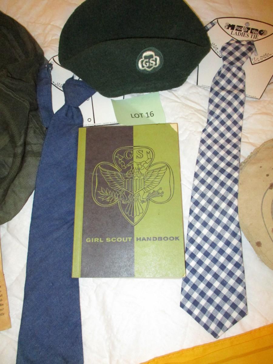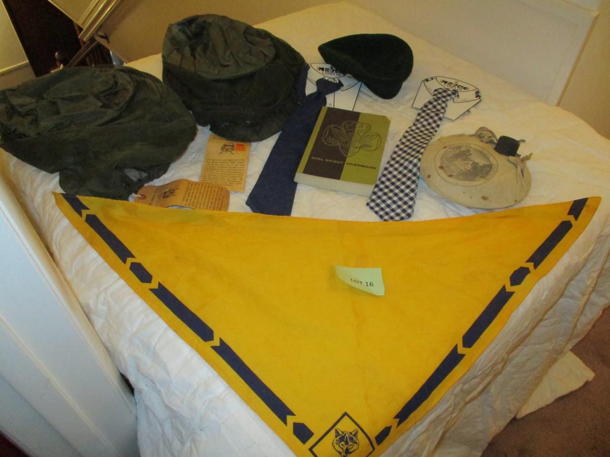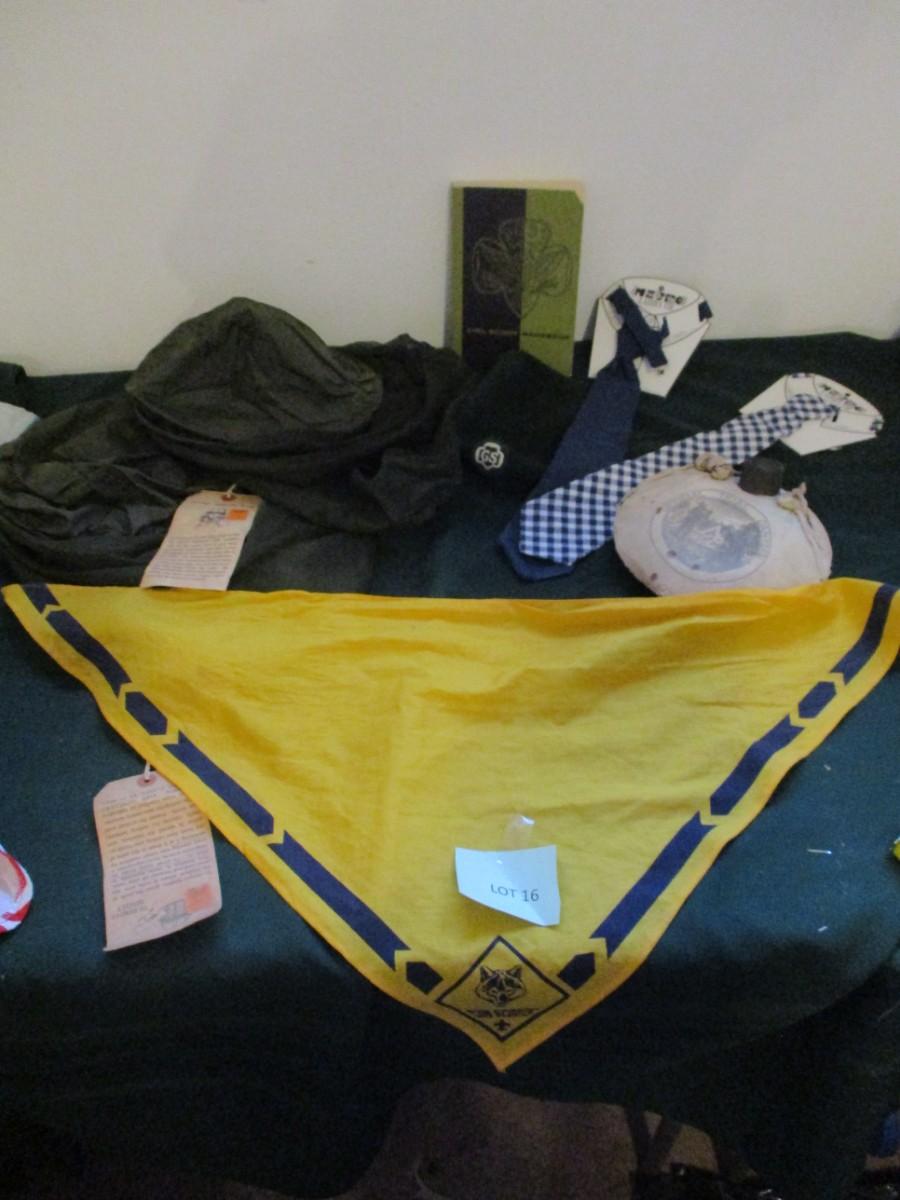 Girlscout handbook. Boyscout Scarf. Canteen. Girlscout Kangol hat (normal wear). Mosquito Face nets (2). Metro Ladies Ties.