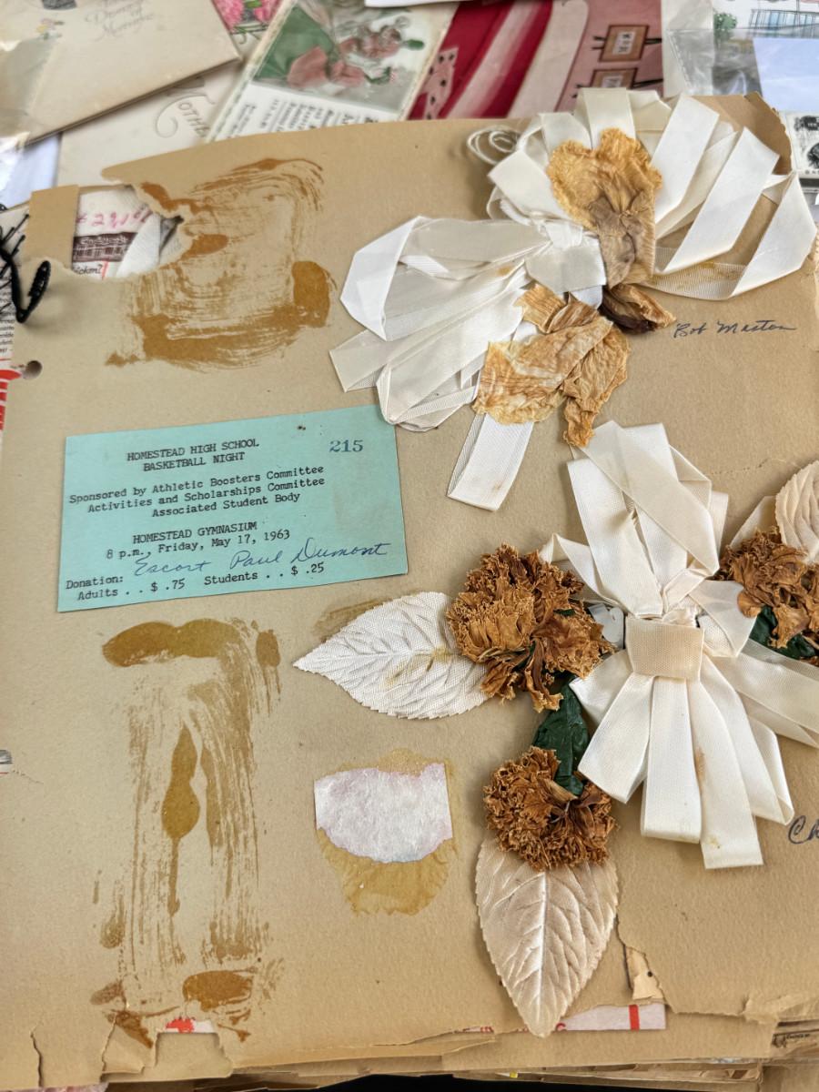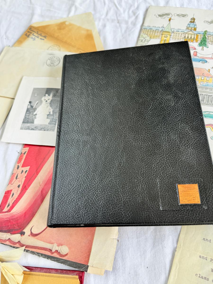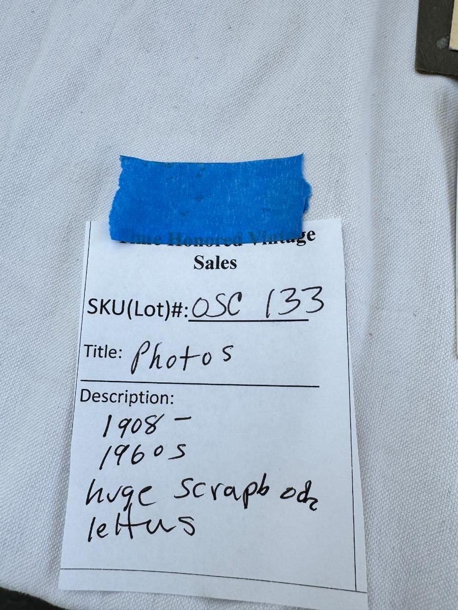 Very large 1950s scrapbook with high school memorabilia, Fremont high. Clack photo album full of Black and white shots, Early 19th cent portraits, Cards to Mother 1940s.. Sorry the Sad Iron IS NOT part of the lot, just being used as paper weight.