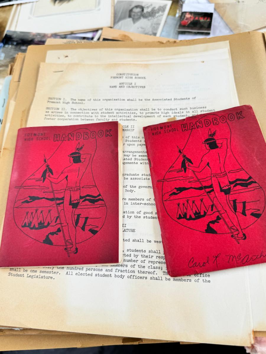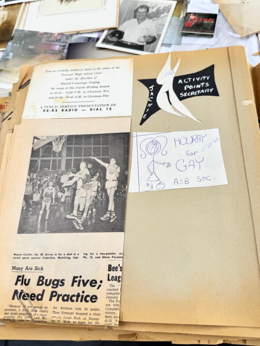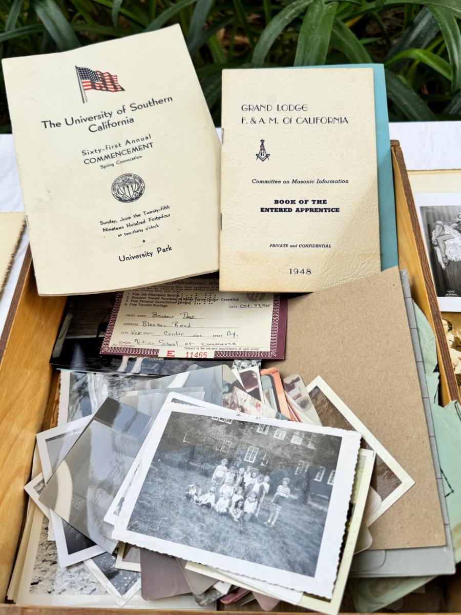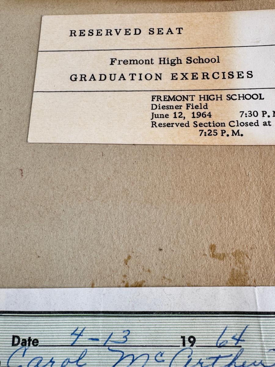 Very large 1950s scrapbook with high school memorabilia, Fremont high. Clack photo album full of Black and white shots, Early 19th cent portraits, Cards to Mother 1940s.. Sorry the Sad Iron IS NOT part of the lot, just being used as paper weight.