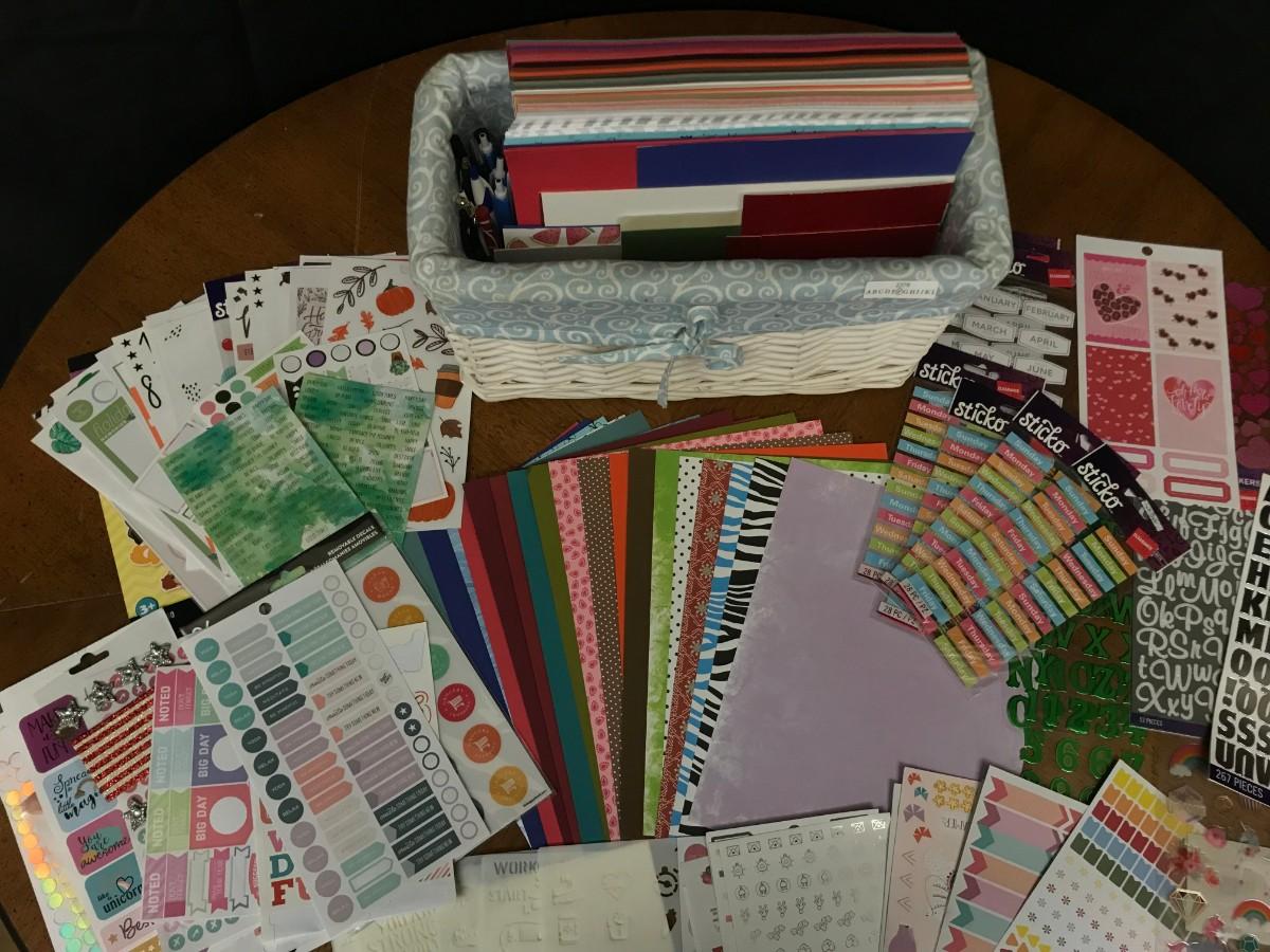 crafts: scrapbooking materials, including stickers, letters, all sorts of paper to craft with;