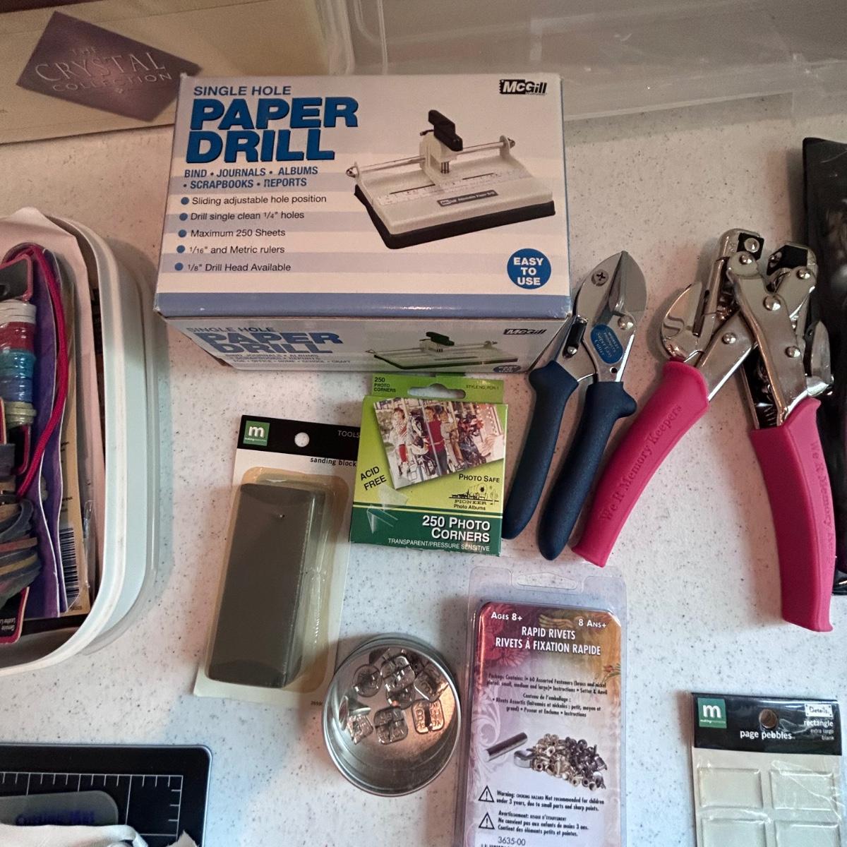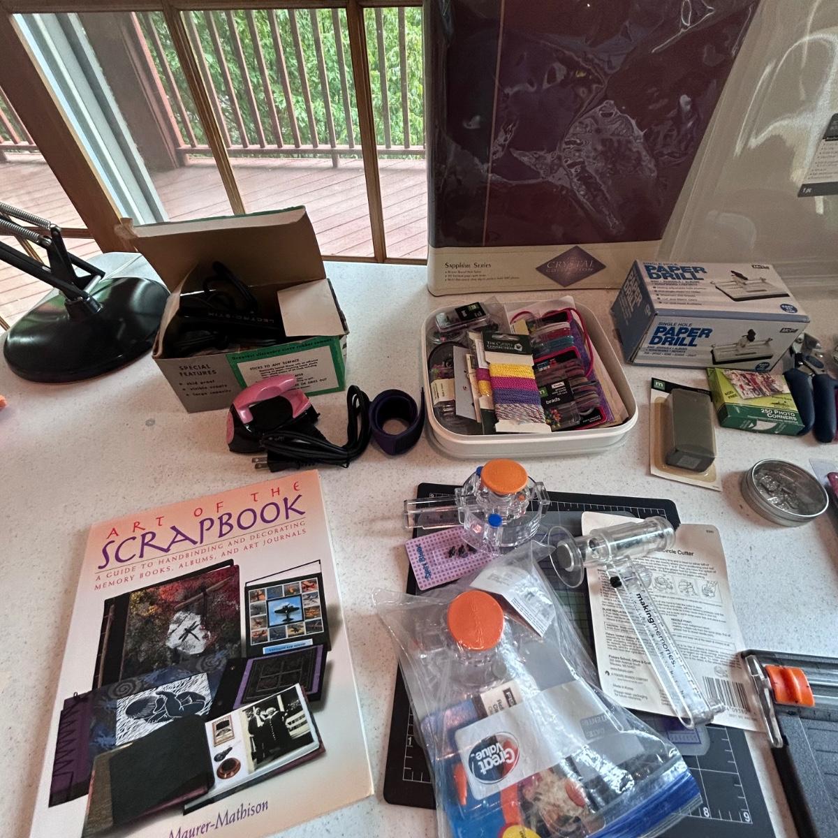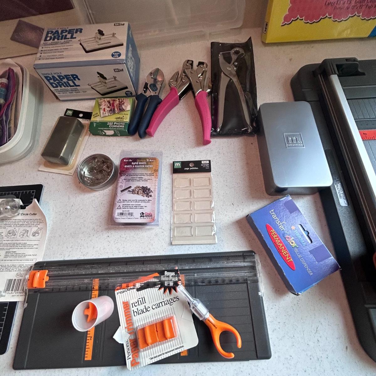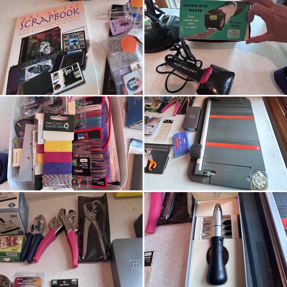 Here are all the basics to start that scrapbook making you always wanted to try. There are cutters like the Fiskars Desktop Rotary paper cutter, hole punches like the Crop a file Hole punch, glass mat, circle cutter with mat, ornamental detailing, Lectro Stik waxer and more. The mini iron powered on when plugged in. The Lectro Stik did not, but does come with a troubleshooting guide. Local pick up only.