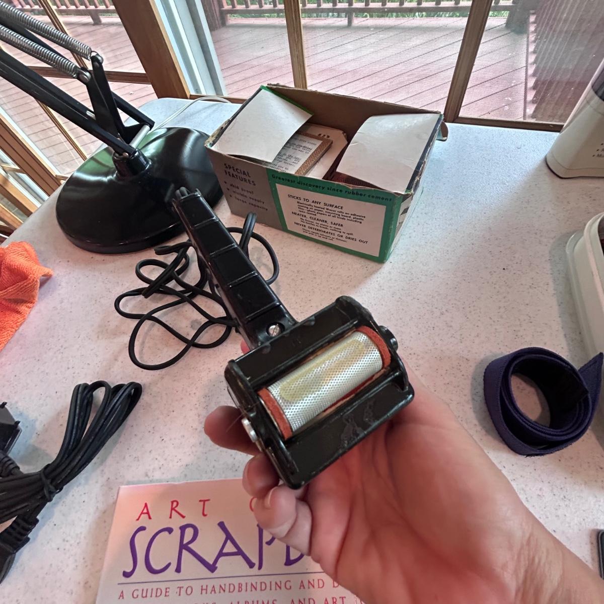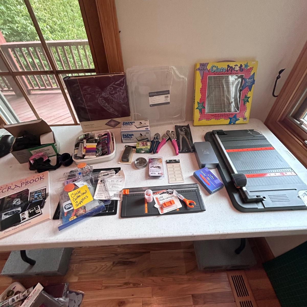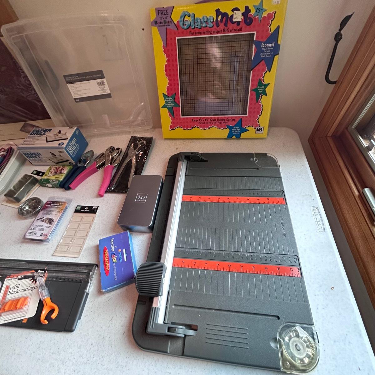 Here are all the basics to start that scrapbook making you always wanted to try. There are cutters like the Fiskars Desktop Rotary paper cutter, hole punches like the Crop a file Hole punch, glass mat, circle cutter with mat, ornamental detailing, Lectro Stik waxer and more. The mini iron powered on when plugged in. The Lectro Stik did not, but does come with a troubleshooting guide. Local pick up only.