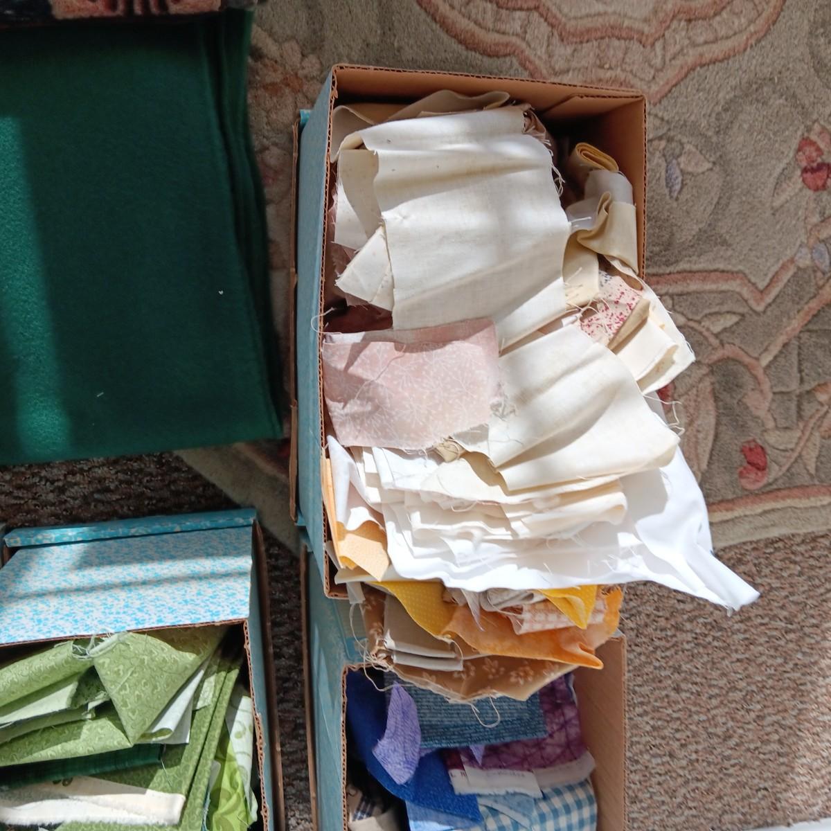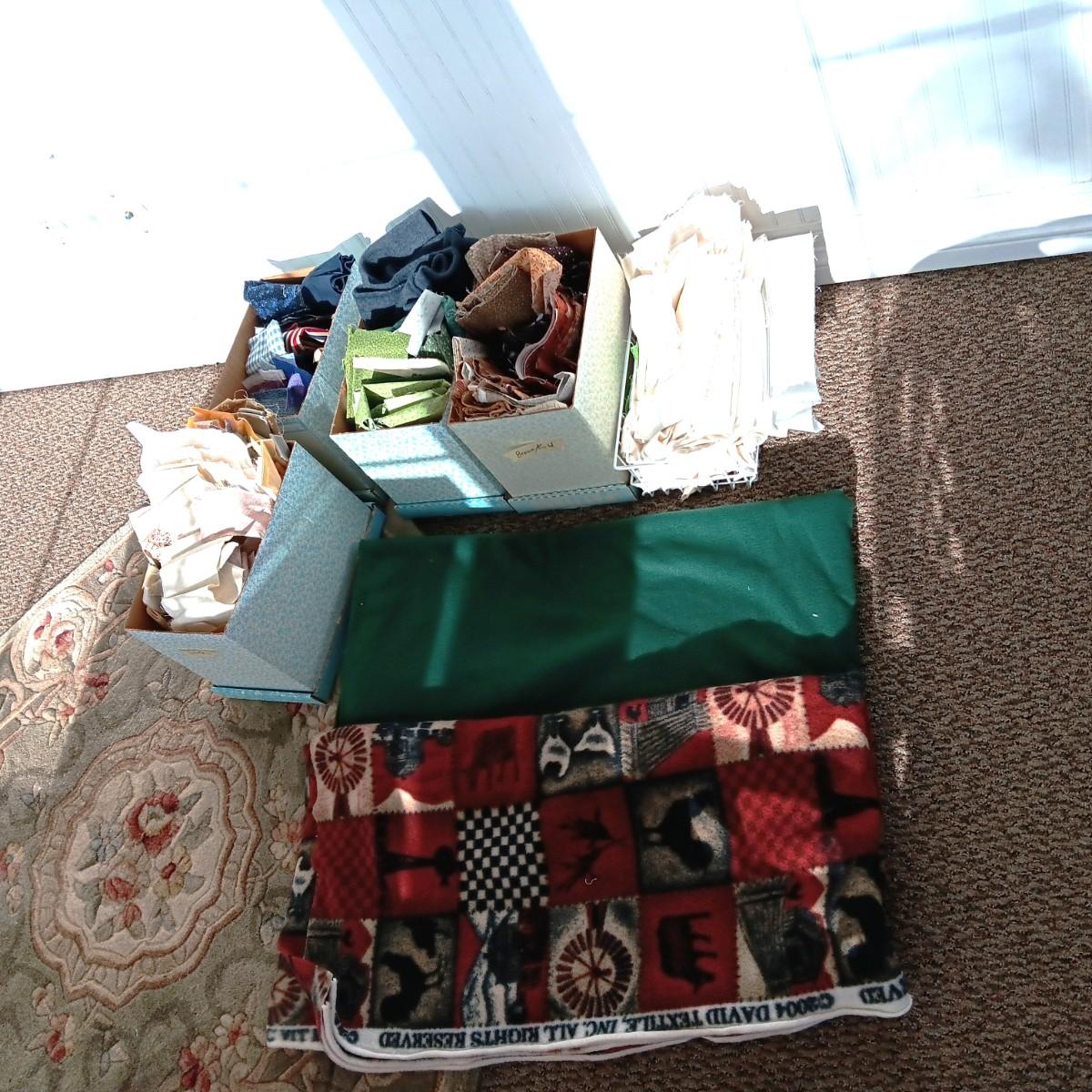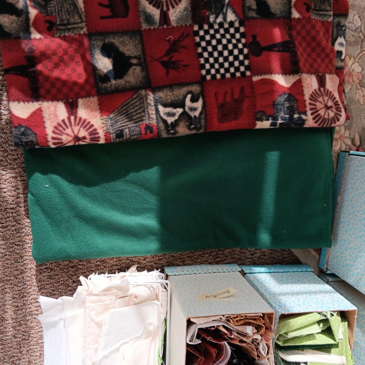 SCRAPS OF SEWING MATERIAL, LARGER PIECES OF FLEECE AND PATTERN BOXES