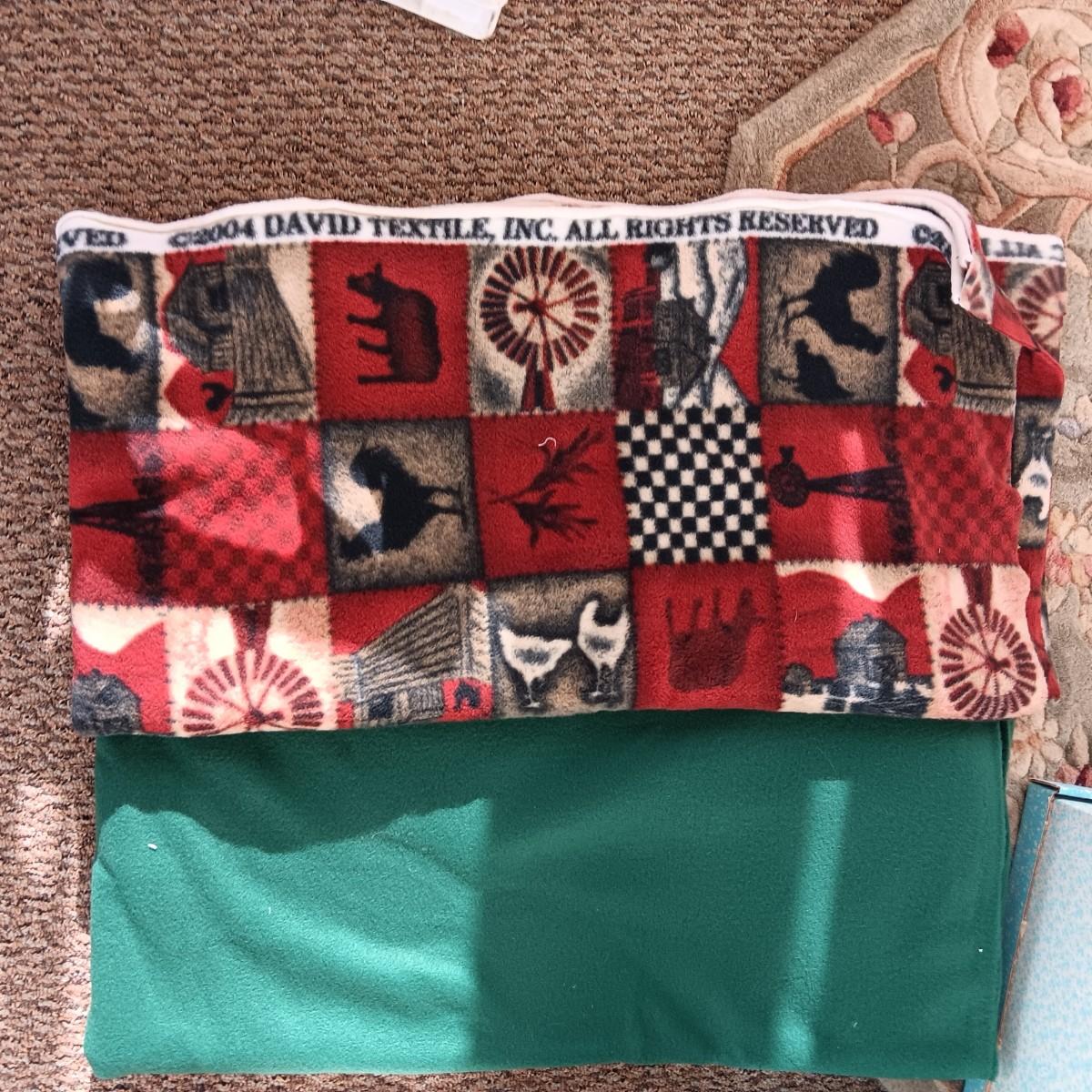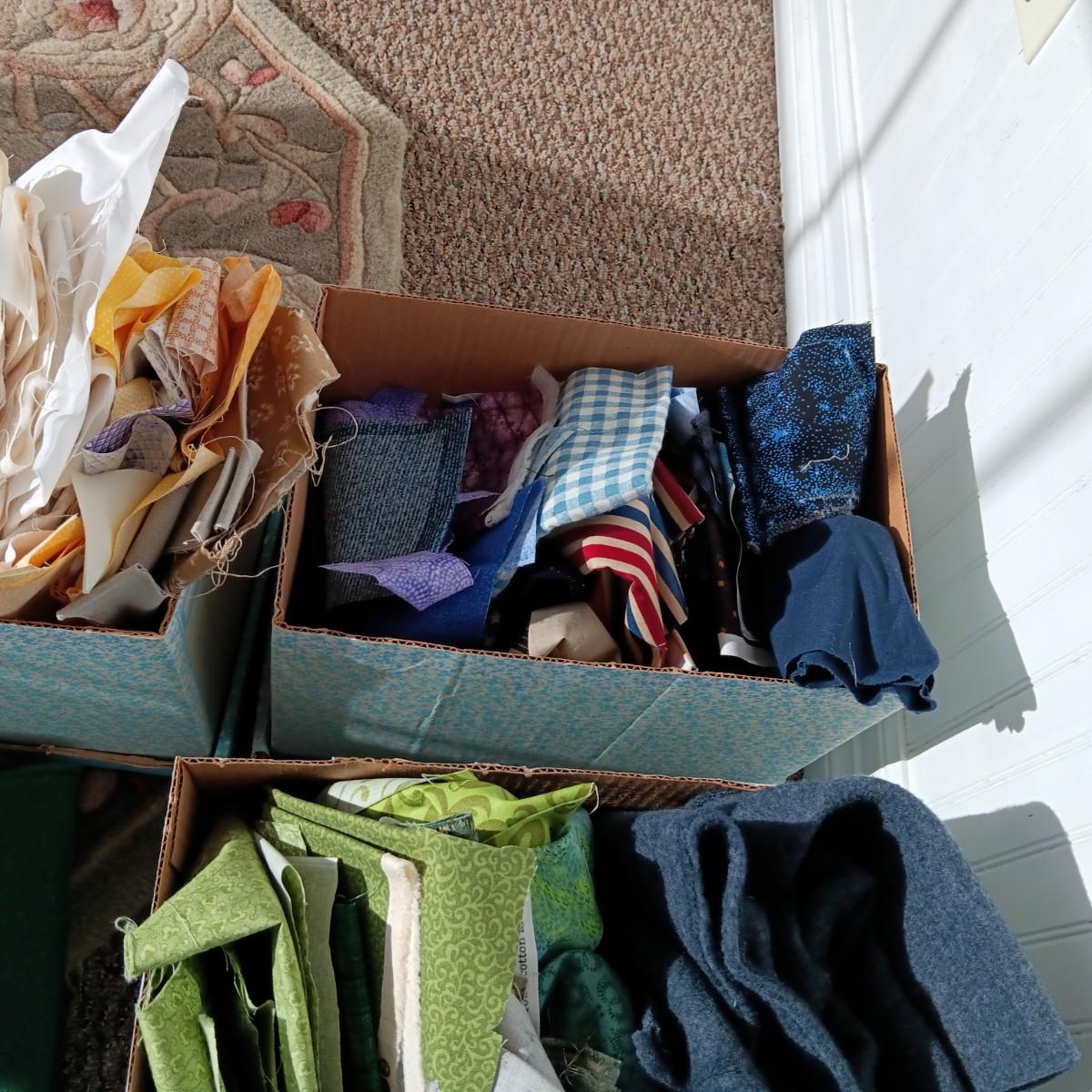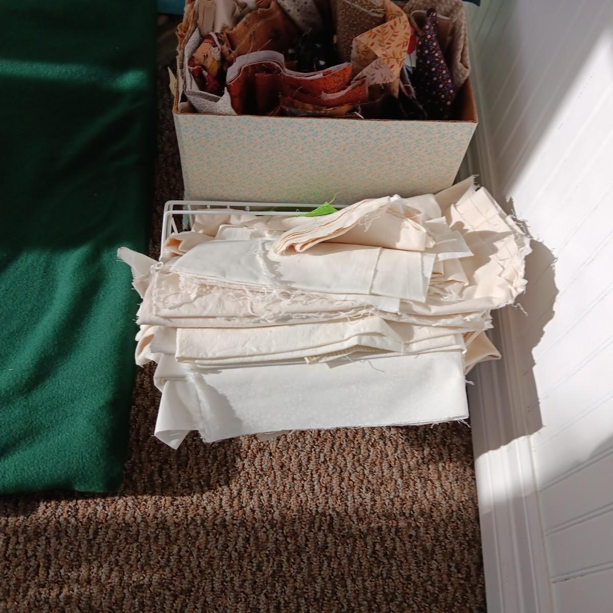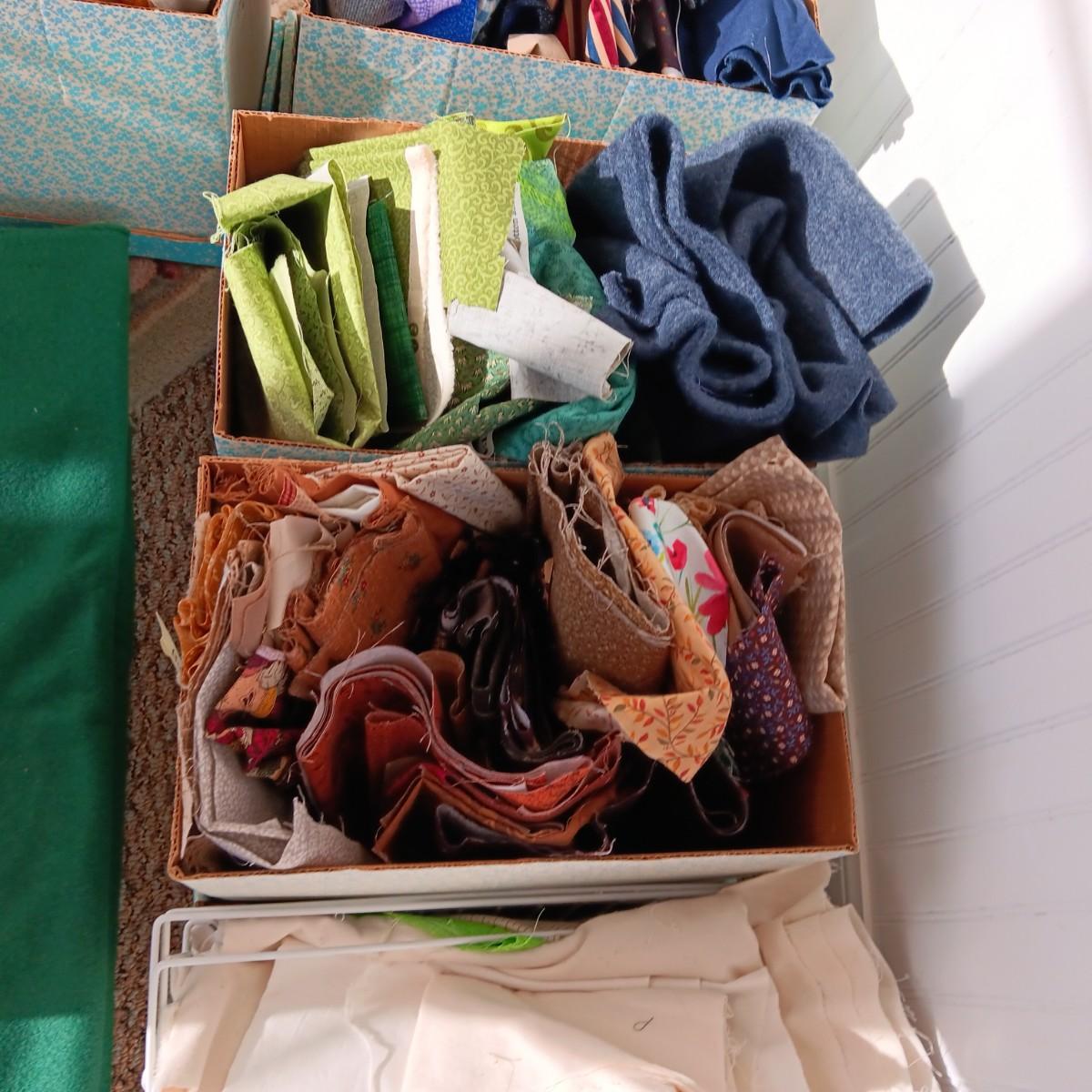 SCRAPS OF SEWING MATERIAL, LARGER PIECES OF FLEECE AND PATTERN BOXES