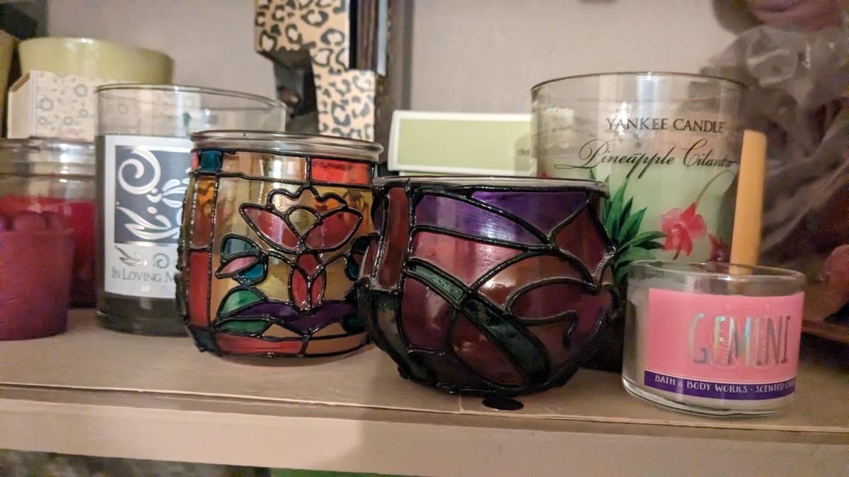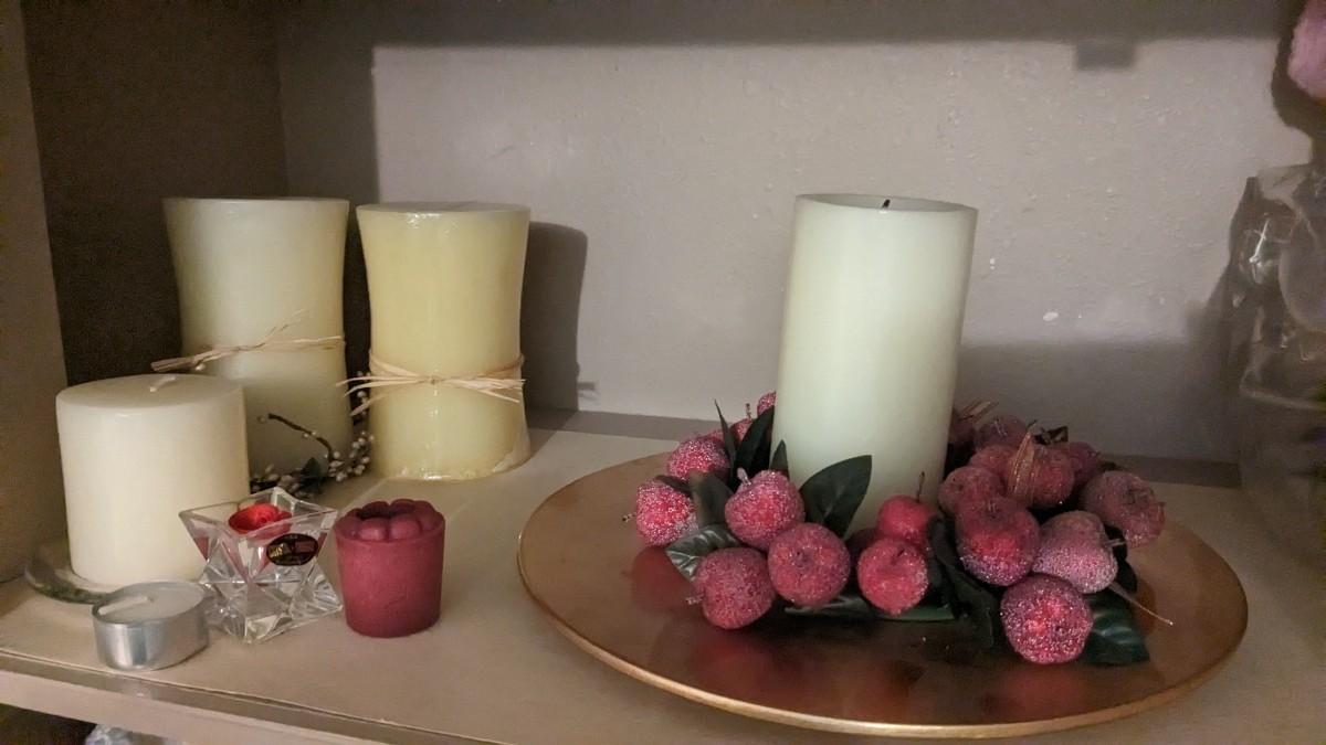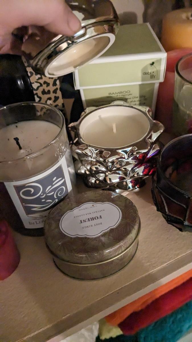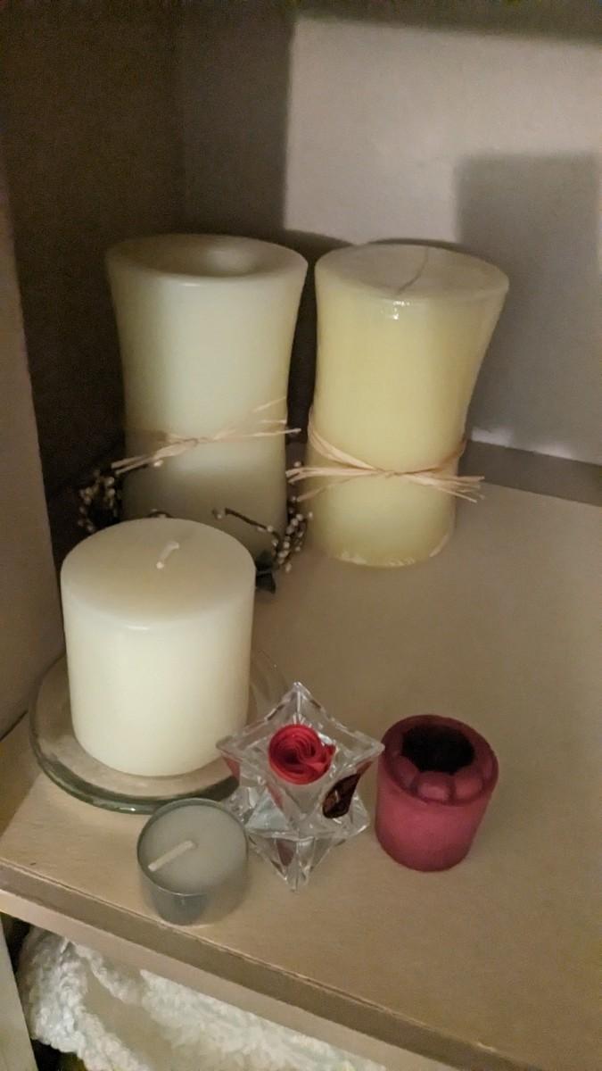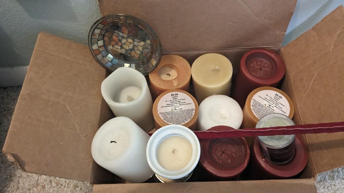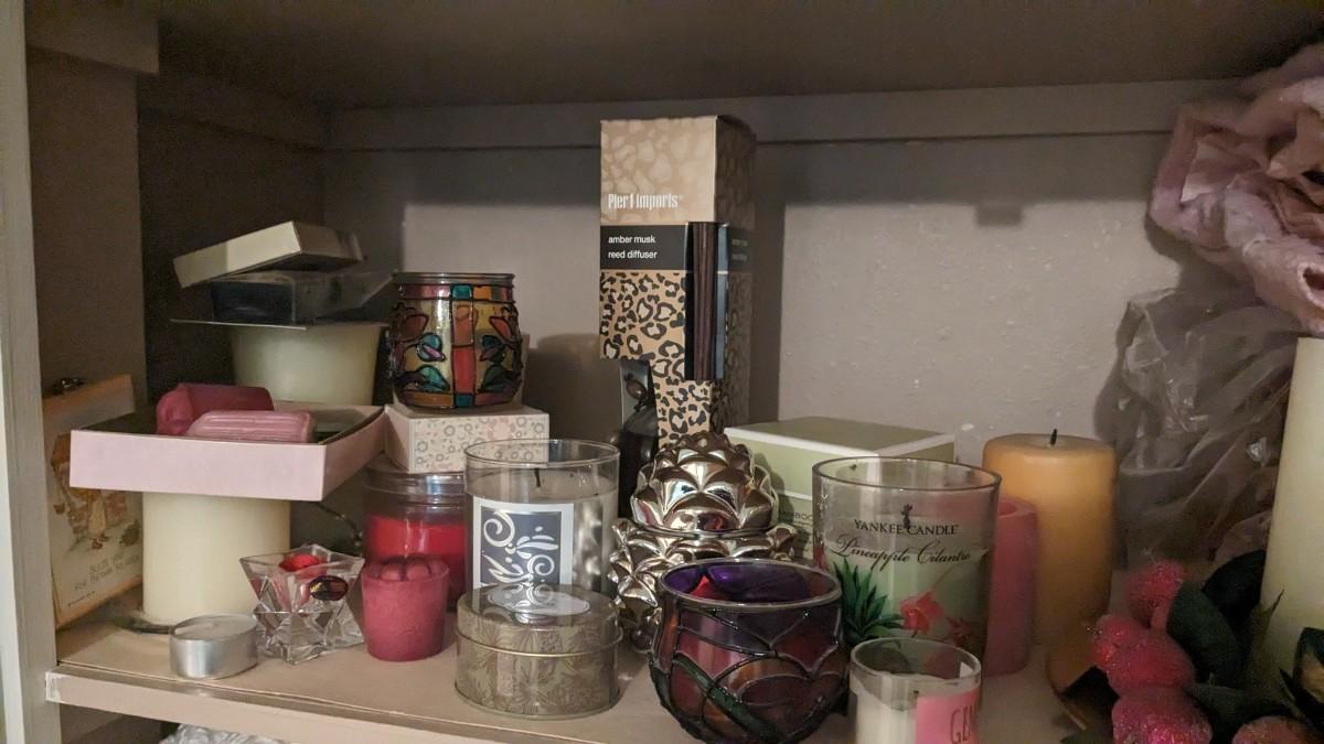 a wonderful array of new and very lightly used candles, incense, and a lovely diffuser. Also includes a very nice brass extra long lighter with felt case. Some very nice decorative items are included. No shipping. livingroom