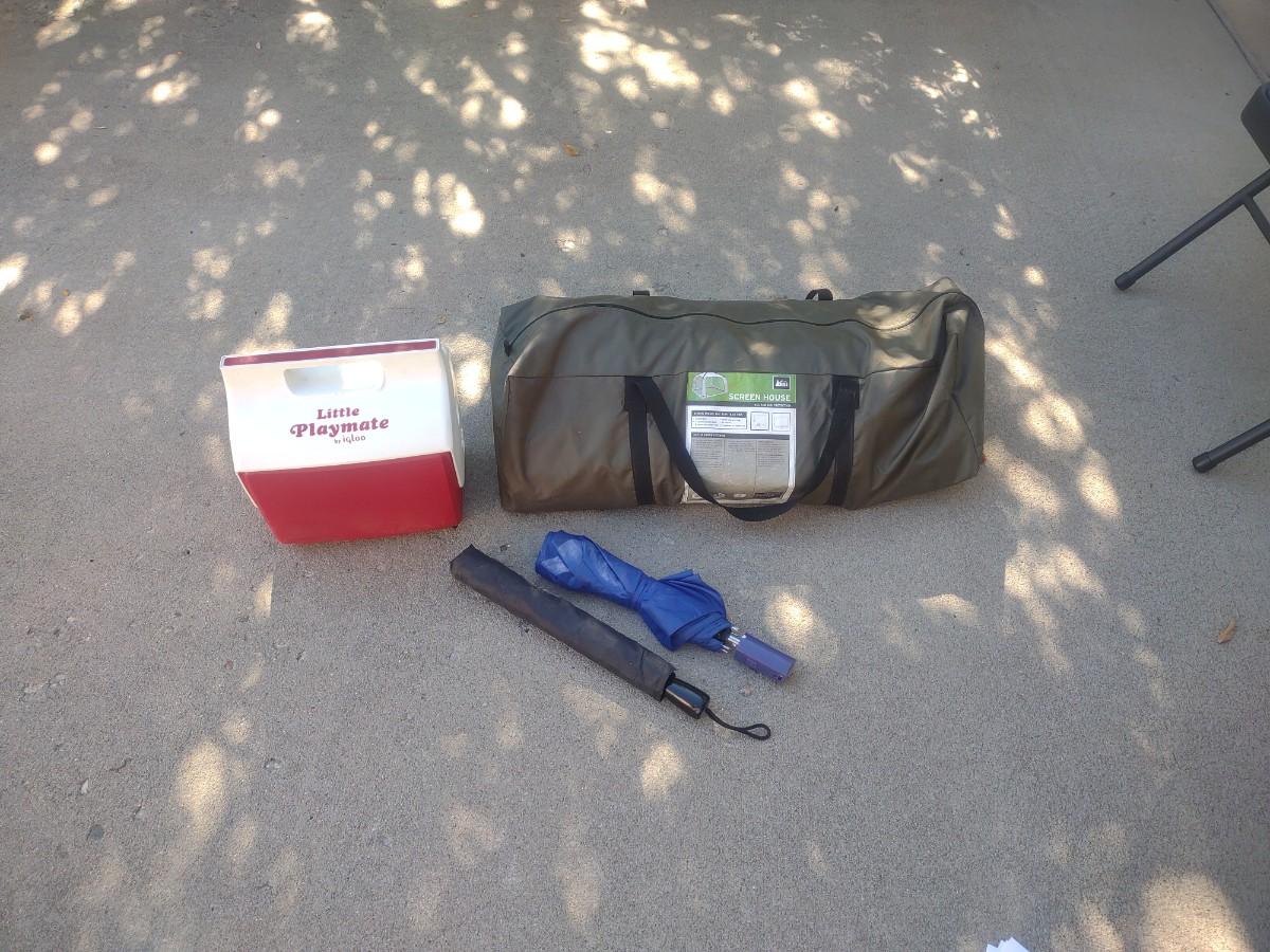 SCREEN HOUSE, PLAYMATE COOLER AND 2 UMBRELLAS
