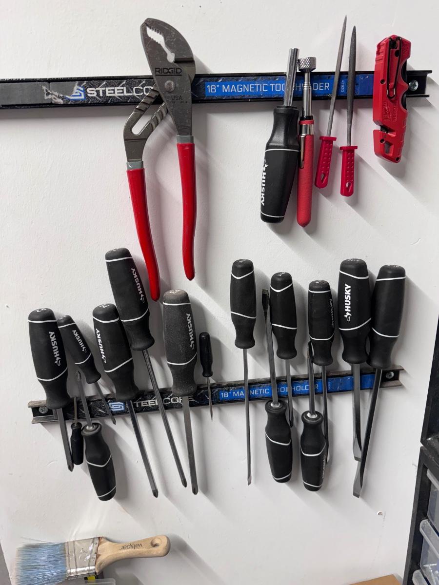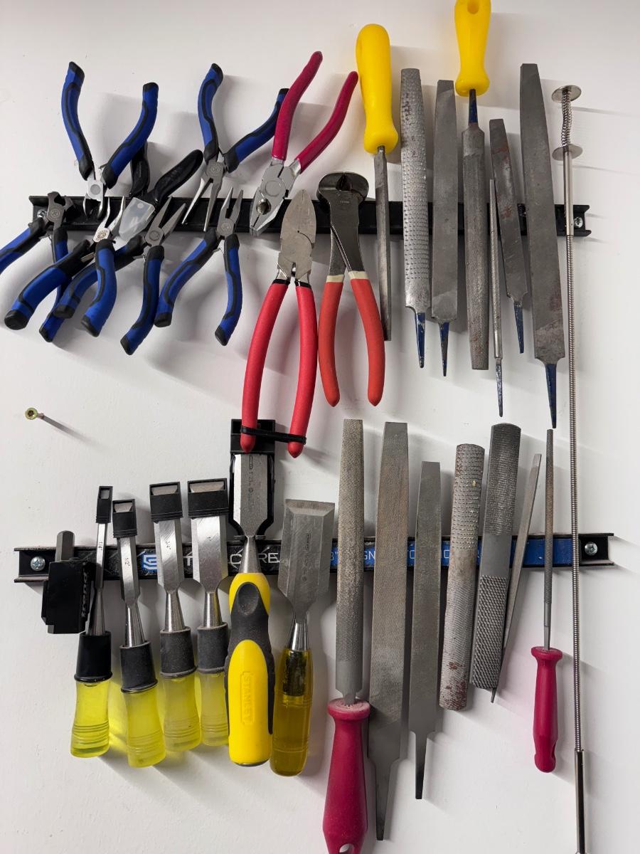 Screwdrivers, Wire Cutters, Chisels, etc.- includes magnetic wall-mounted holders (4).