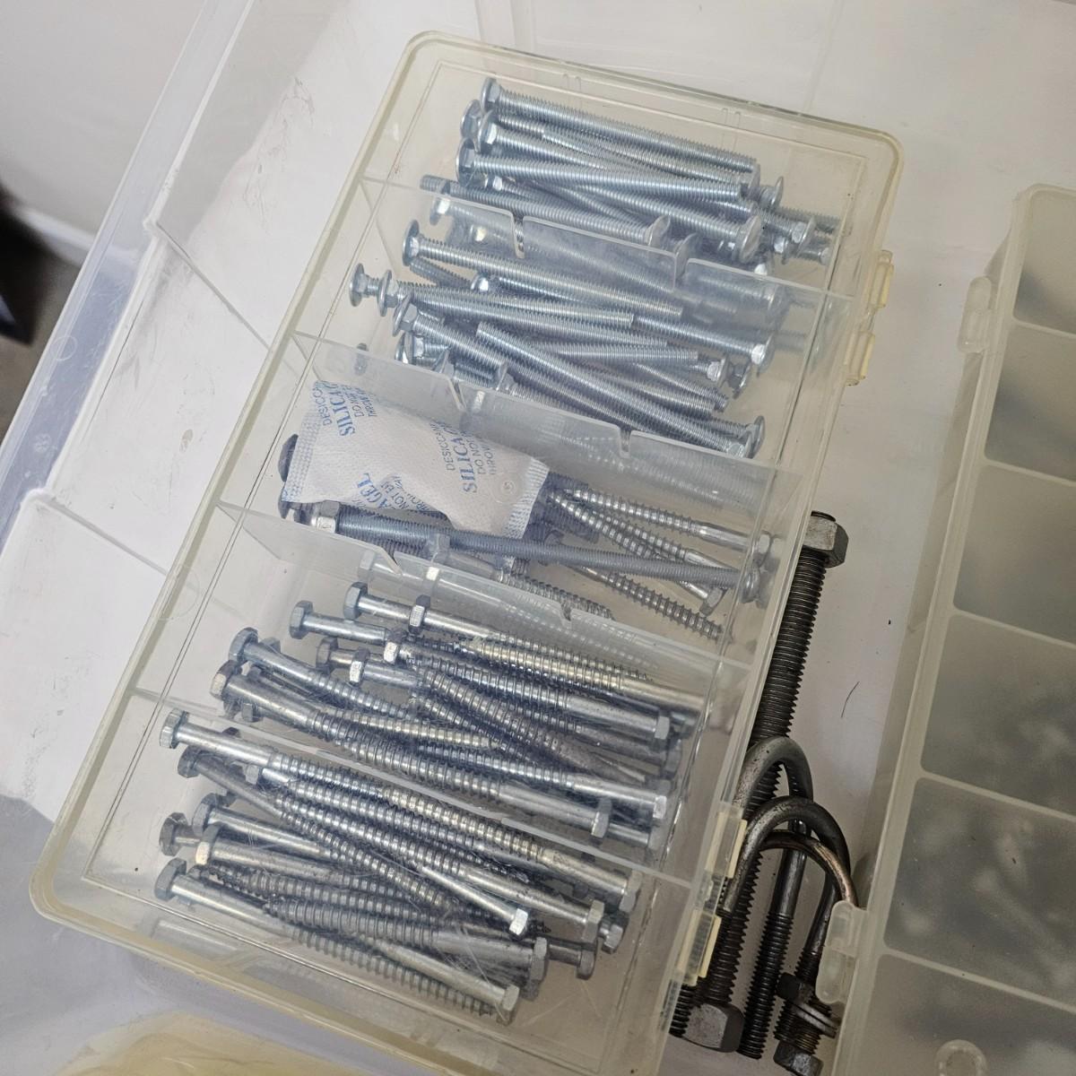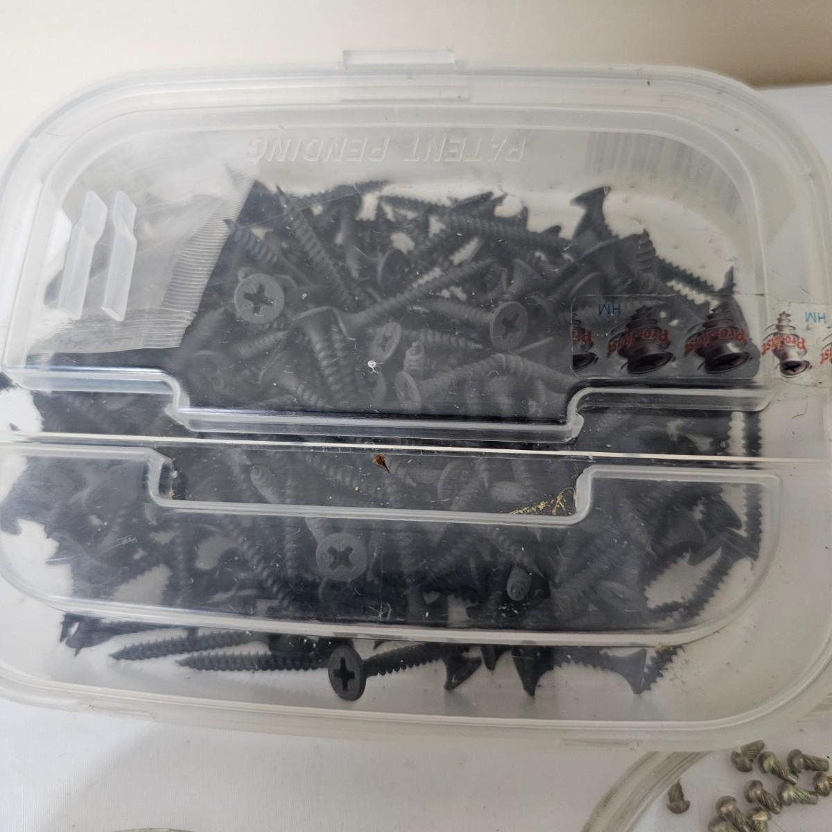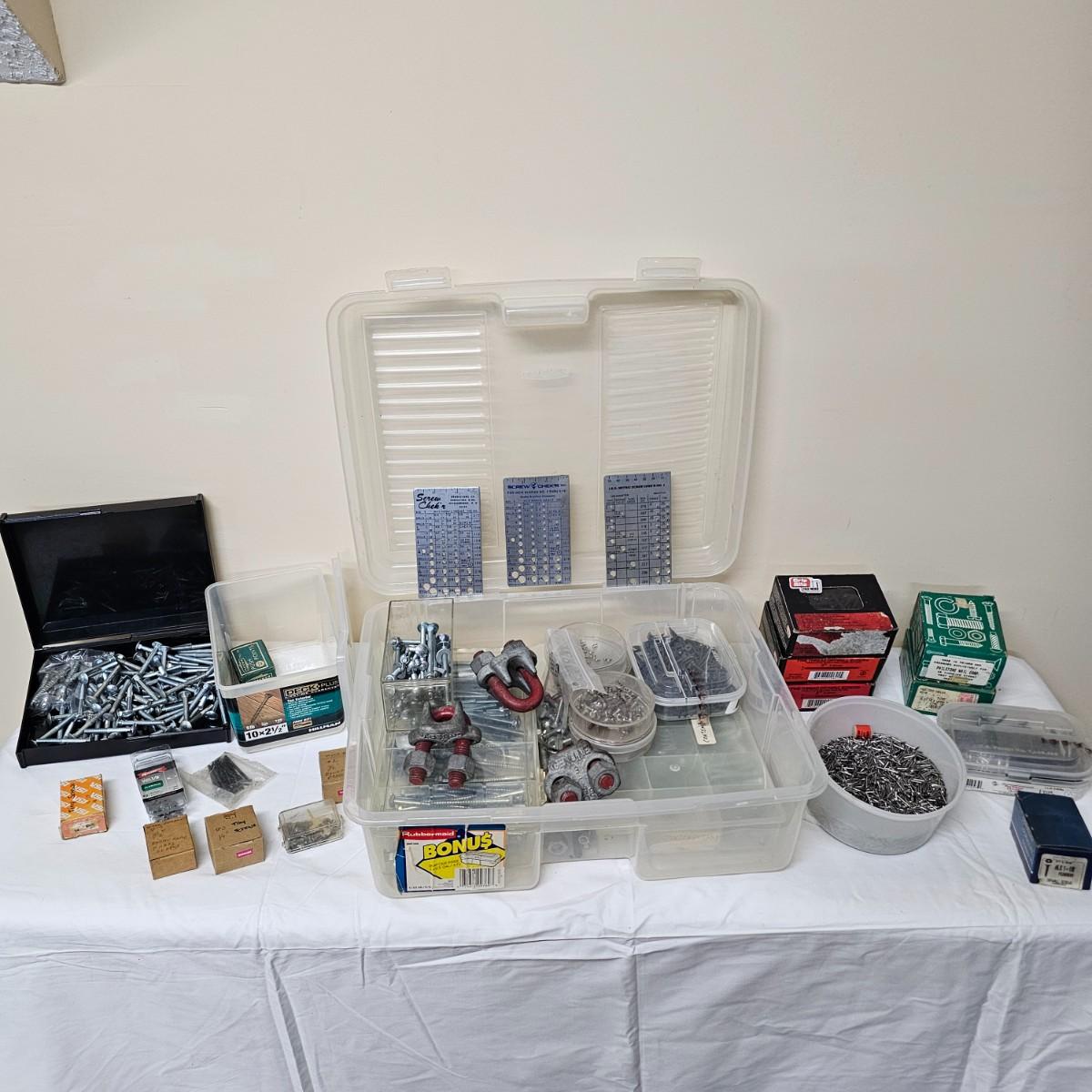 From teeny tiny up to standard sizes, this batch of hardware is well organized. Drywal screws, plastic anchors, cable bolts and more. Three different metal screw size templates. Clear box measures 17" x 14" x 6"H, is included with lot. See photos for details. Local pickup only.
