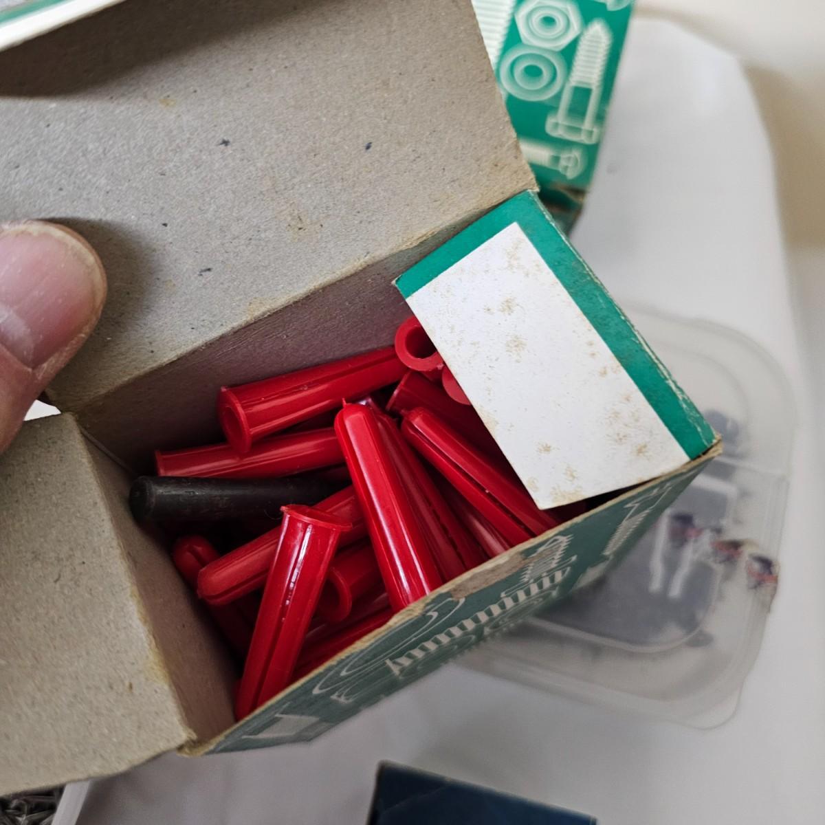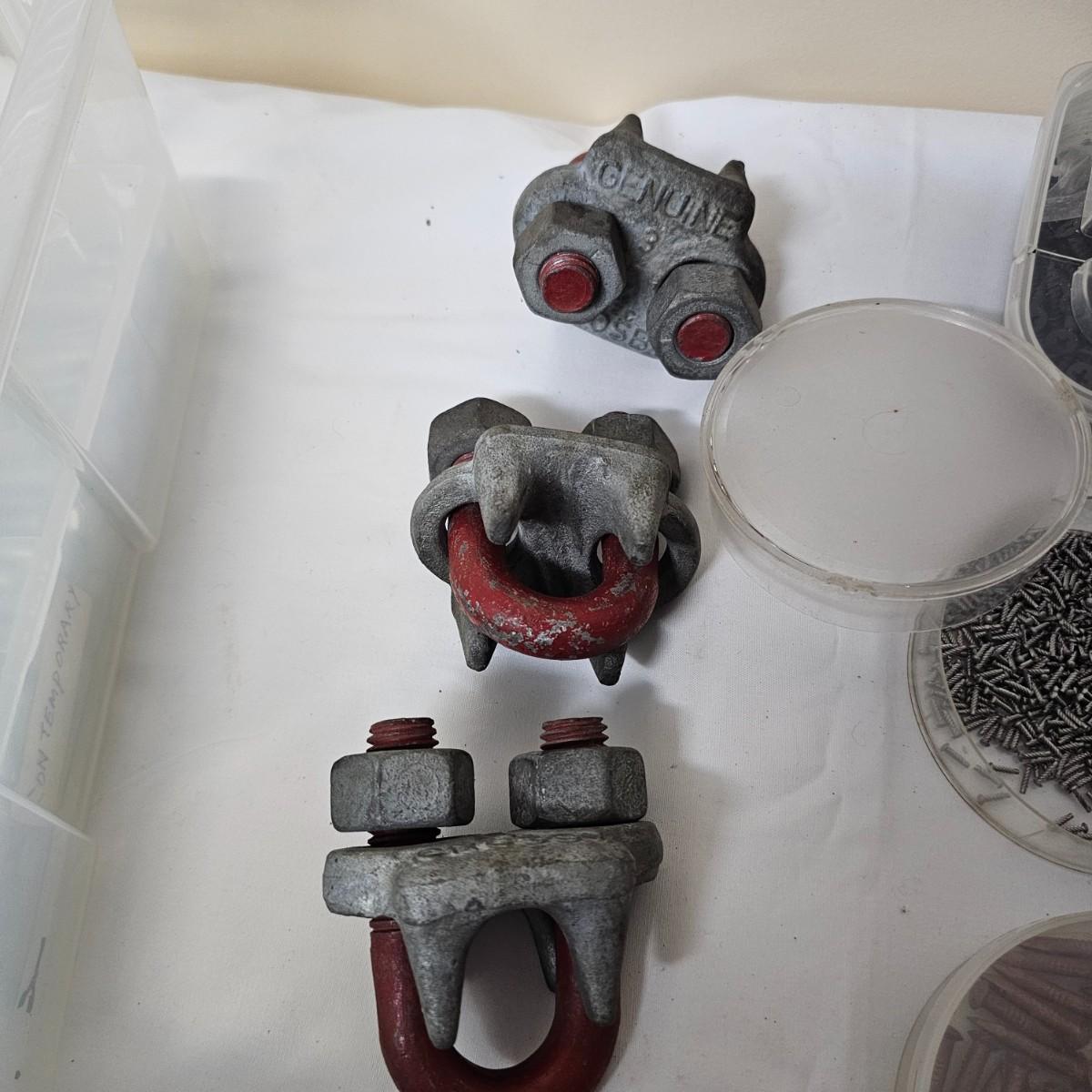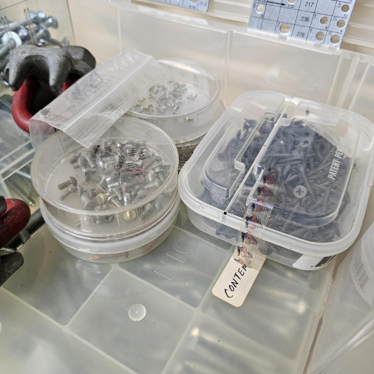 From teeny tiny up to standard sizes, this batch of hardware is well organized. Drywal screws, plastic anchors, cable bolts and more. Three different metal screw size templates. Clear box measures 17" x 14" x 6"H, is included with lot. See photos for details. Local pickup only.