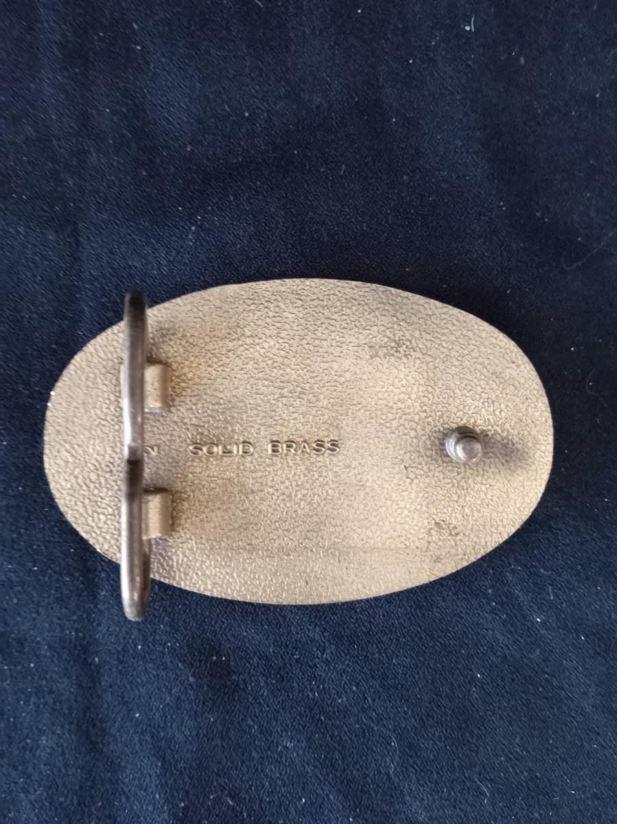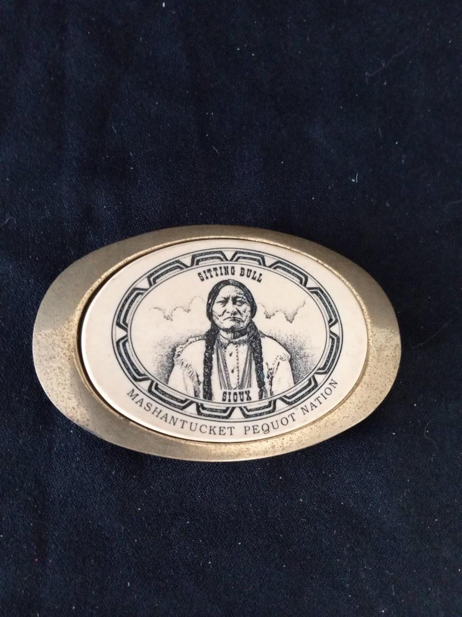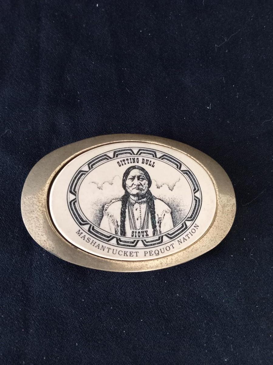 SCRIMSHAW SITTING BULL MASHANTUCKET PEQUOT NATION BELT BUCKLE ON BRASS