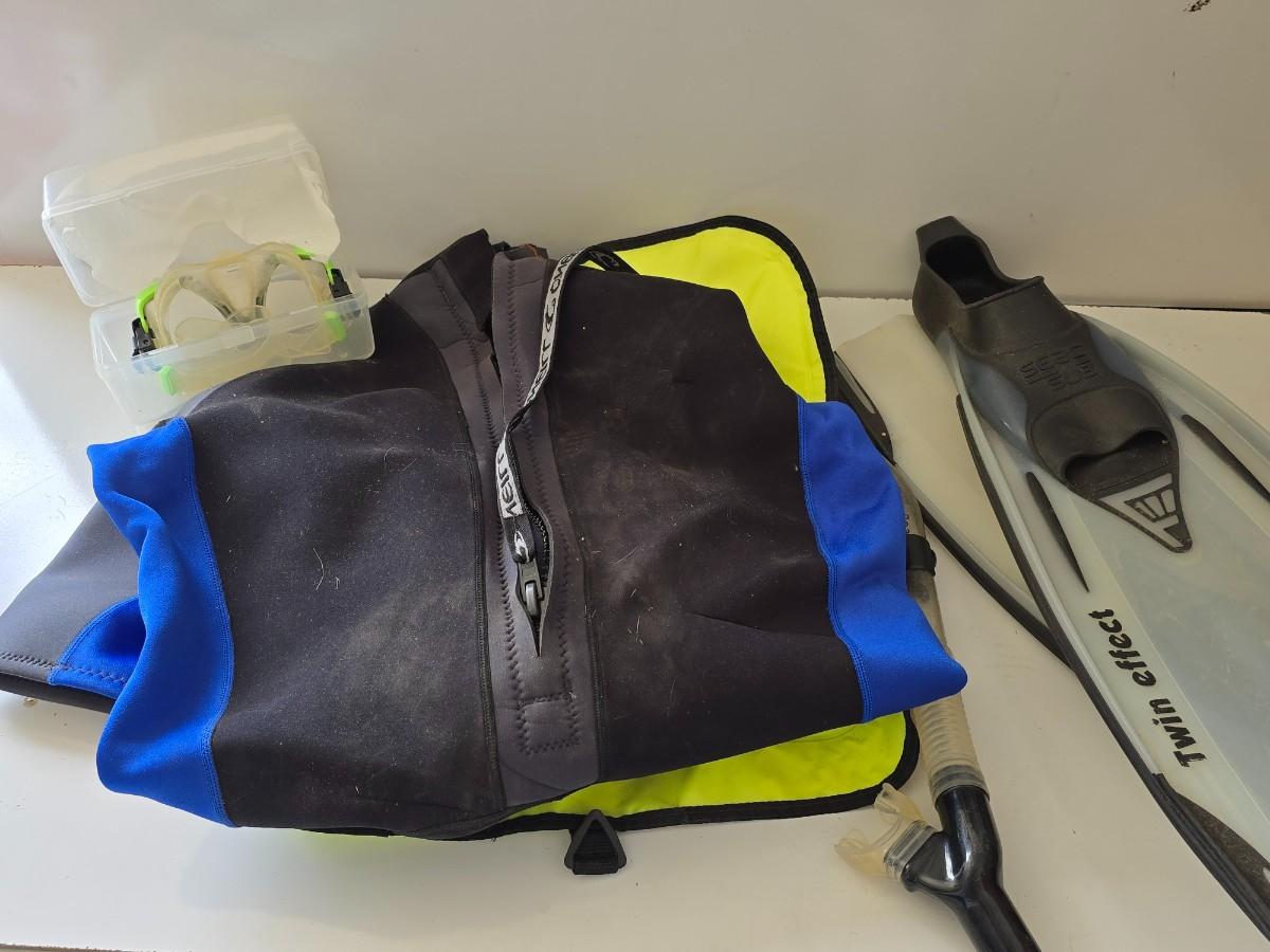 Snorkeling & Scuba Gear Lot – Fins, Wetsuit, Snorkel, Mask (Adult Size)
