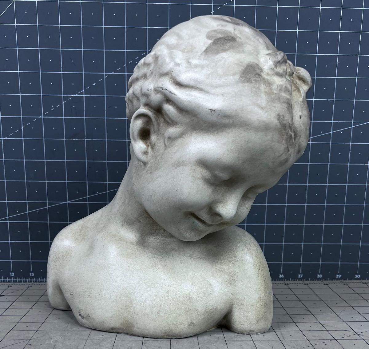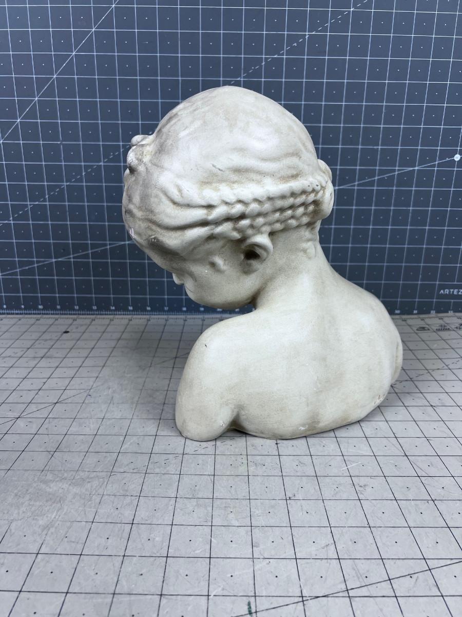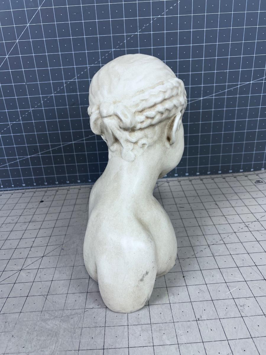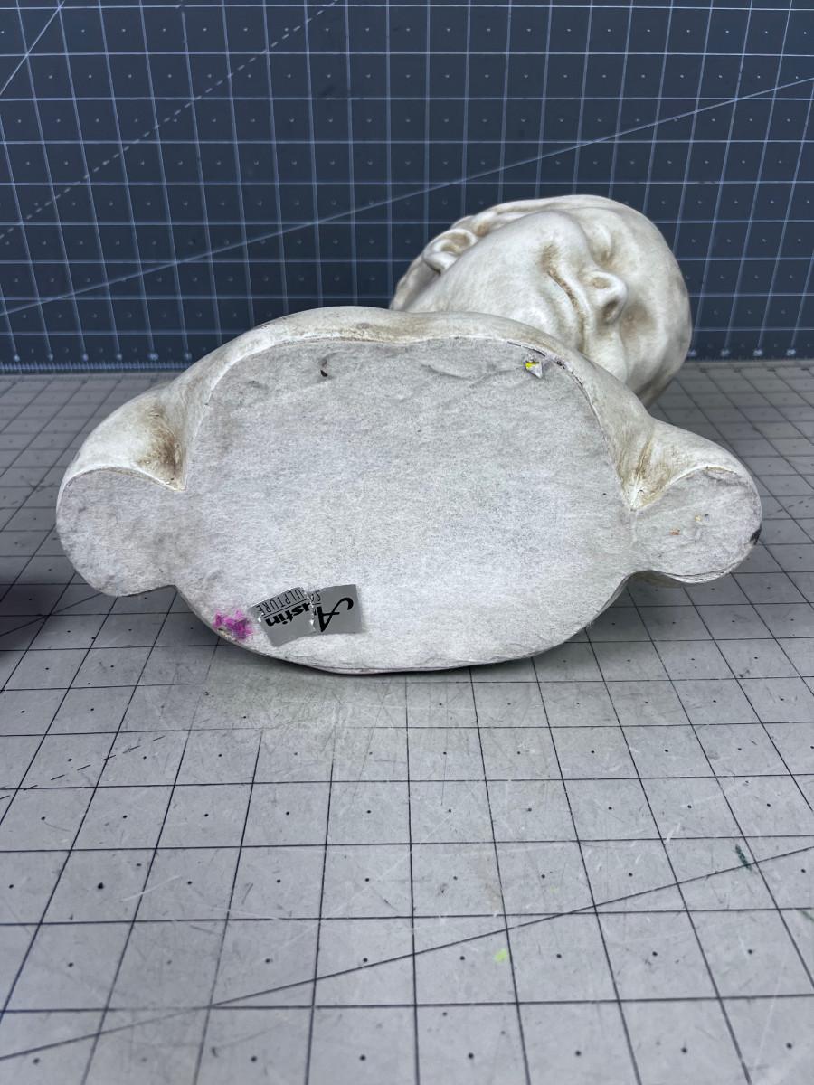 Plaster material Has a small chip on the forehead. 11" Tall about 10" Wide.