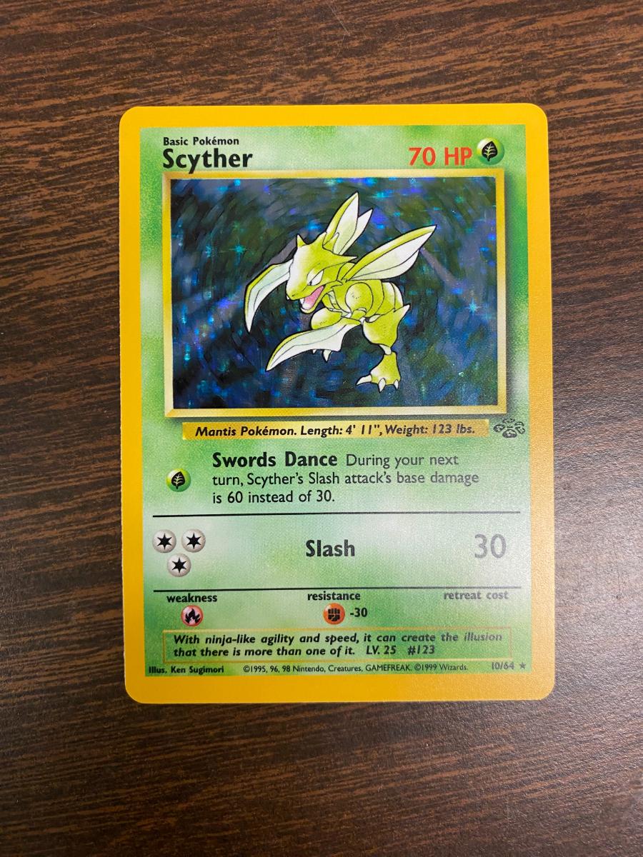Scyther Pokemon Trading Card, Jungle Edition, holographic variant. HP 70. Card number 10/64. Manufactured by Wizards of the Coast, year 1999. Card shows condition as light play, with noticeable signs of minor handling and wear on edges. The back exhibits minor scuffs, typical for lightly played cards.
