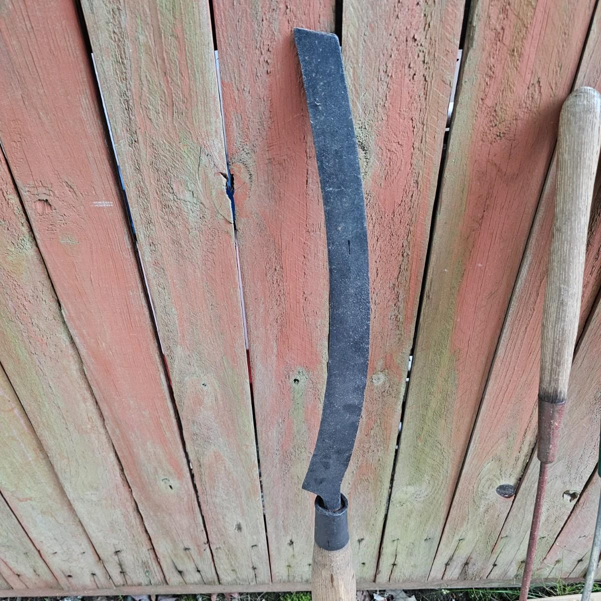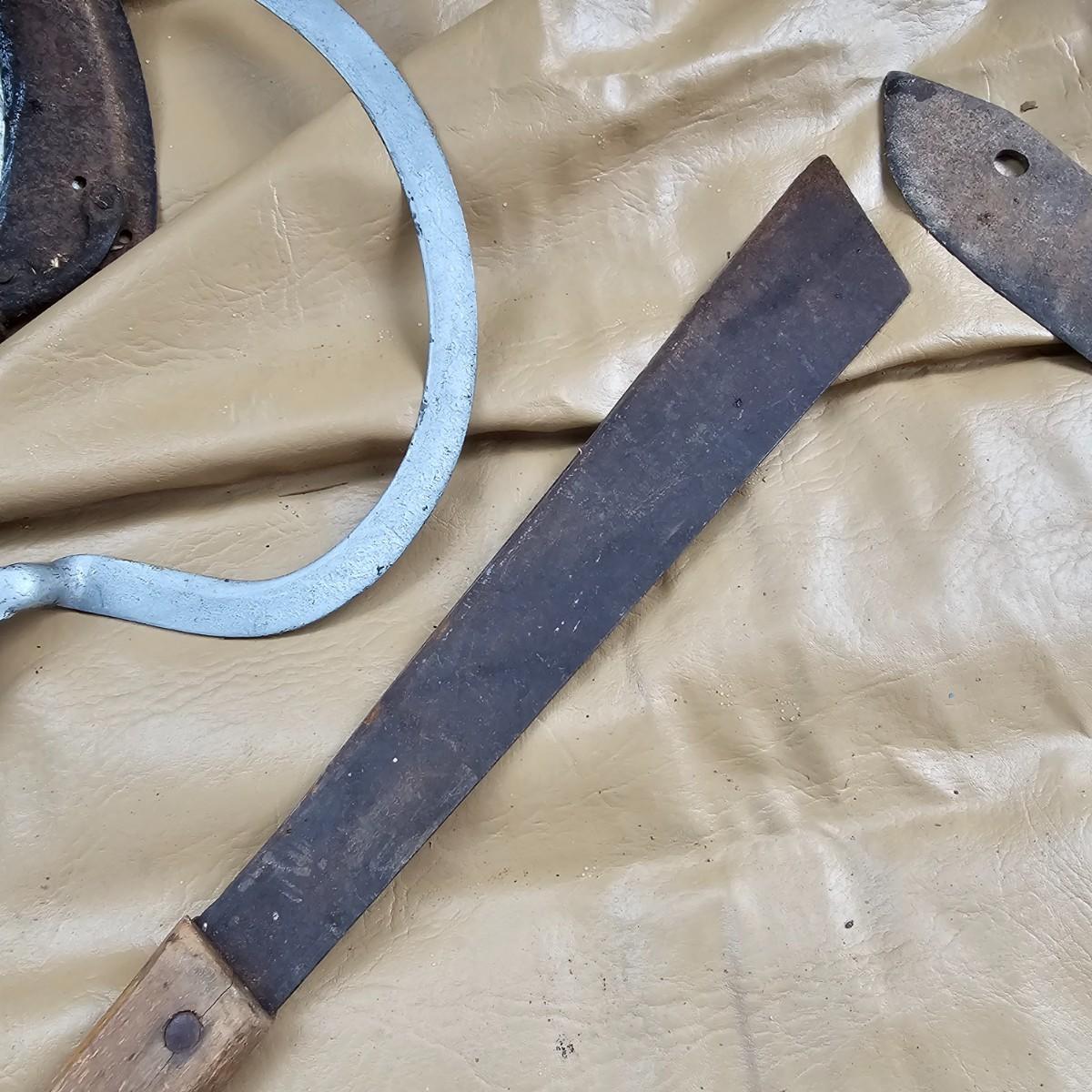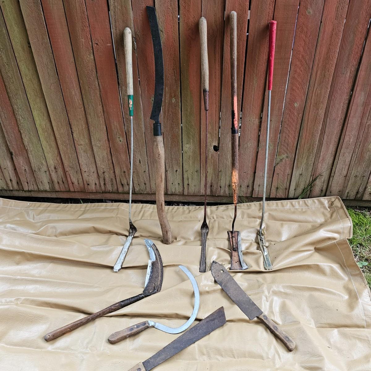 Older style 'whip' weed cutters, metal blades with cutting edges both sides. Two hand scythes, two machetes, longest is 21". Tall tool with wood handle and curved blade is 39" long. See photos for details. Local pickup only.