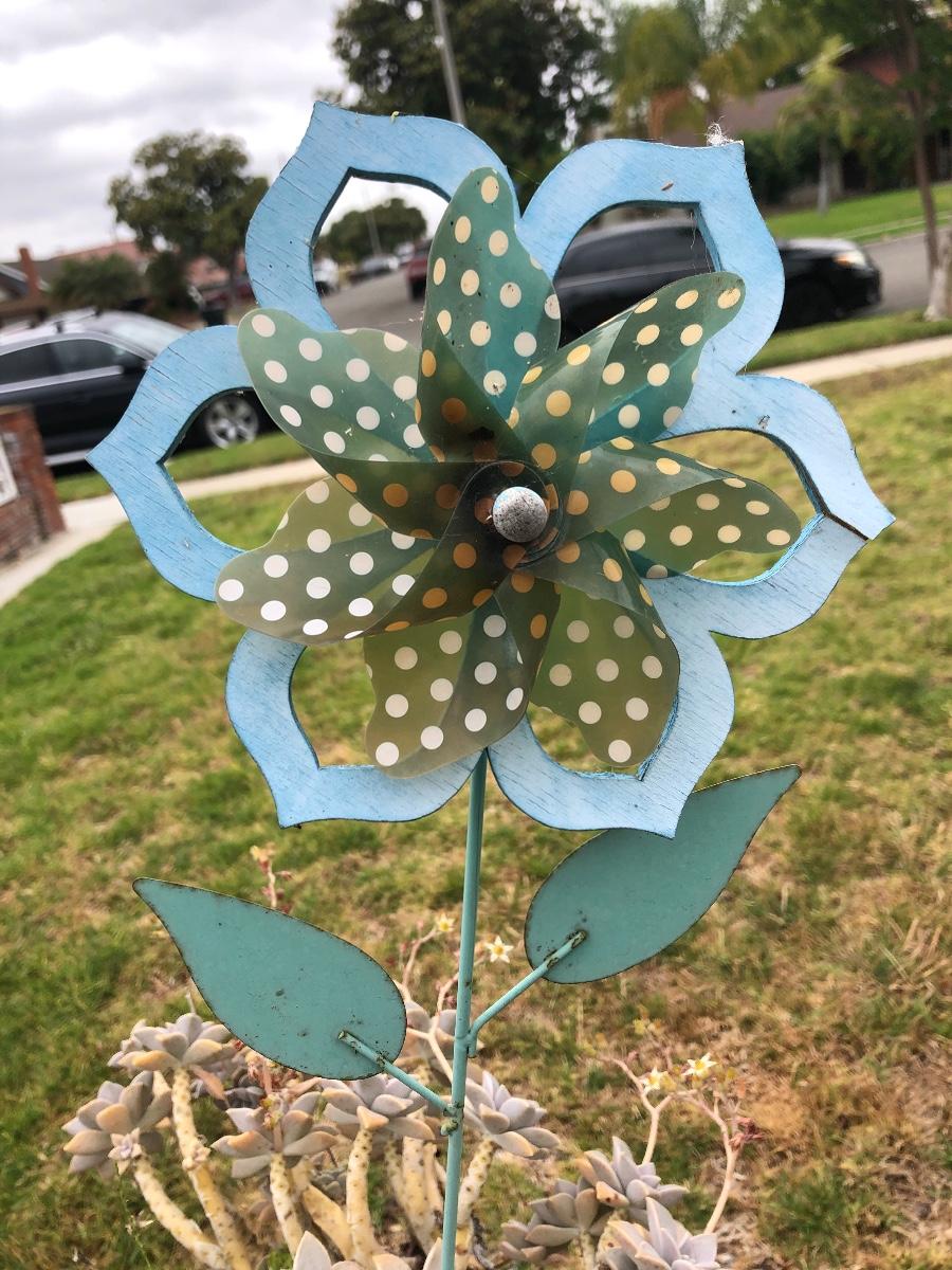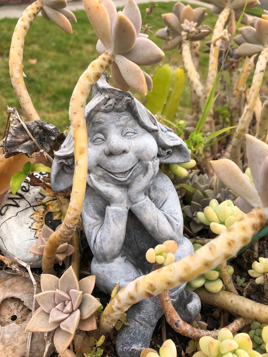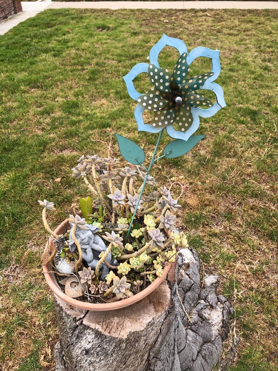 Pot full of succulents and garden art - "welcome" rock and Fairy