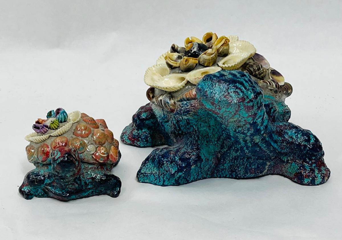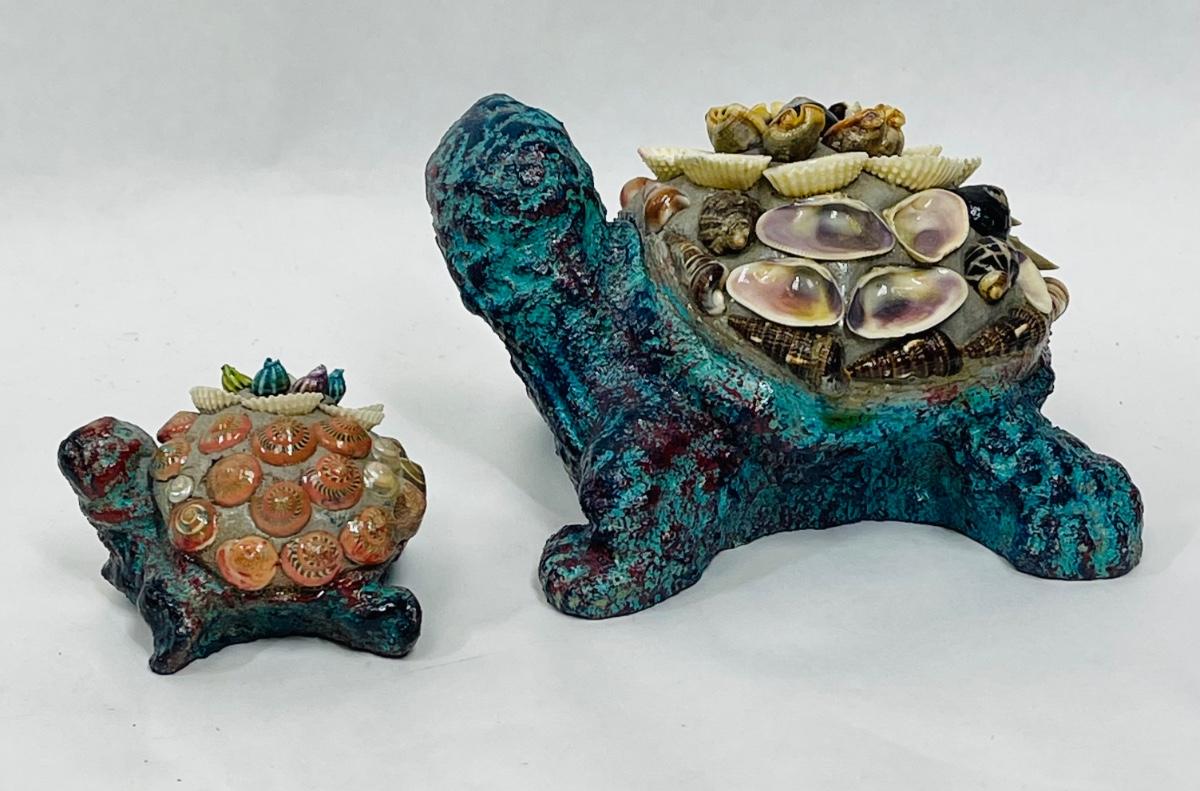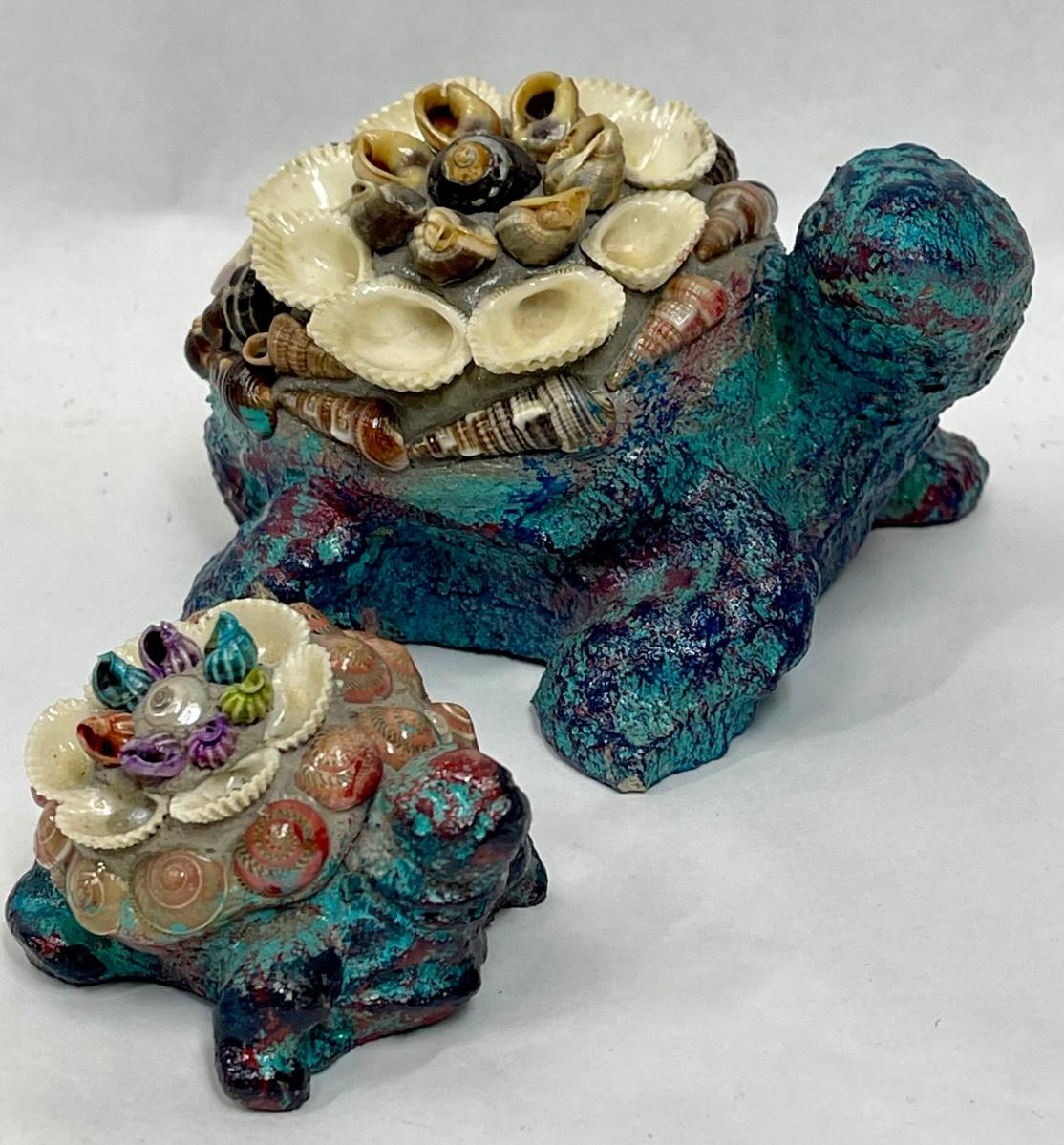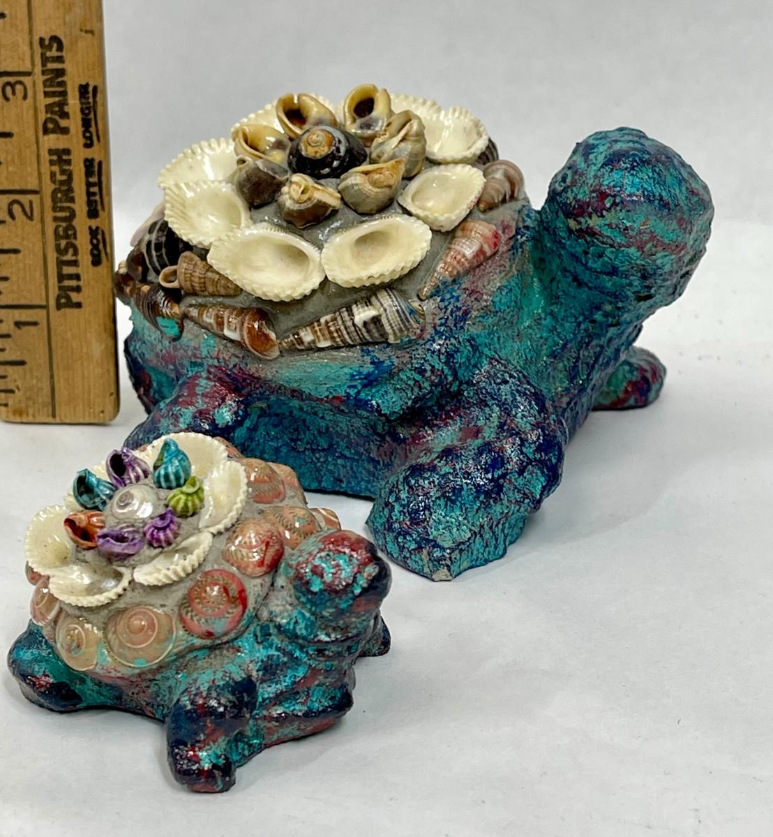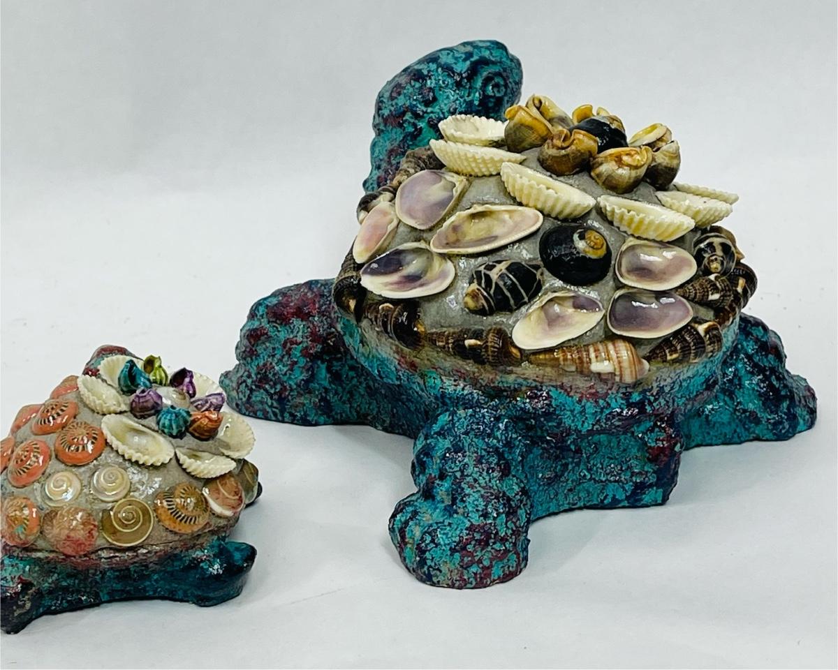 Heavy Resin or Concrete Turtle Figurines (Parent & Child) with Encrusted with Seashell Design