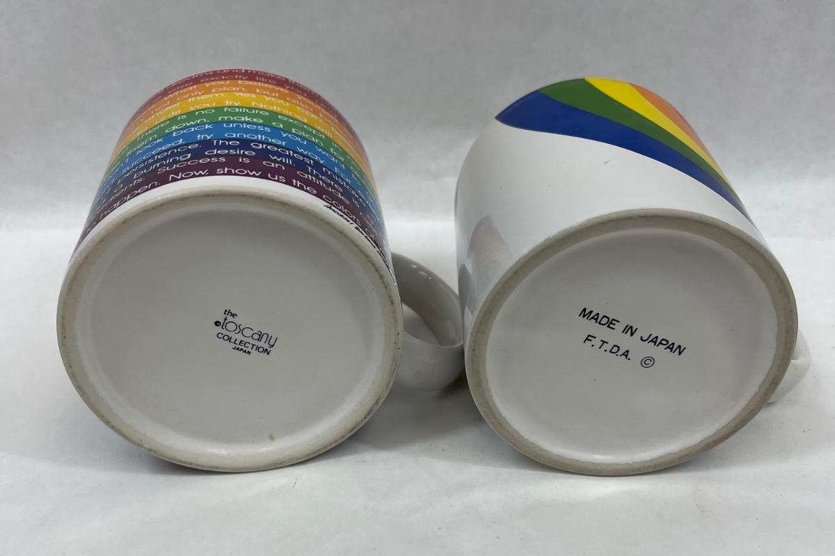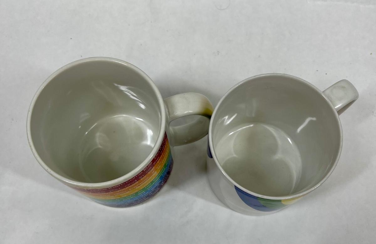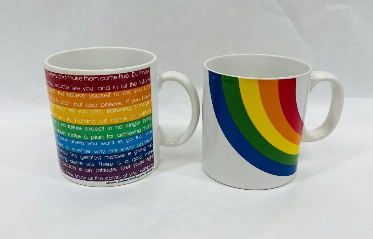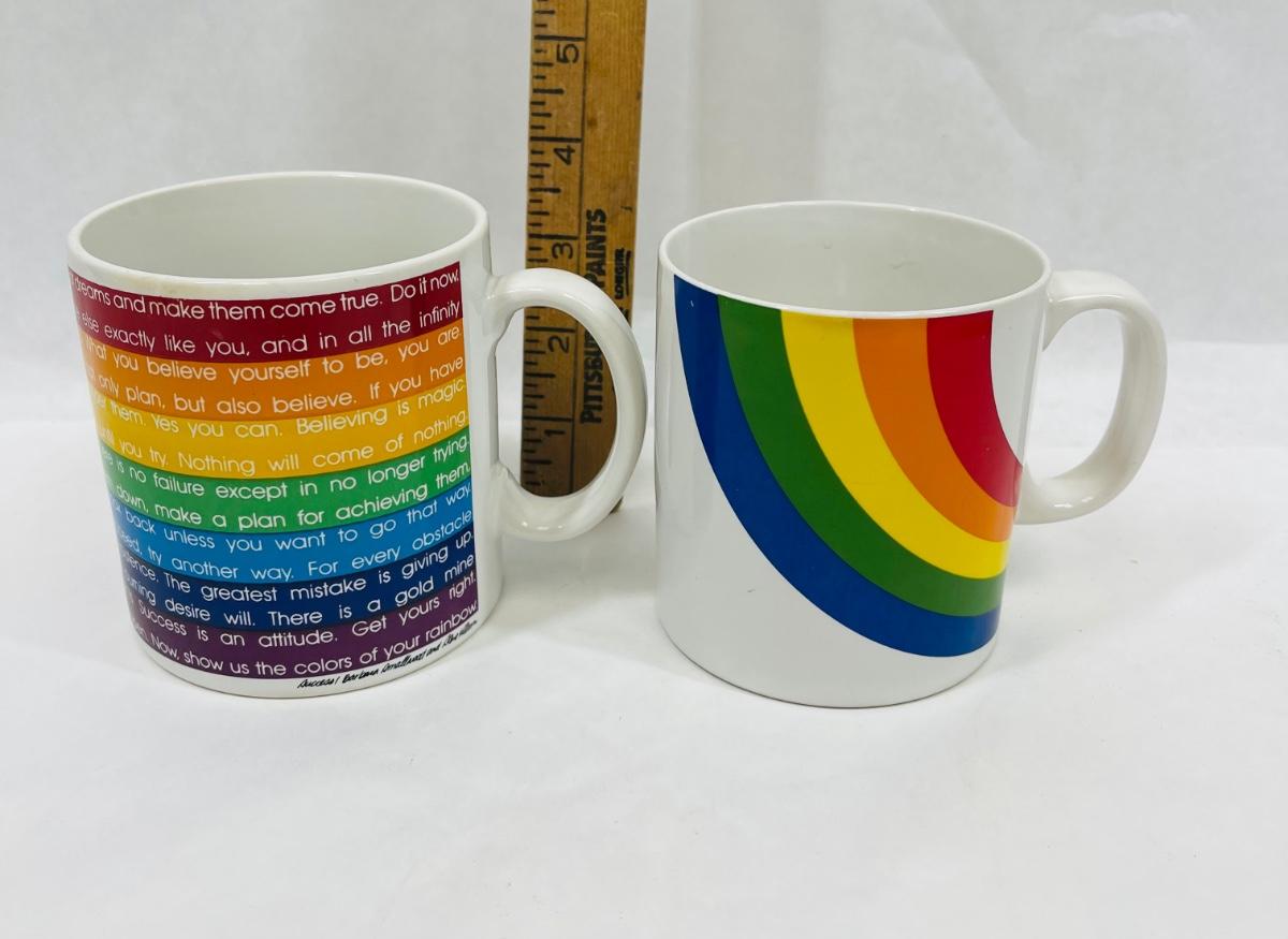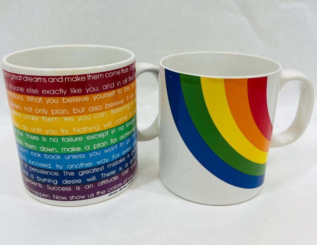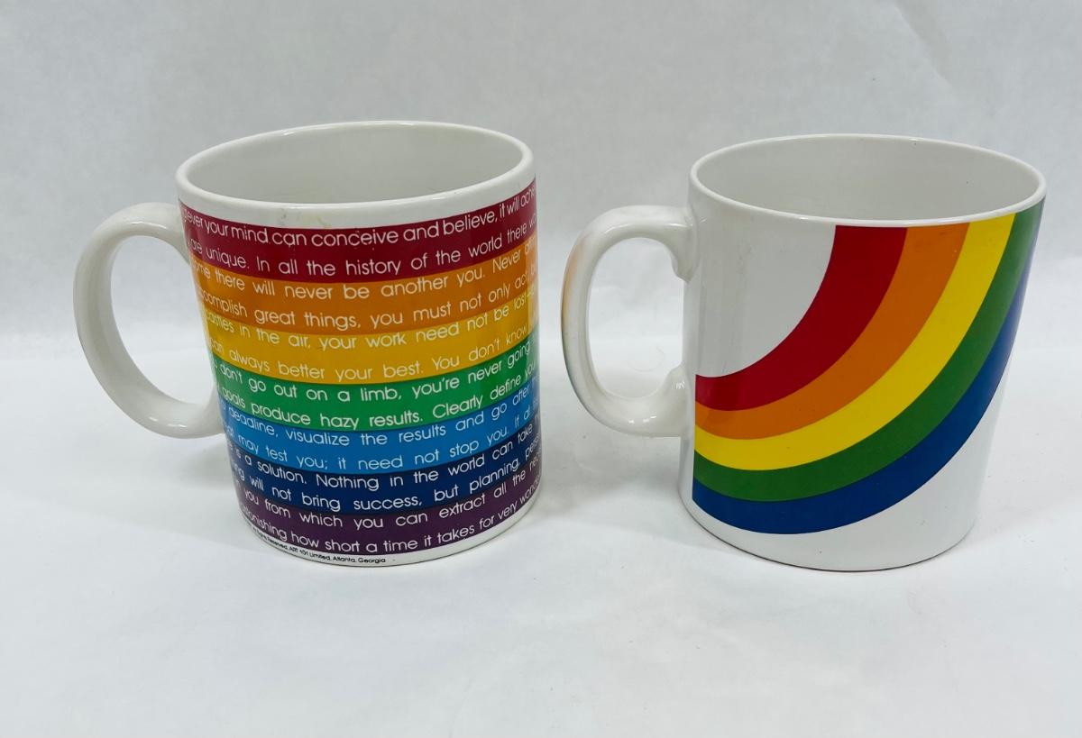 One cup has inspirational comments about success, the other is a stylized rainbow. Both in near-new condition.