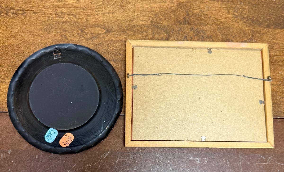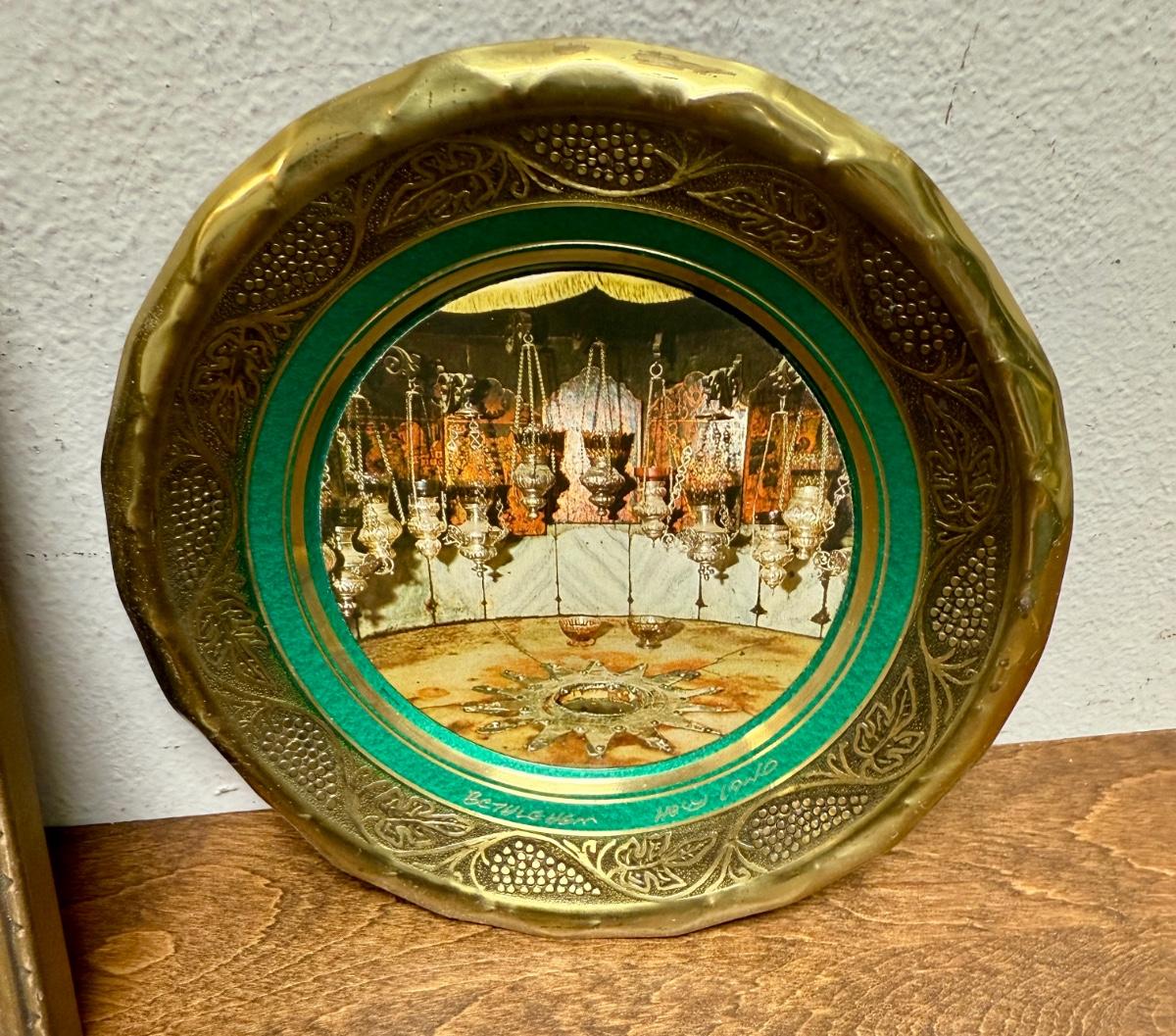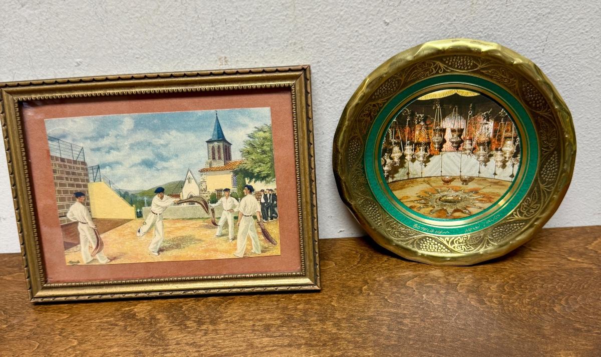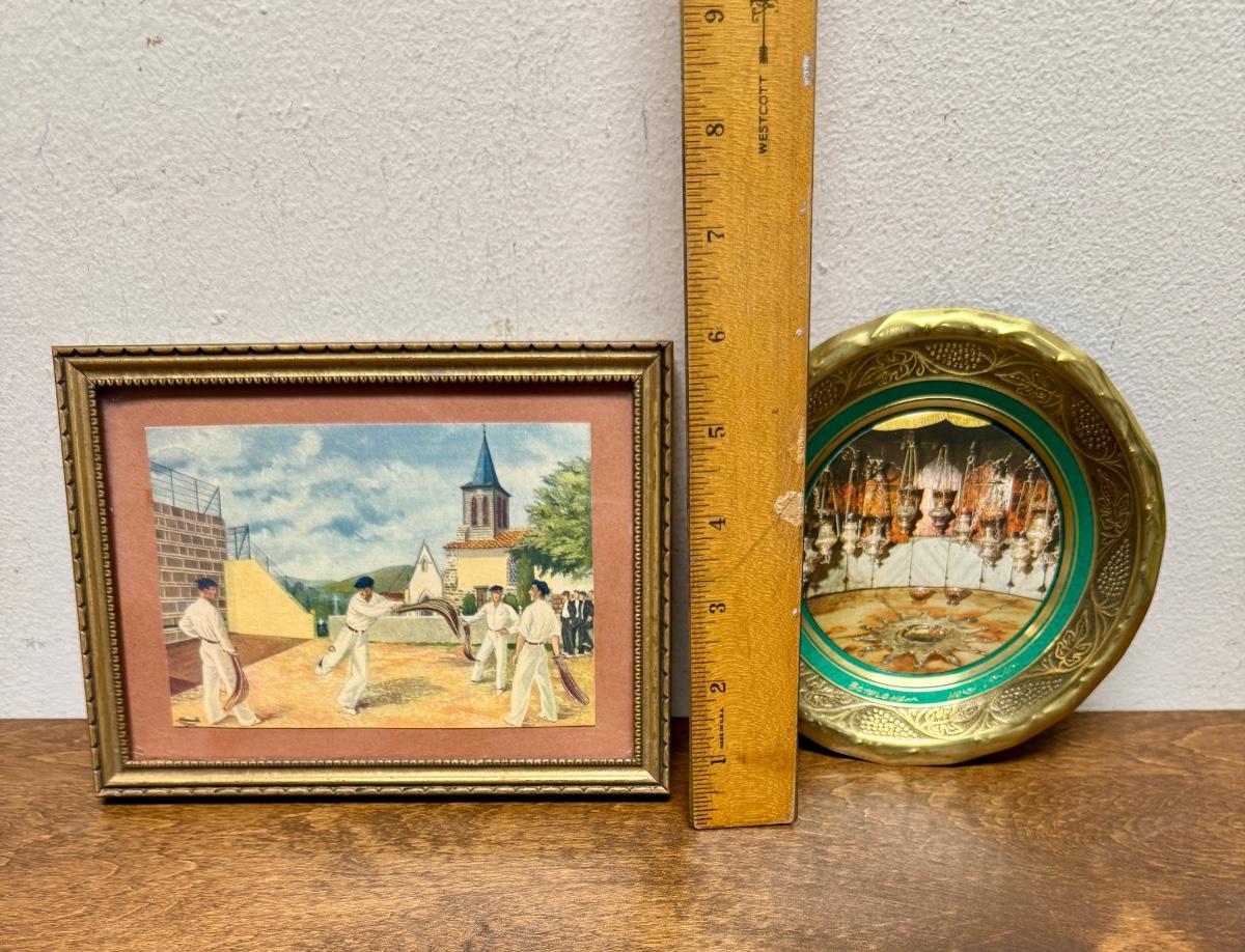 Vintage Bethlehem Nativity Church Plate Trinket Tray and Small Framed French Basque Pelota Artwork Wall Hang