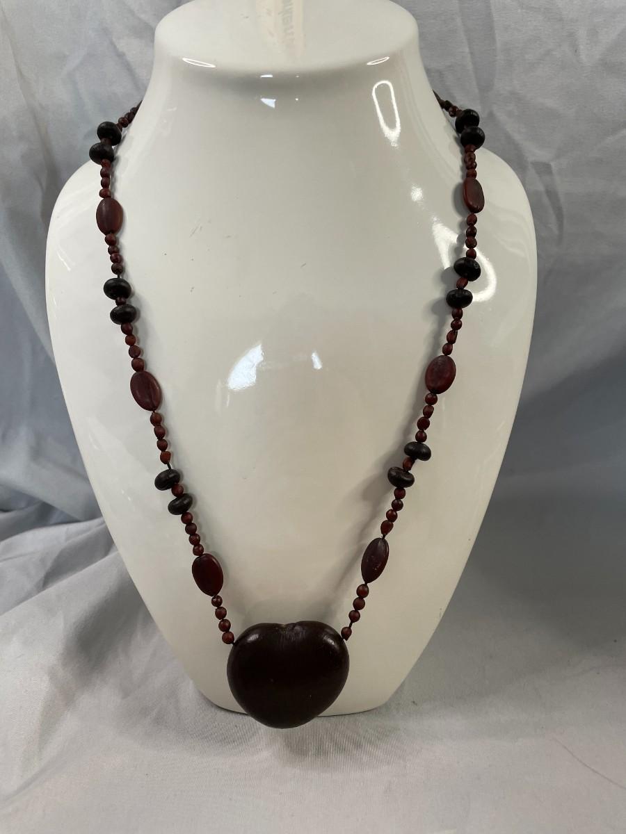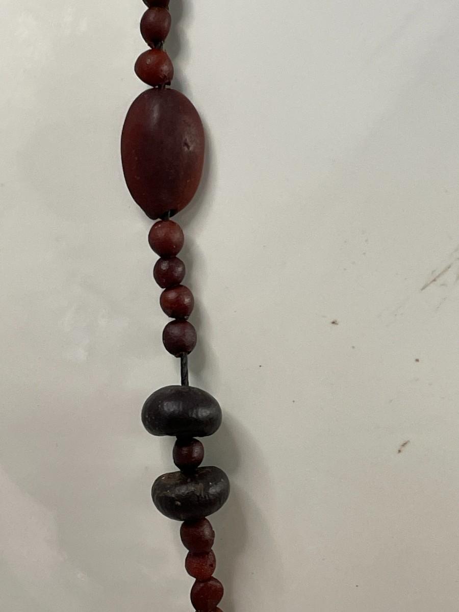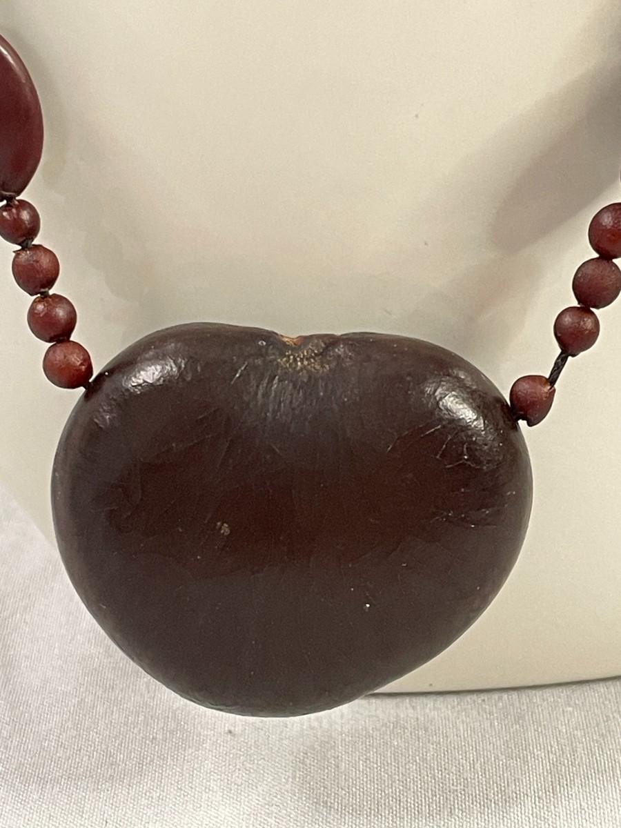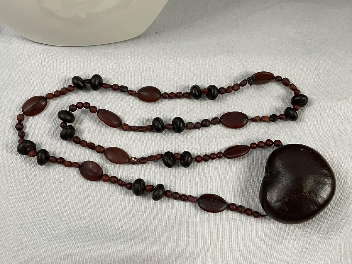 Drift seeds are mostly produced by tropical trees and they are found on distanct beaches after traveling thousands of miles on ocean currents. The center seed bean on this necklace is about 2 inches wide by 1.5 inches tall. The necklace is about 25 inches long.