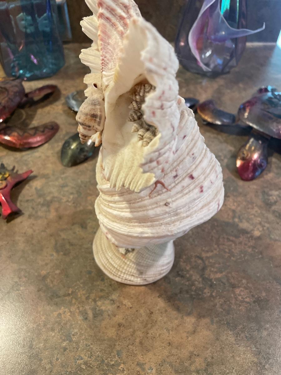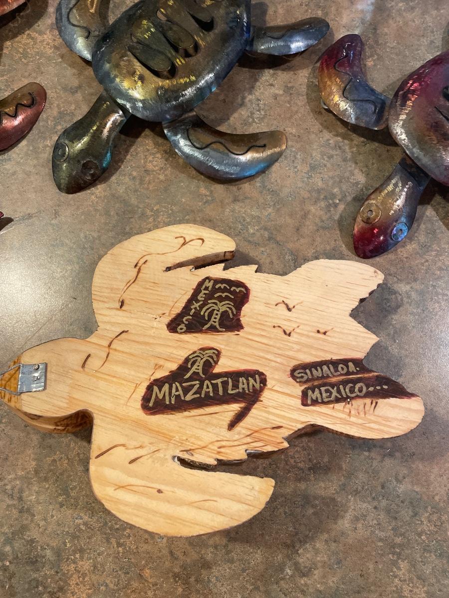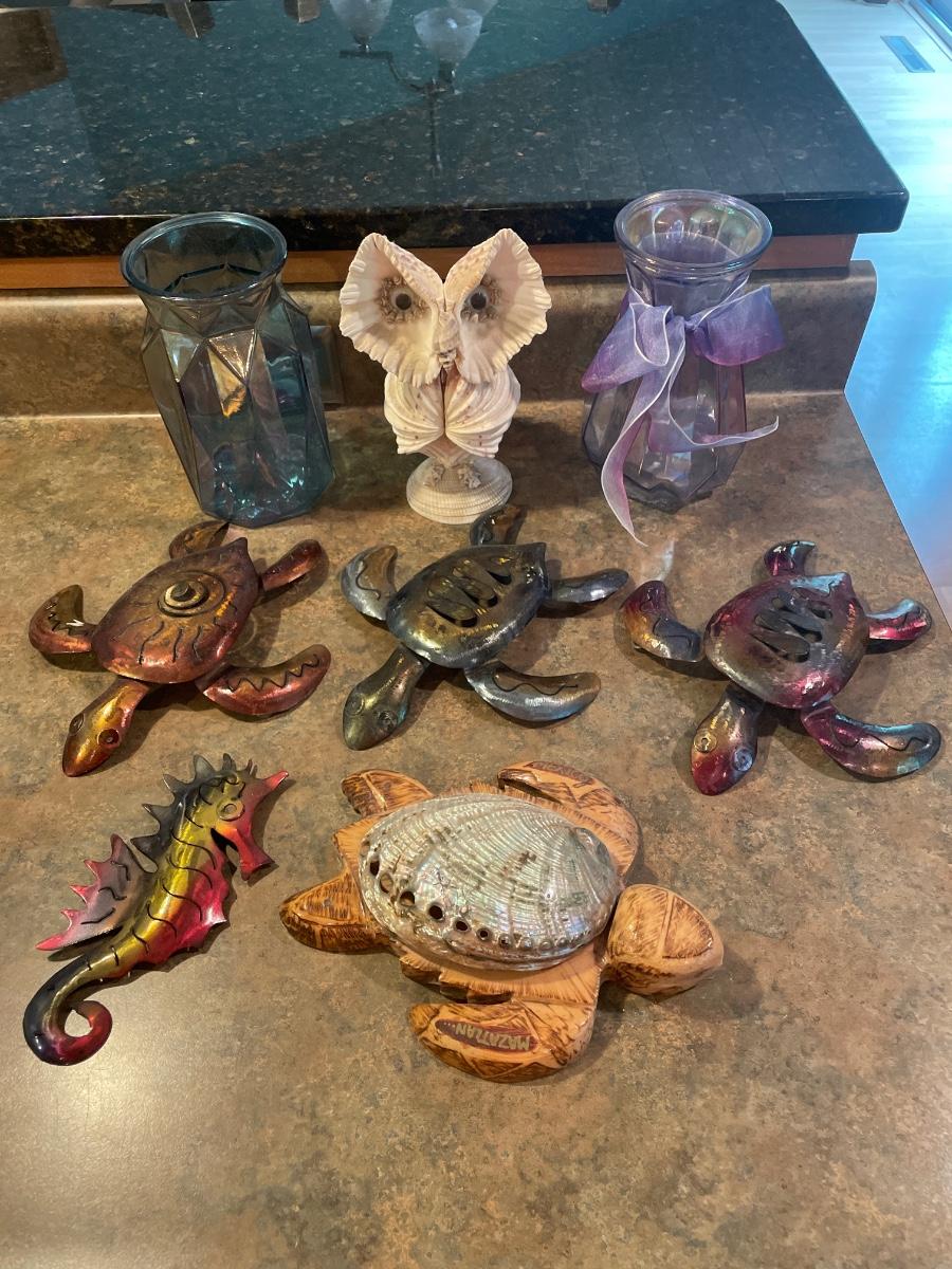 Owl is made out of sea shells . Turtles are metal the turtle in front is made out of wood