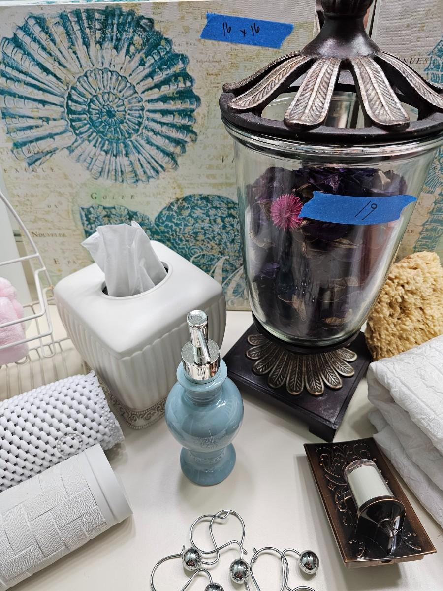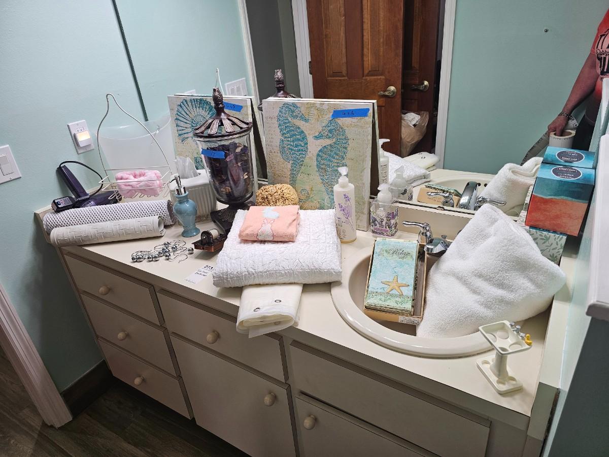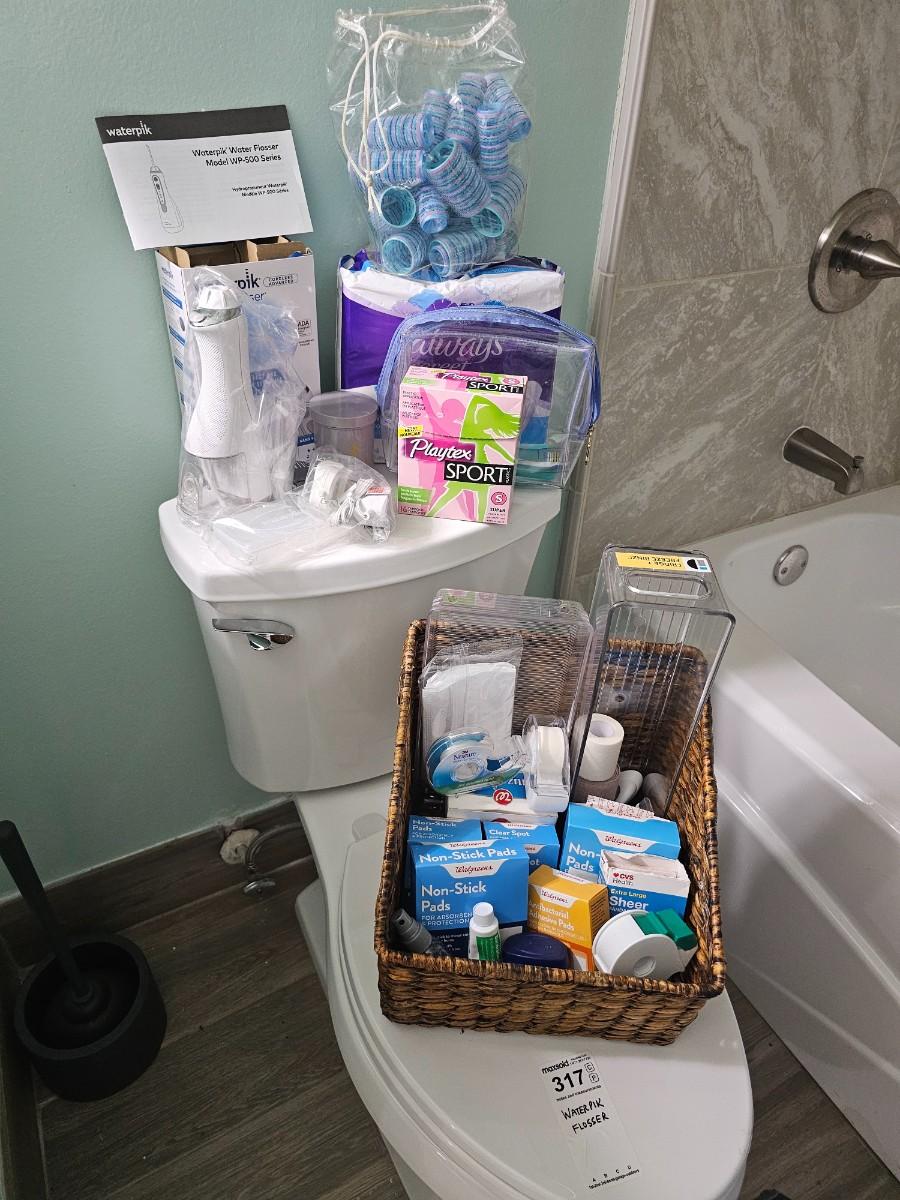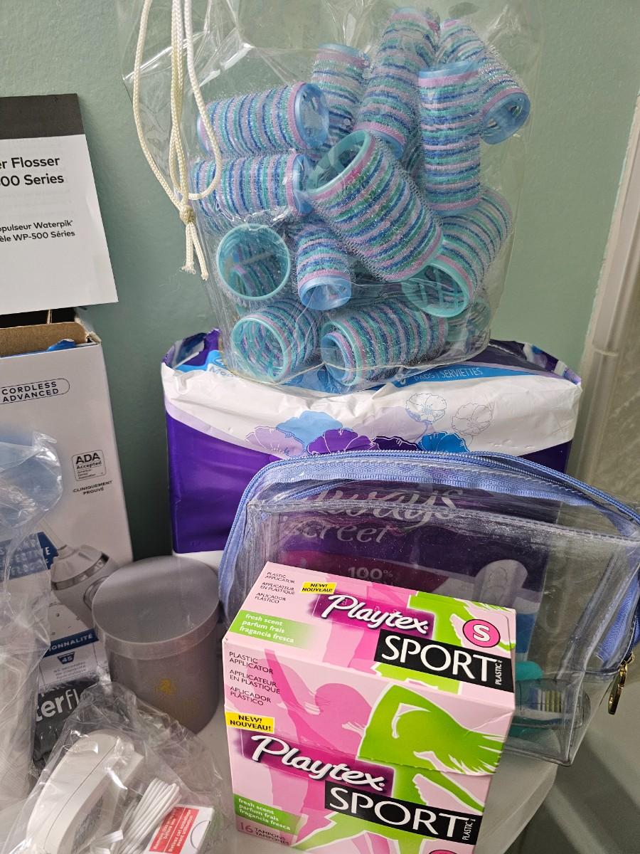 Misc bathroom items, linens, vase, personal hygiene items, medical supplies, new Water Pic in the box, curlers