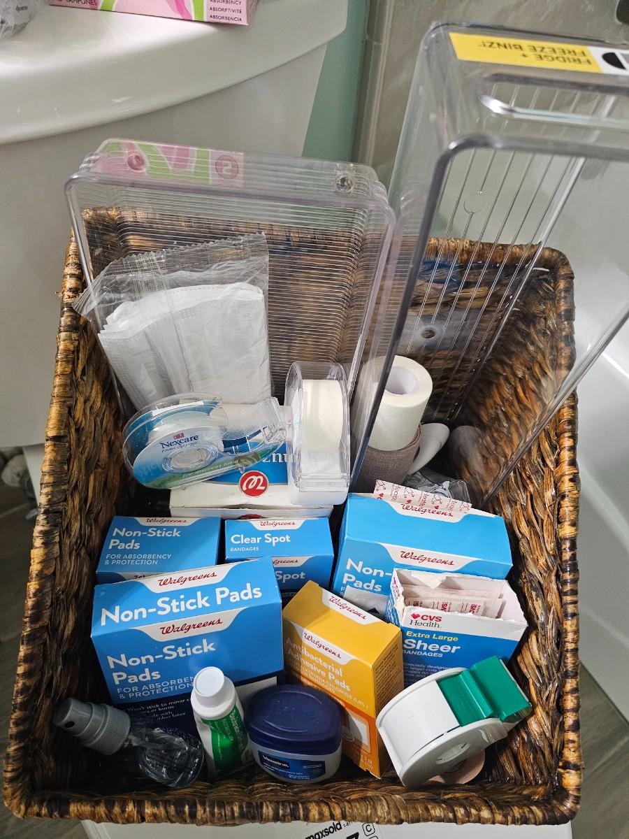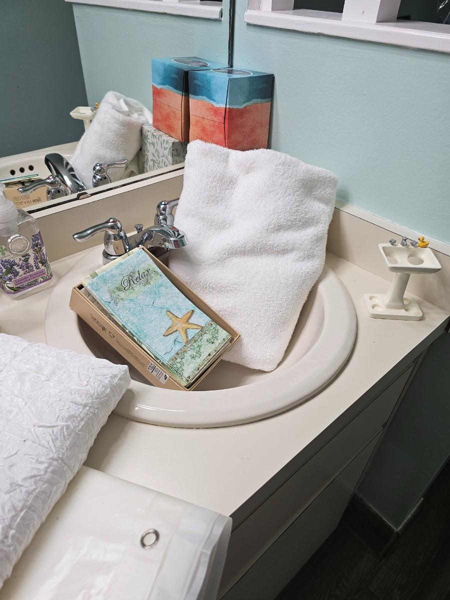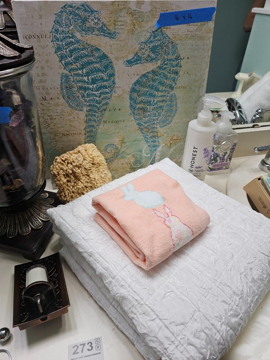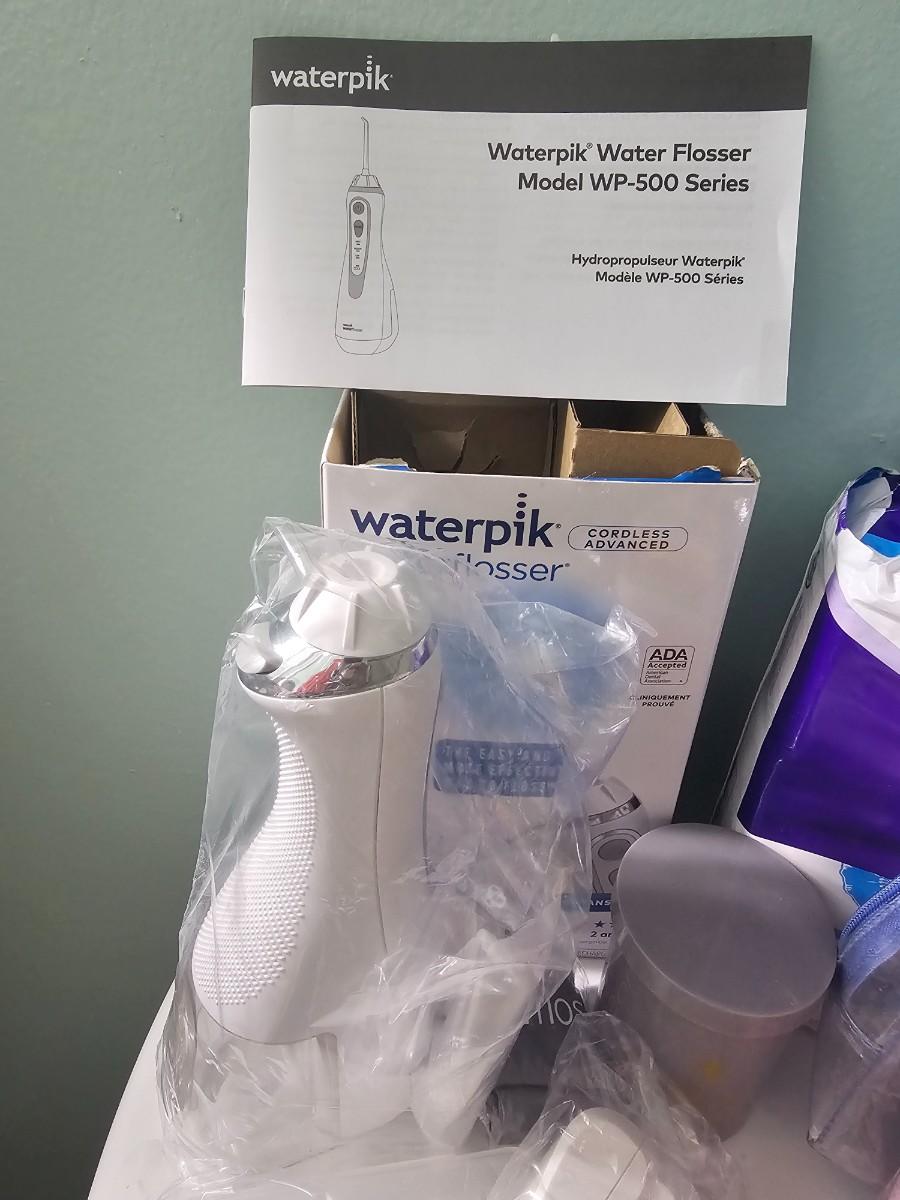 Misc bathroom items, linens, vase, personal hygiene items, medical supplies, new Water Pic in the box, curlers