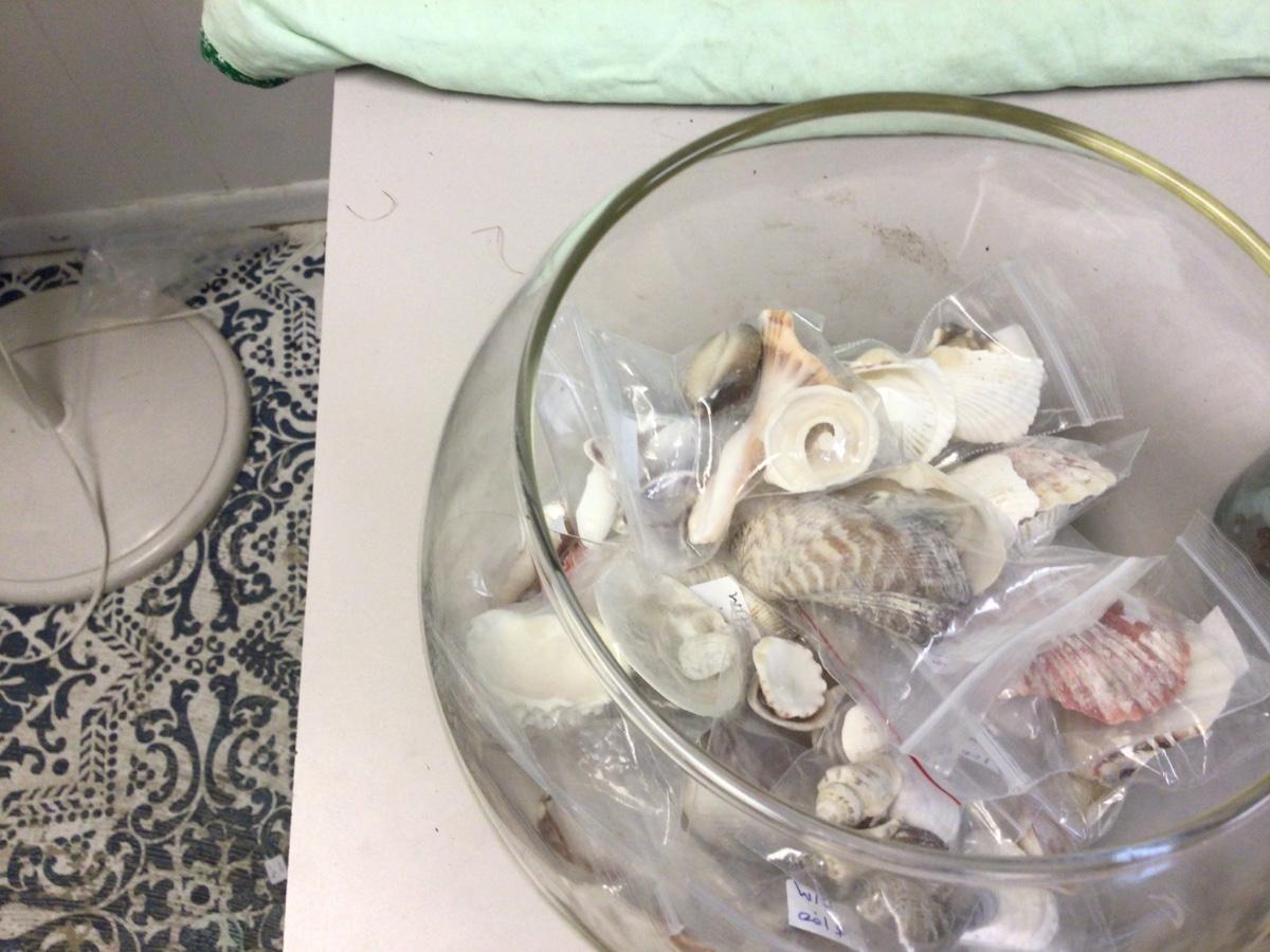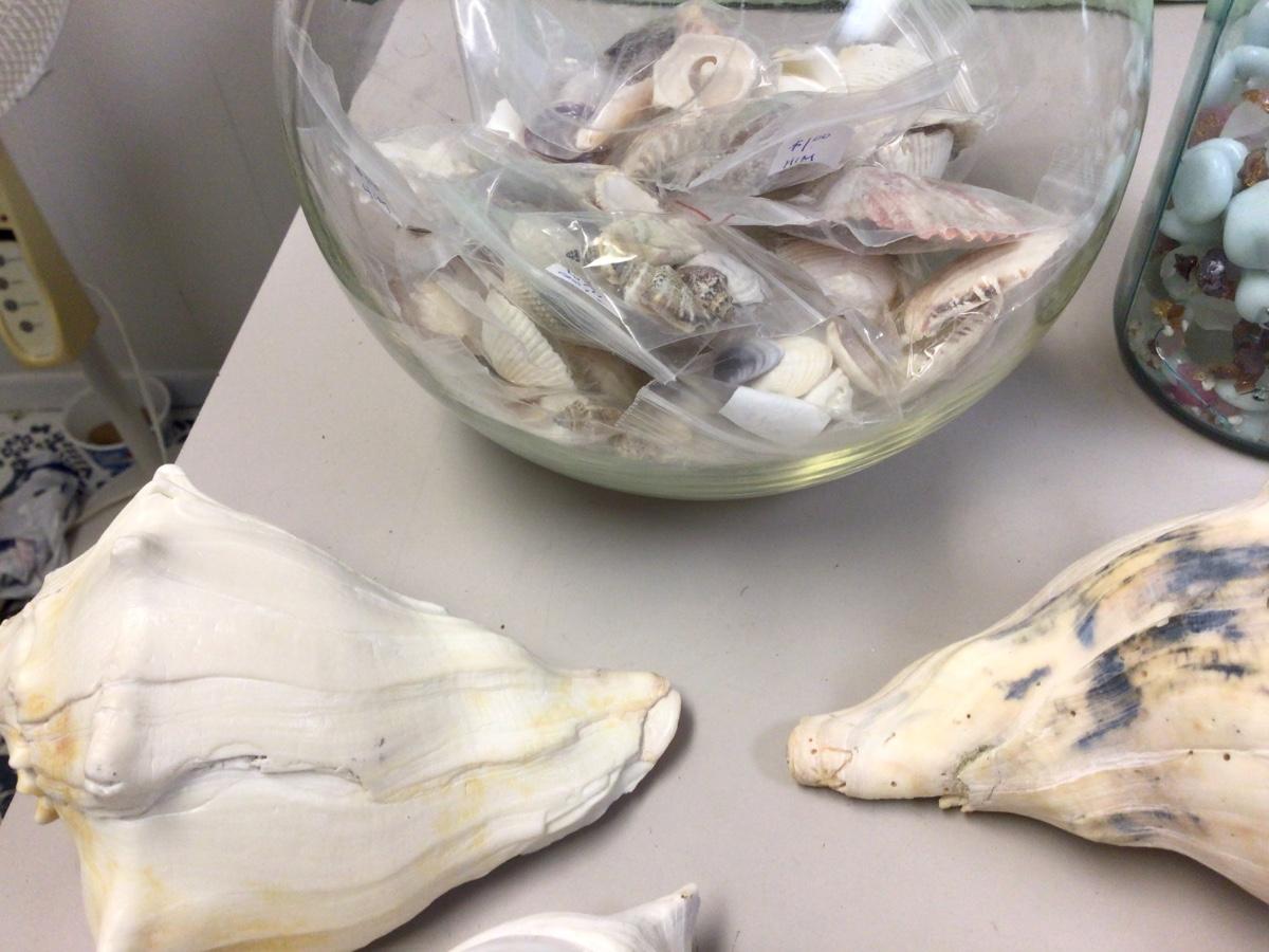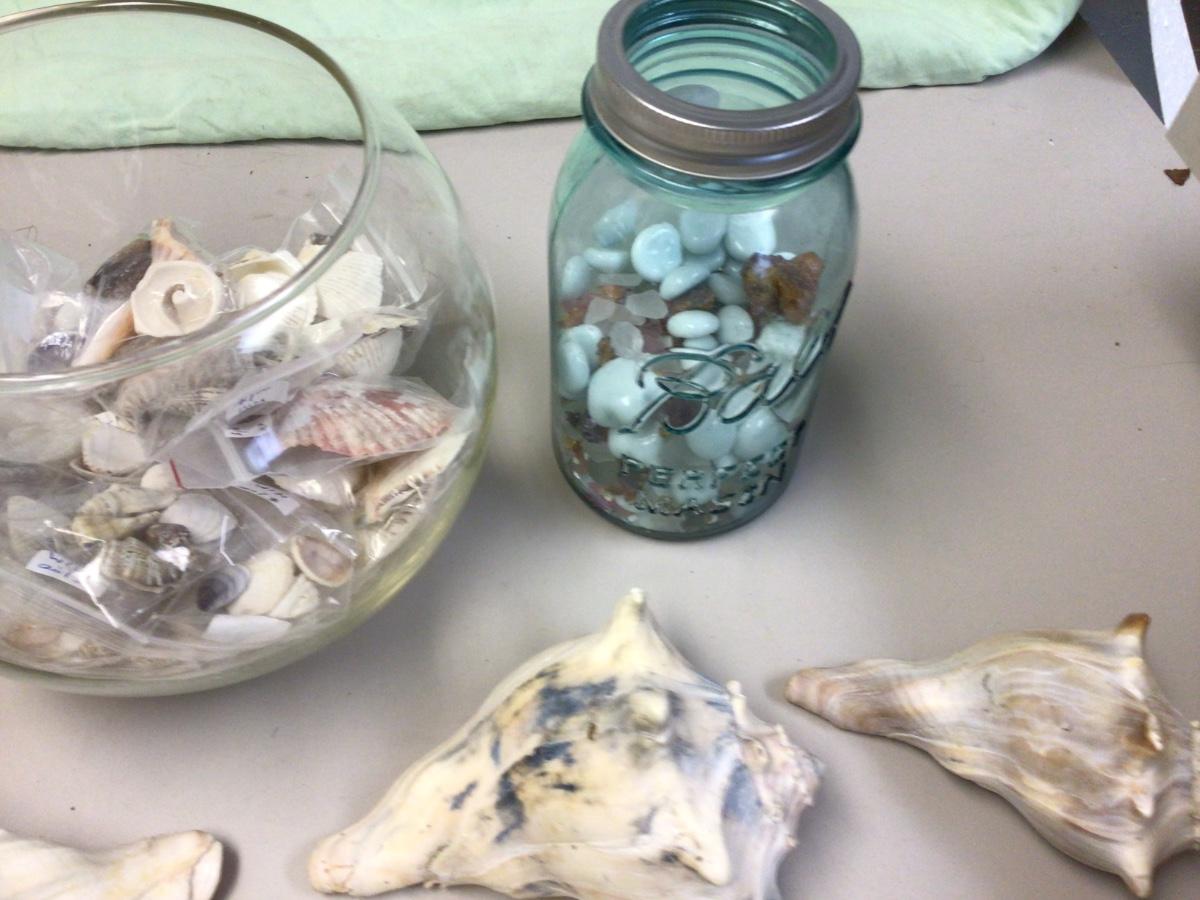Great lot of shells, and fish bowl, and canning jar with stones.