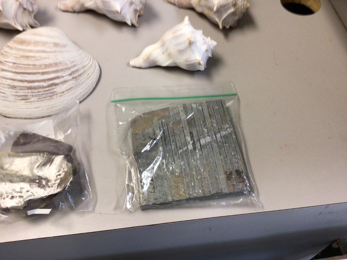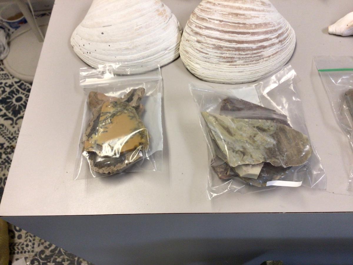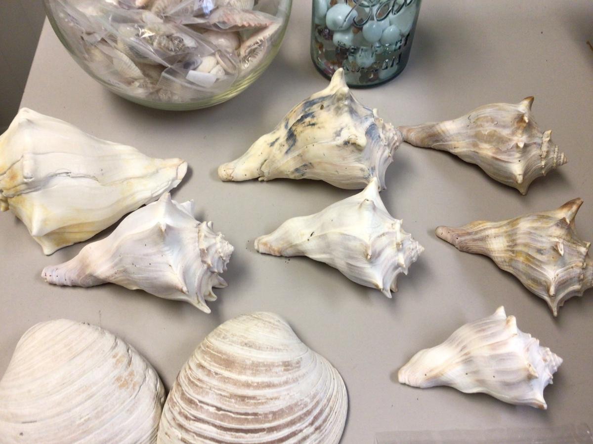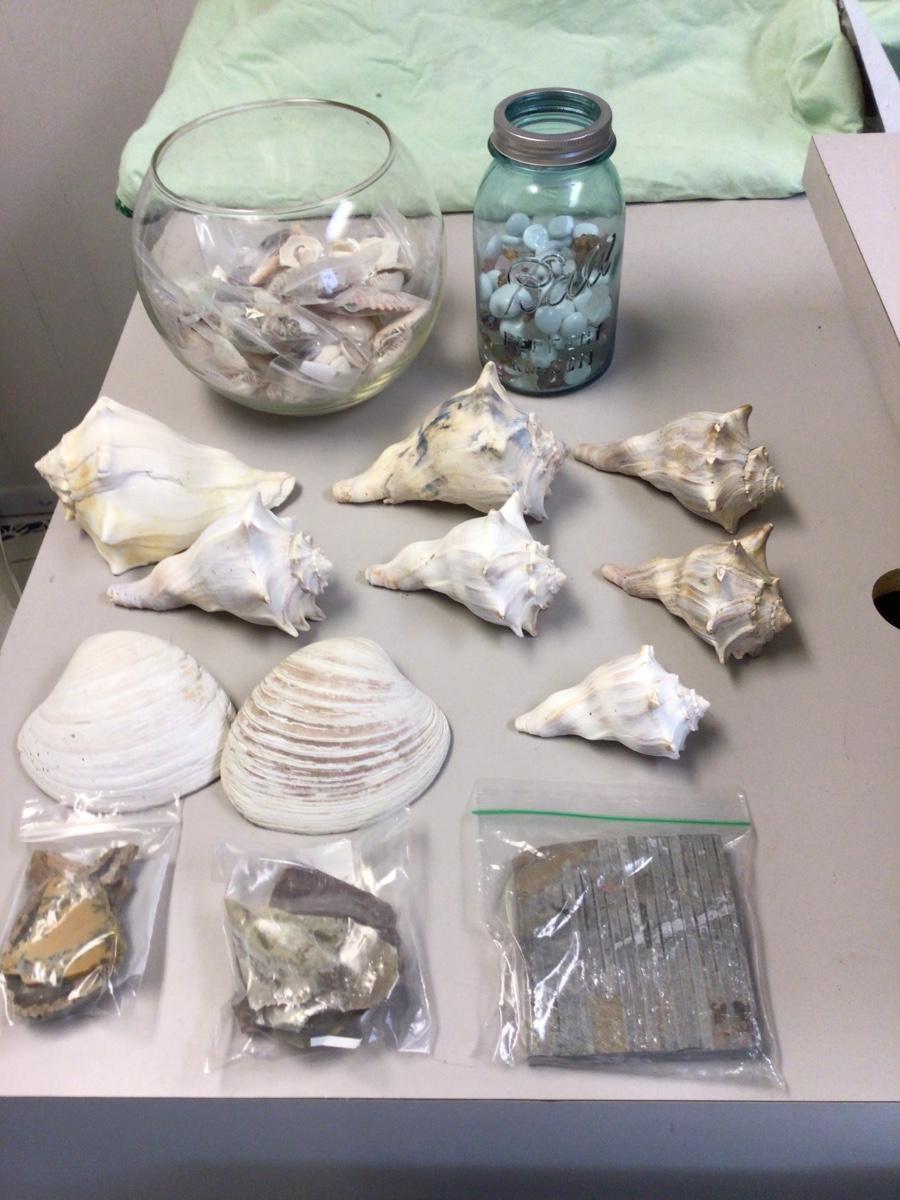 Great lot of shells, and fish bowl, and canning jar with stones.