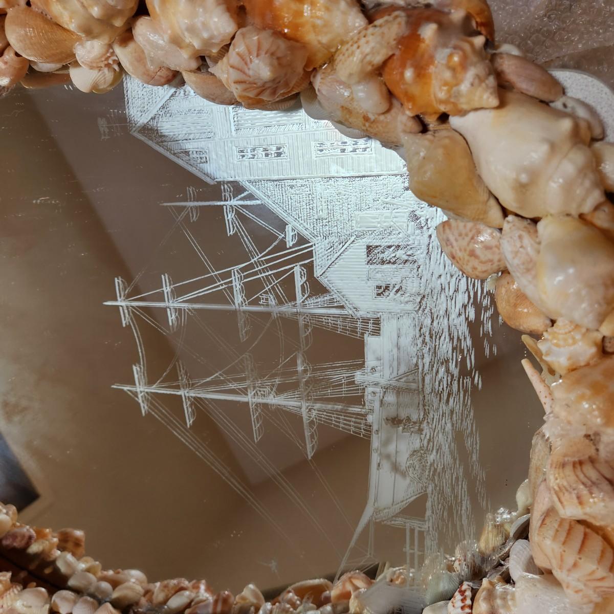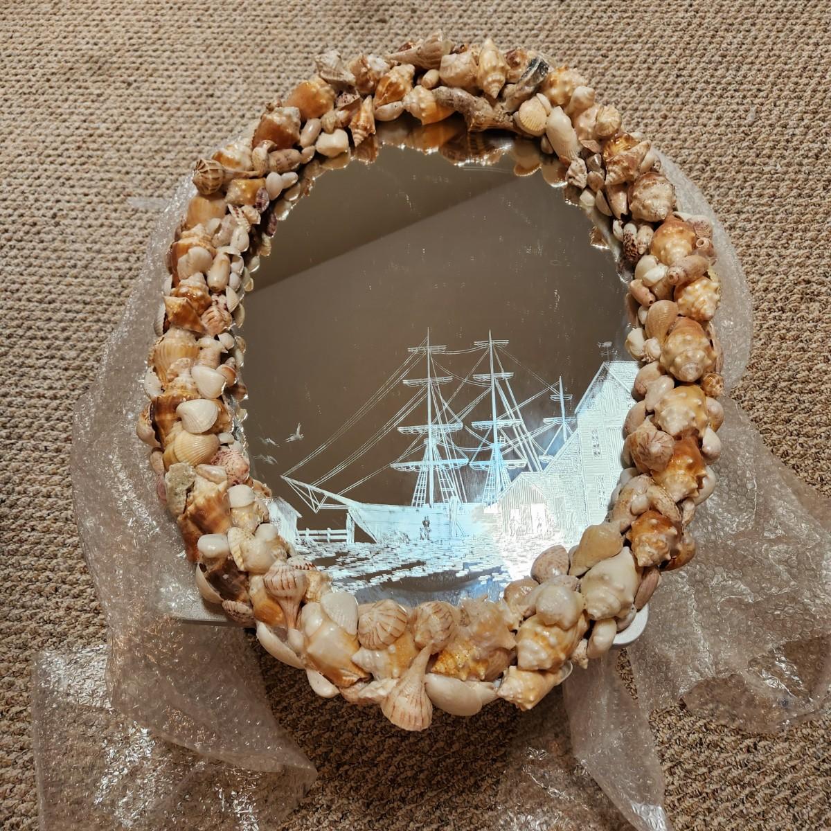 Sea Shell Mirror with Etched Seaport Scene 21"wx 26"H