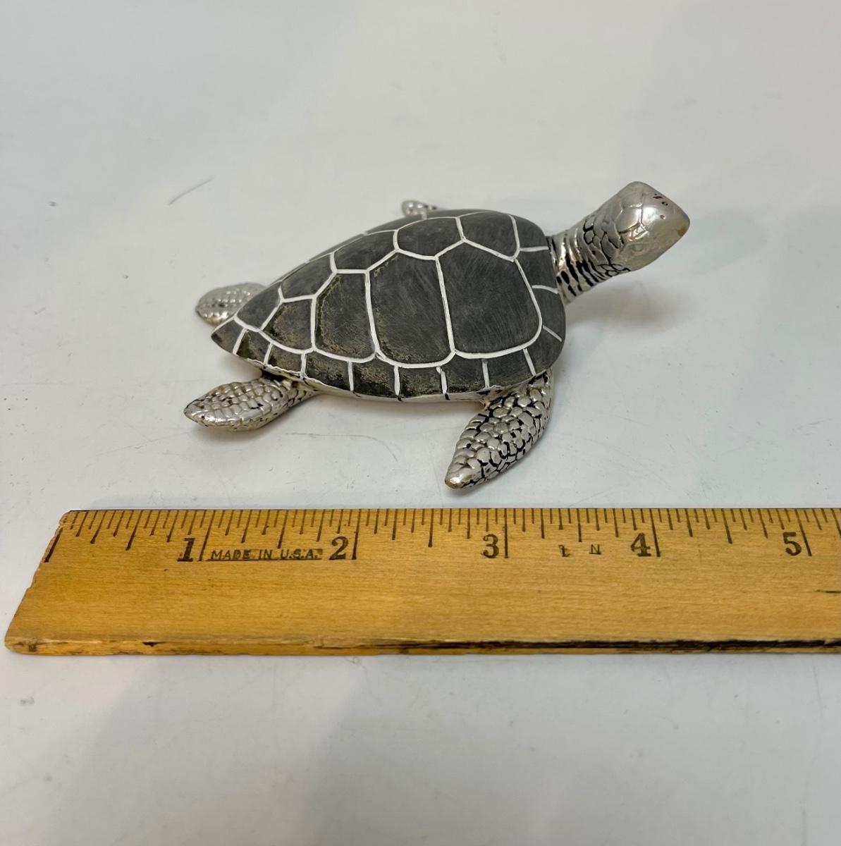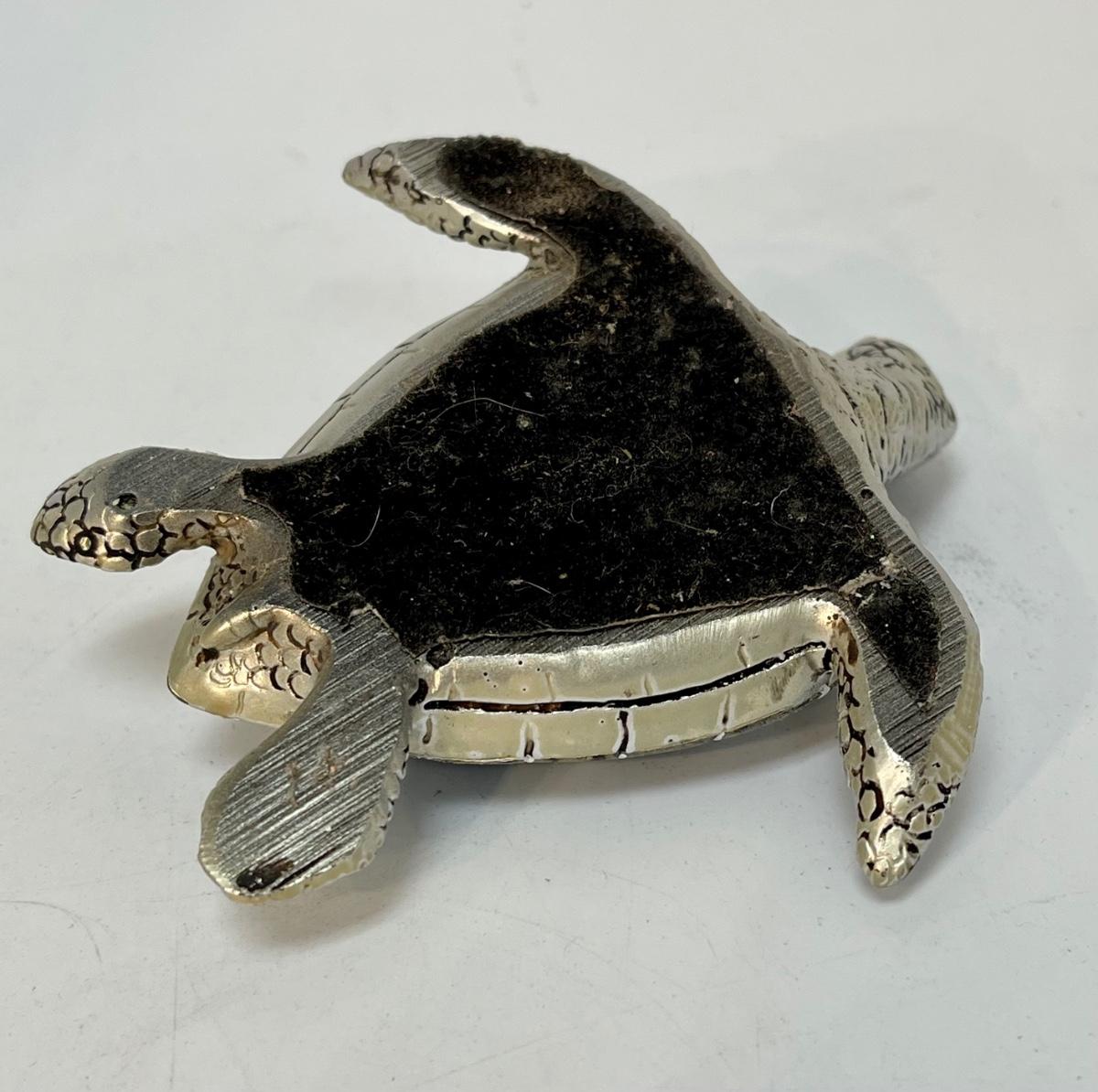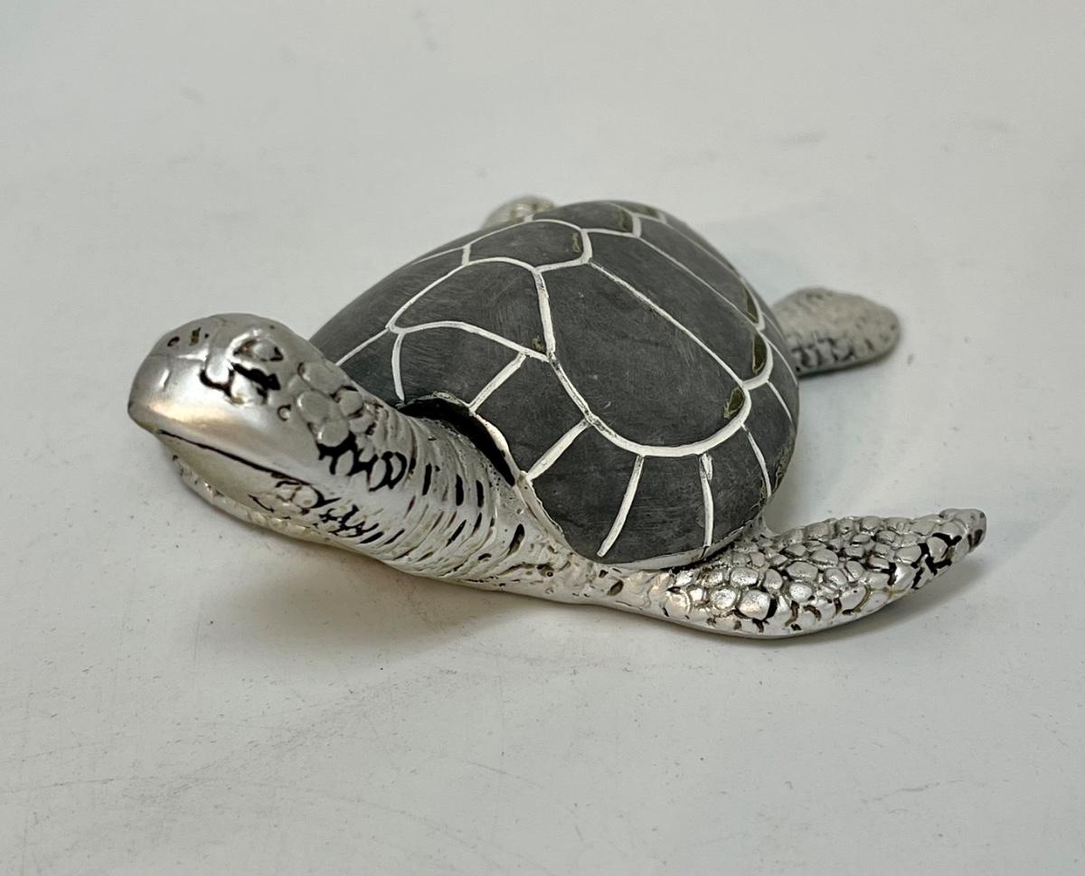 Silver Tone Metal Sea Turtle Figurine Paperweight. Good condition. About 4" size. Felted bottom.