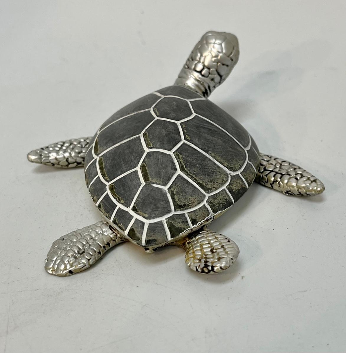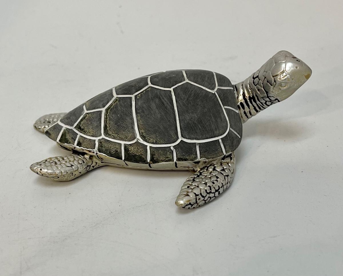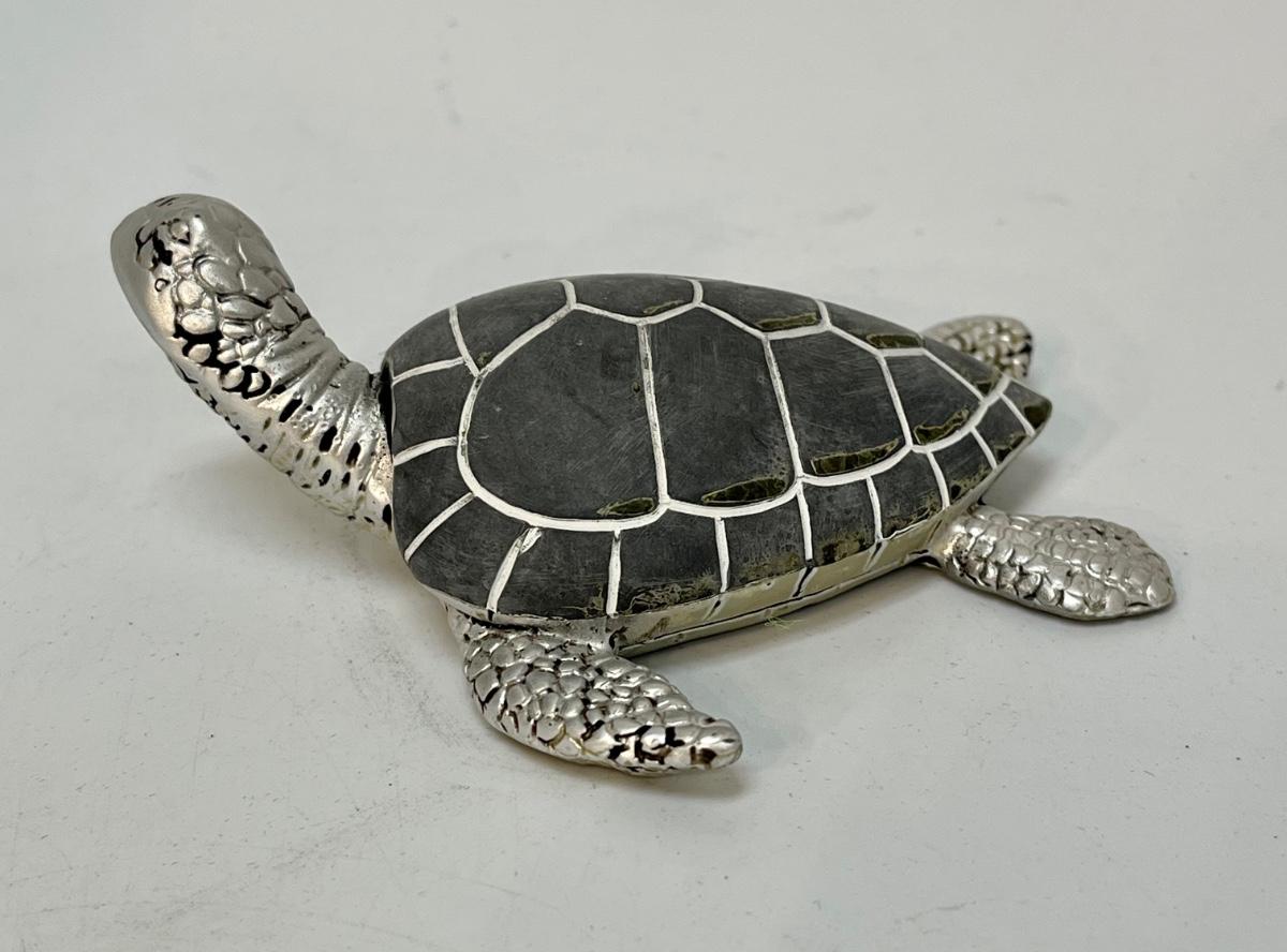 Silver Tone Metal Sea Turtle Figurine Paperweight. Good condition. About 4" size. Felted bottom.