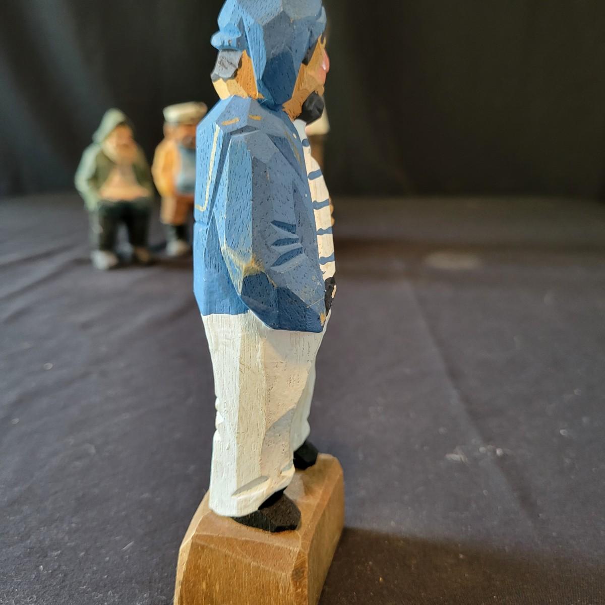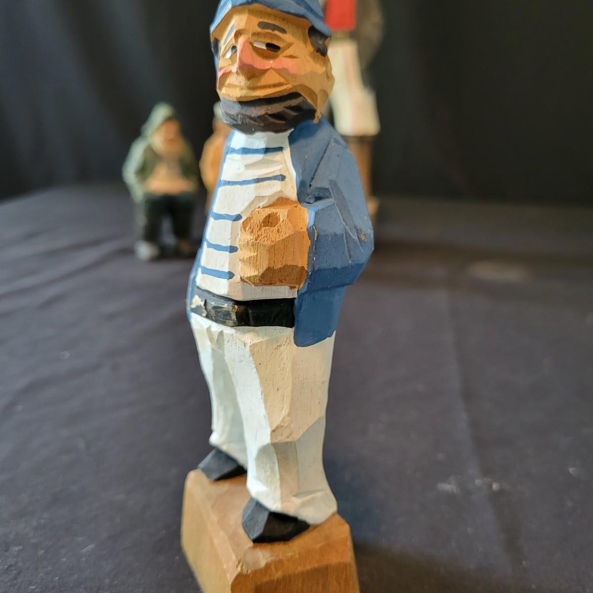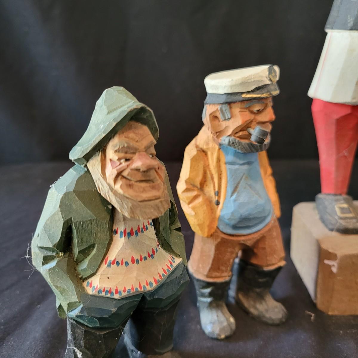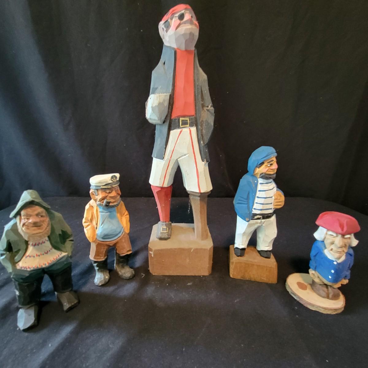 5 carving of seafarers in colorful paint schemes. None of the pieces have signatures and all are in good condition. Largest carving is approximately 12" tall. Shipping available